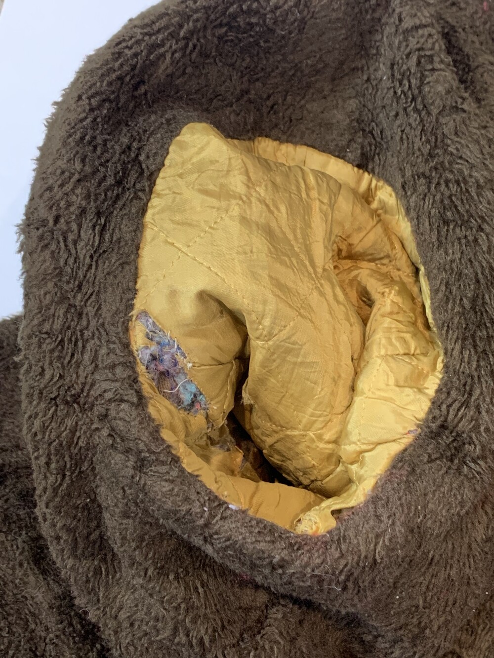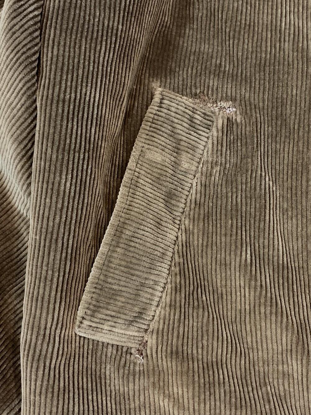 소매 안감 헤짐, 겉감 데미지, 단추 교체 등 전반적으로 사용감이 있는 제품.
