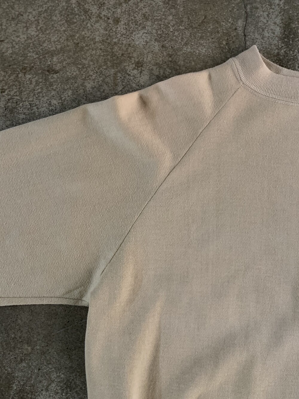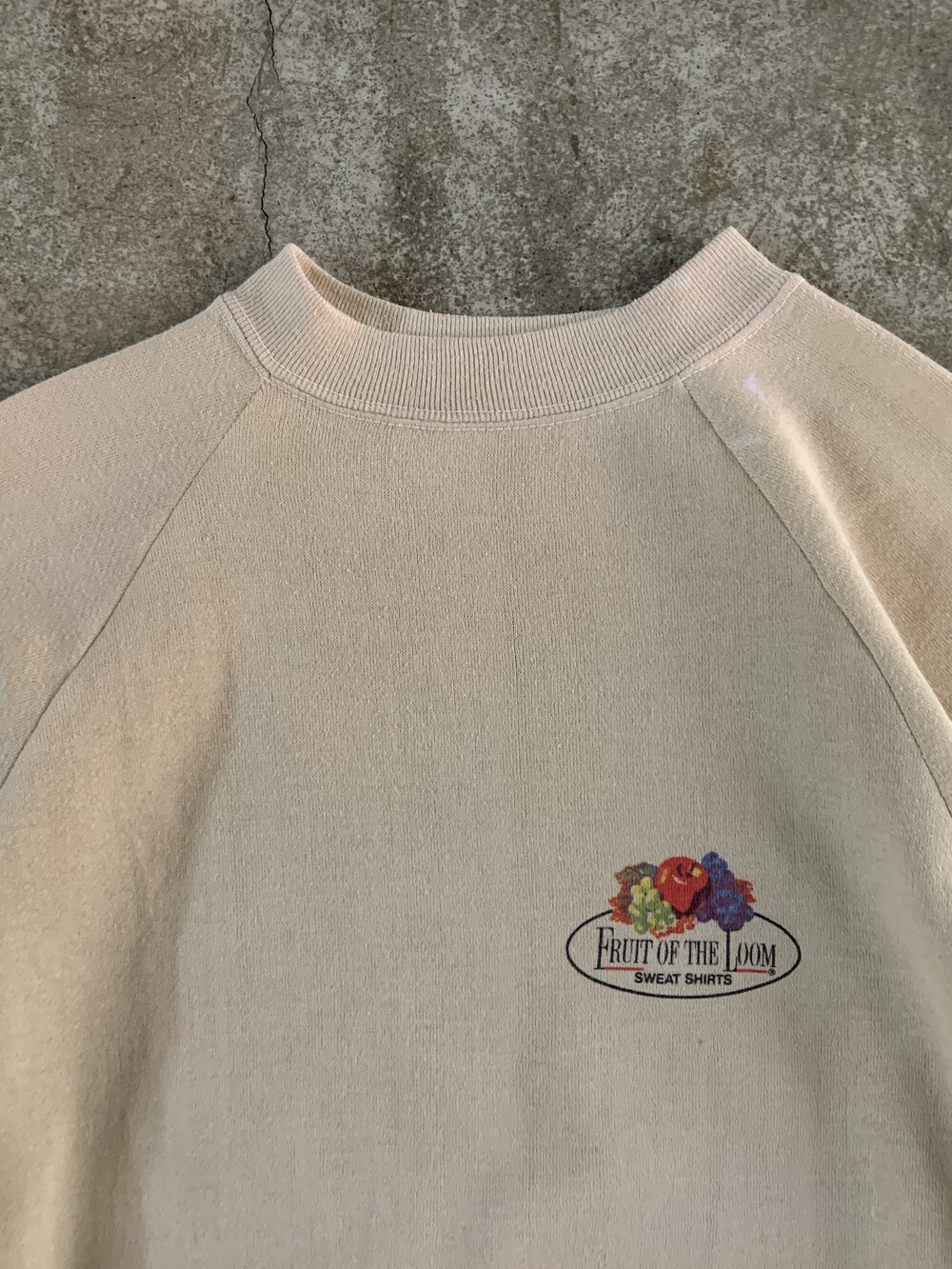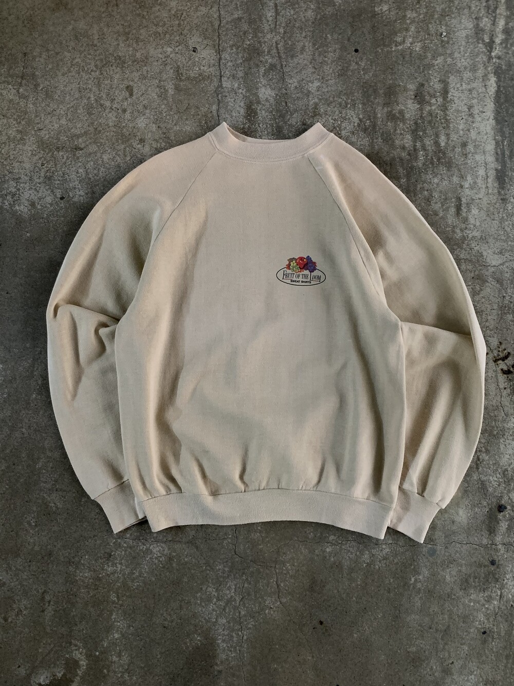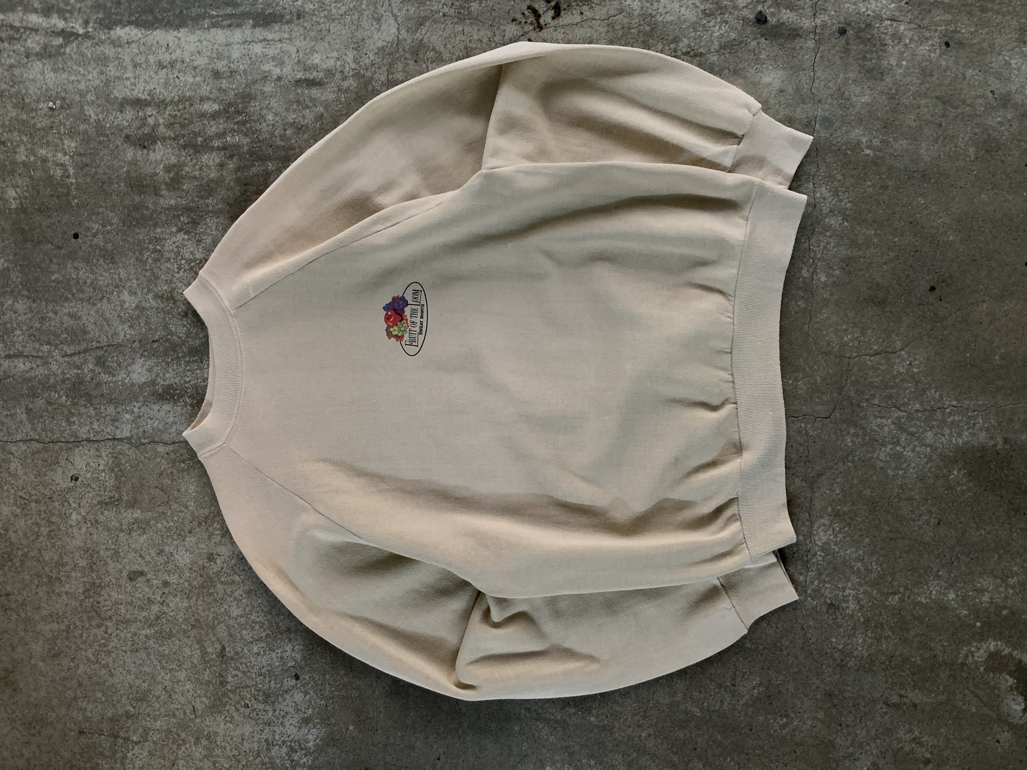 🚩Detail 1960년대에서 70년대 사이에 사용하던 프룻오브더룸 로고가 정체불명의 바디에 올려진 스웻셔츠. 이너 플리스가 거의 없다 싶을정도로 얇고 가벼워 50/50 혹은 코튼 함량이 적은 튜블러 타입 스웻셔츠 바디로 추정되며 로고와 함께 프린팅된 스웻셔츠 표기 역시 독특한 제품입니다. 래글런 슬리브임에도 불구하고 암홀 너비가 어느 정도 있어 표기에 비해 여유로운 피팅감을 보이는 제품으로, 상의 100호 전후로 착용하는 분들에게 권장드립니다.