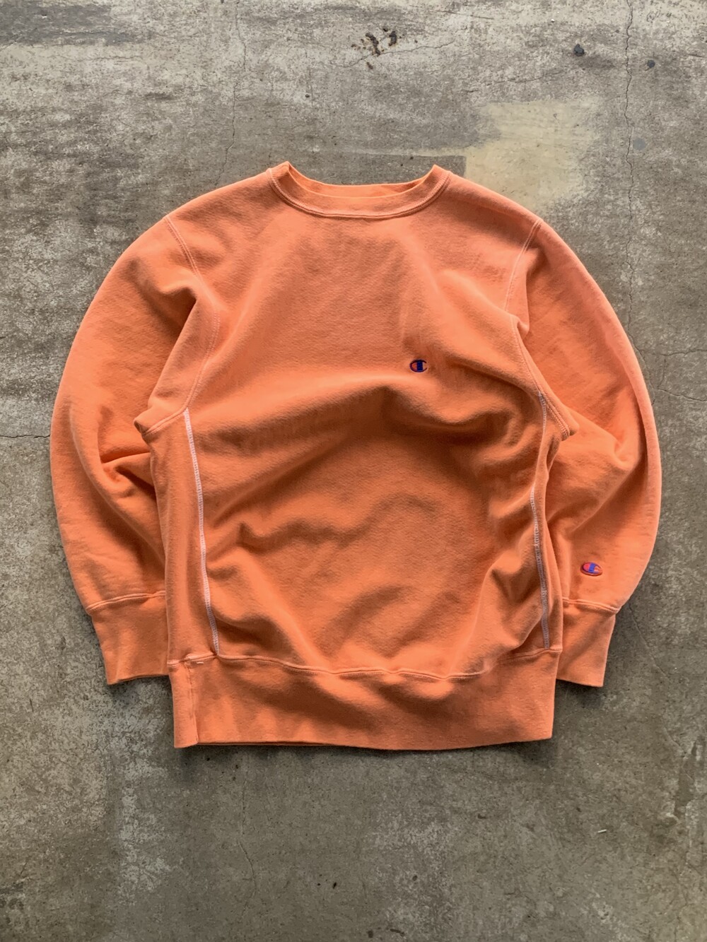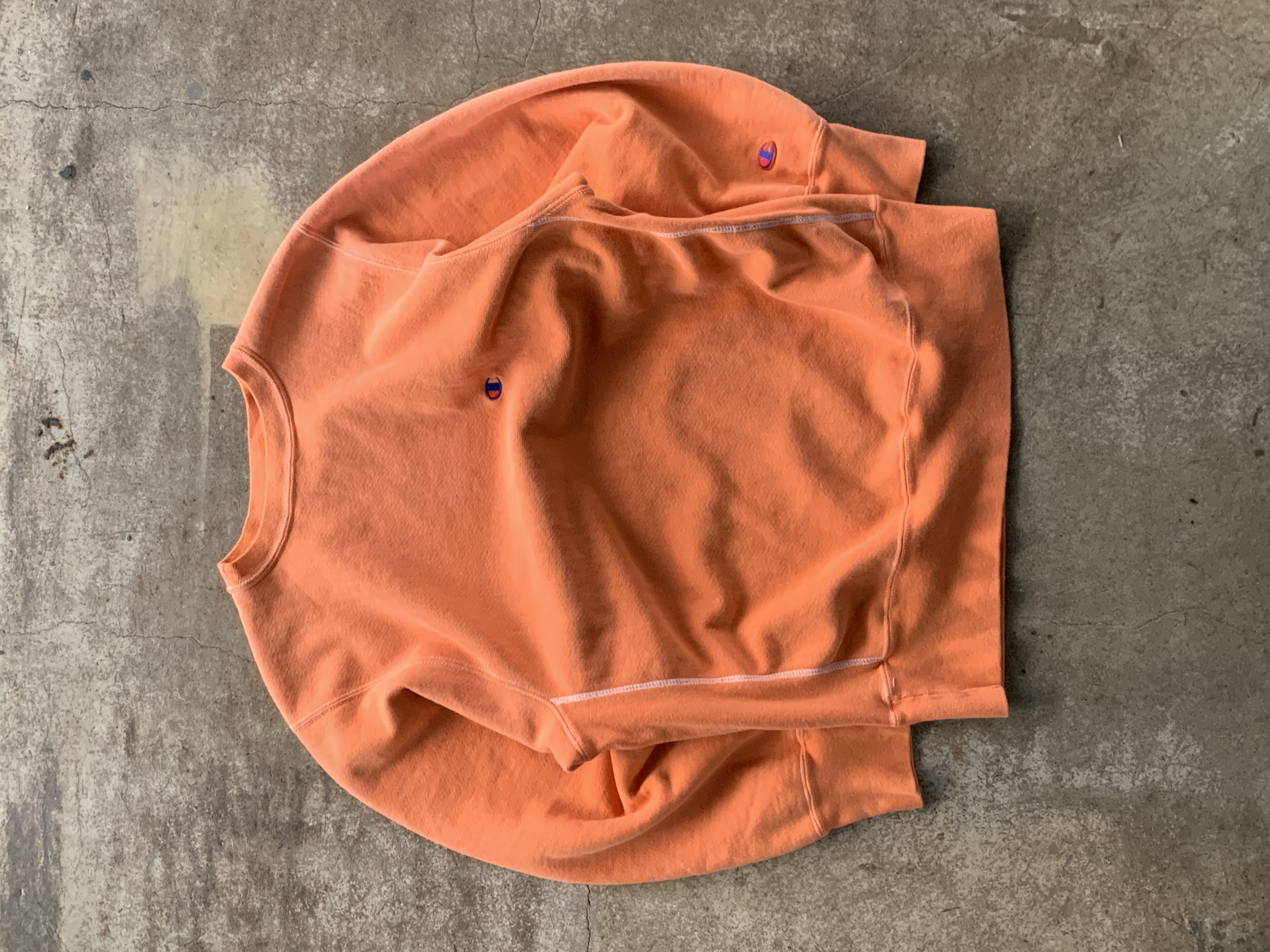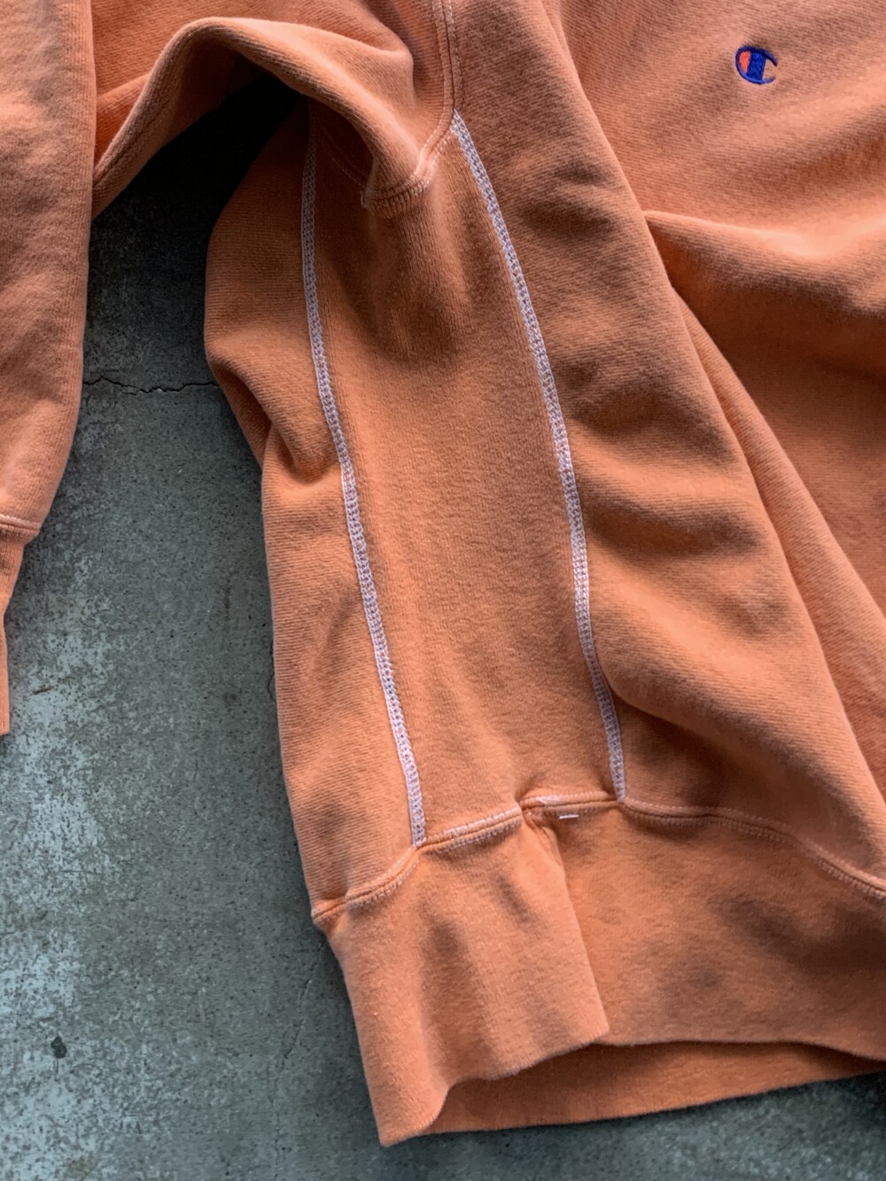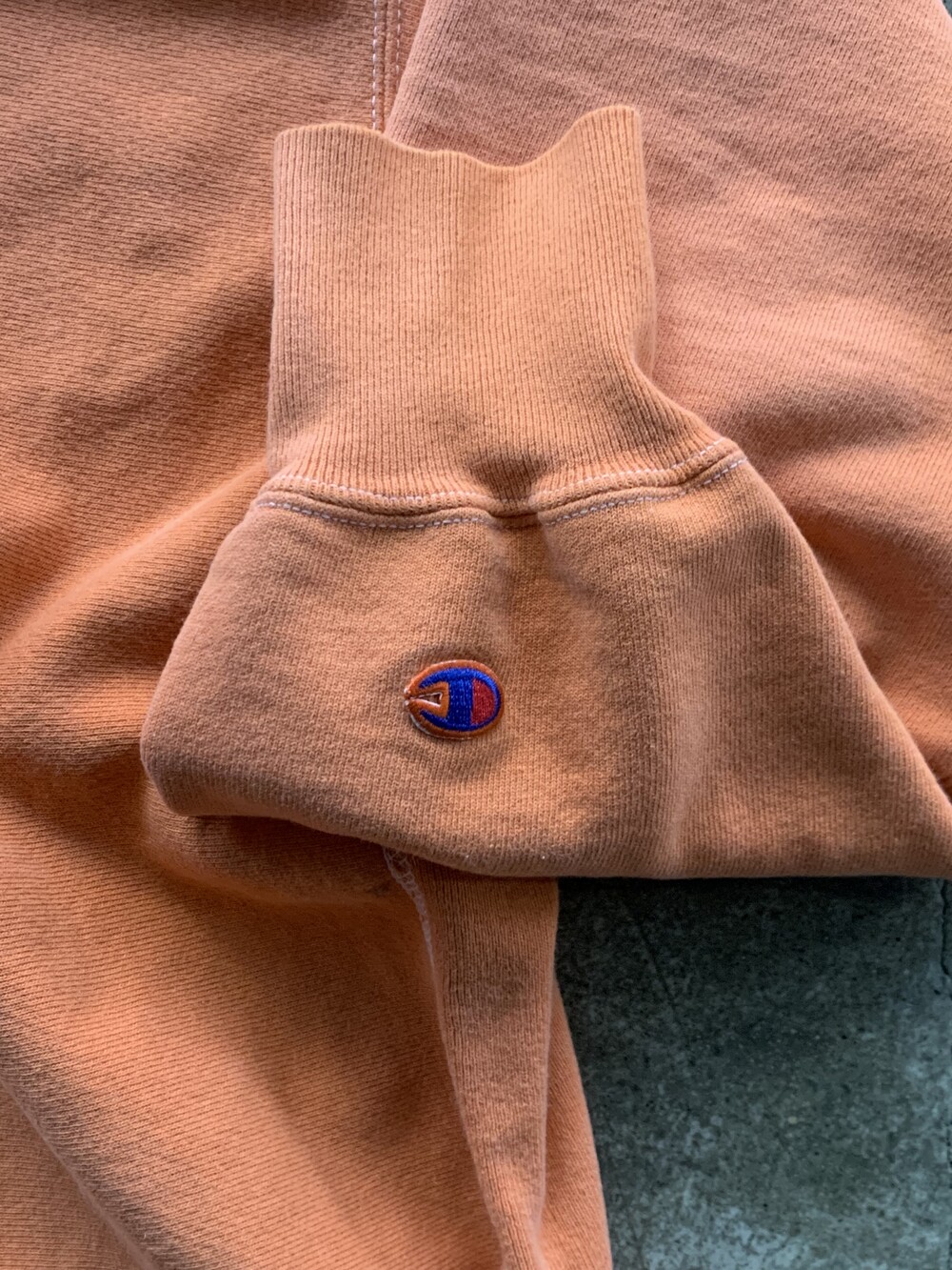 몸판과 소매에 C로고가 올려진 가장 기본적인 형태로, 제작 과정에서 원단을 오렌지 컬러로 오버다잉을 거친 이후에 직조택과 하단부 폴리소재 택이 붙어 출시된 것으로 추정되는 제품입니다. 뚜렷한 선페이드는 아니나 전반적으로 은은하게 희끗한 색상을 보여 코랄빛이 섞인듯한 오렌지 컬러 색상이 돋보이는 제품입니다.