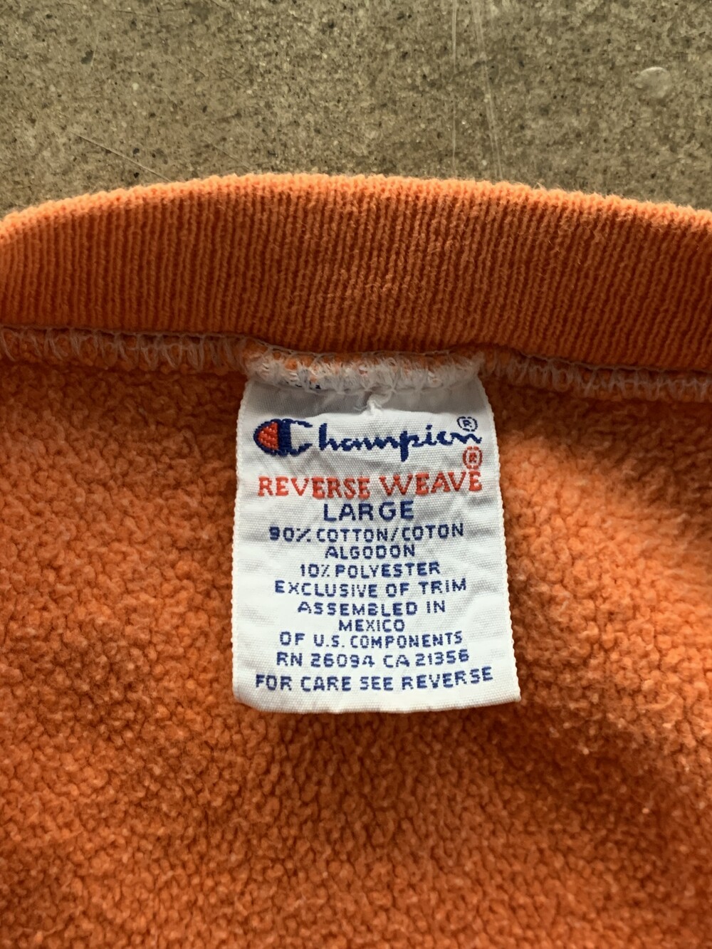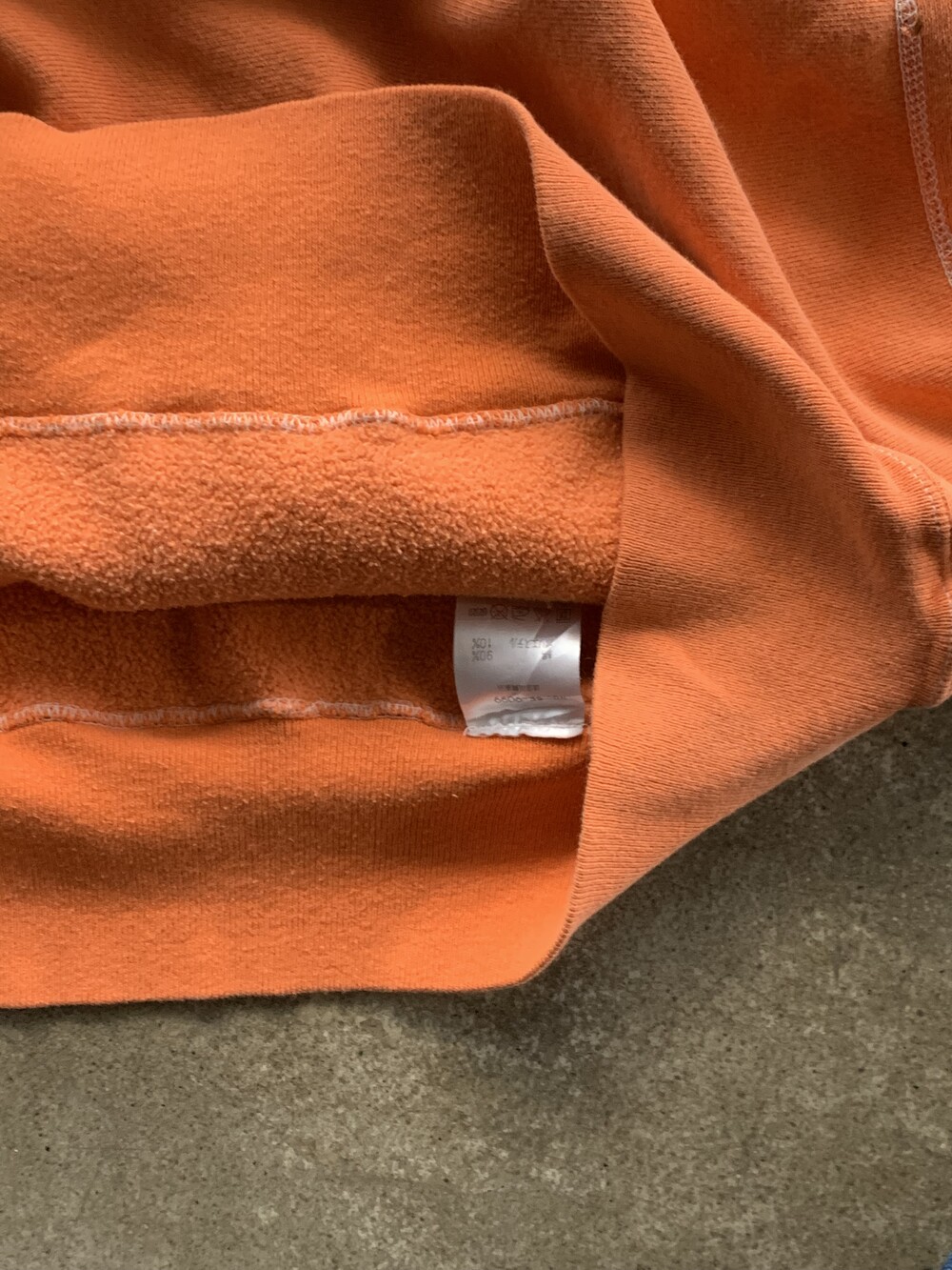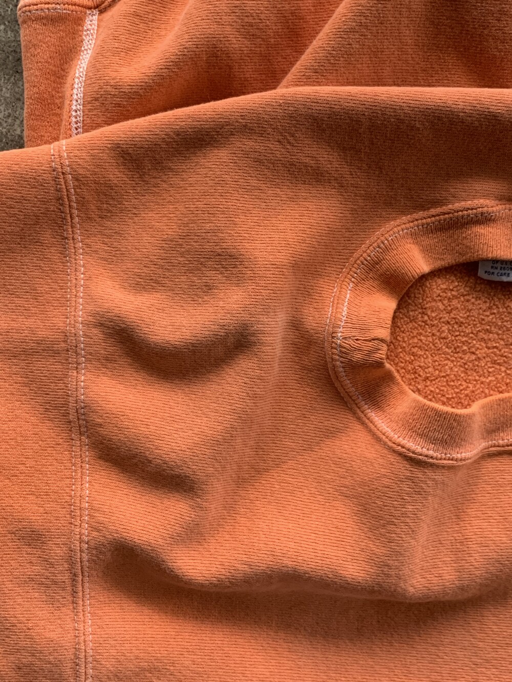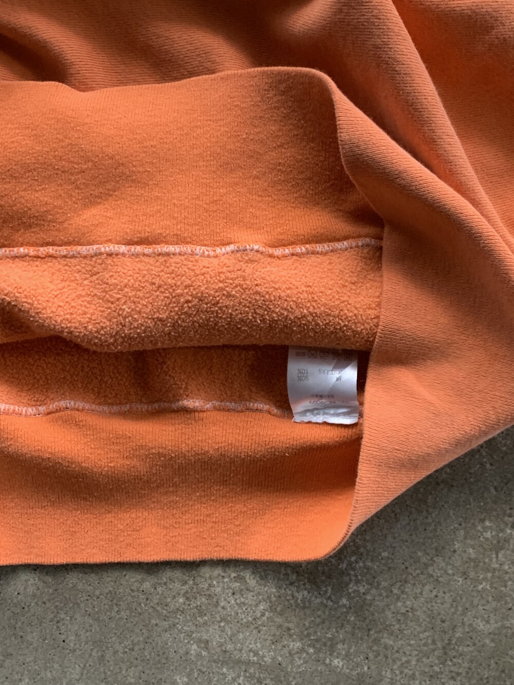 몸판과 소매에 C로고가 올려진 가장 기본적인 형태로, 제작 과정에서 원단을 오렌지 컬러로 오버다잉을 거친 이후에 직조택과 하단부 폴리소재 택이 붙어 출시된 것으로 추정되는 제품입니다. 뚜렷한 선페이드는 아니나 전반적으로 은은하게 희끗한 색상을 보여 코랄빛이 섞인듯한 오렌지 컬러 색상이 돋보이는 제품입니다.