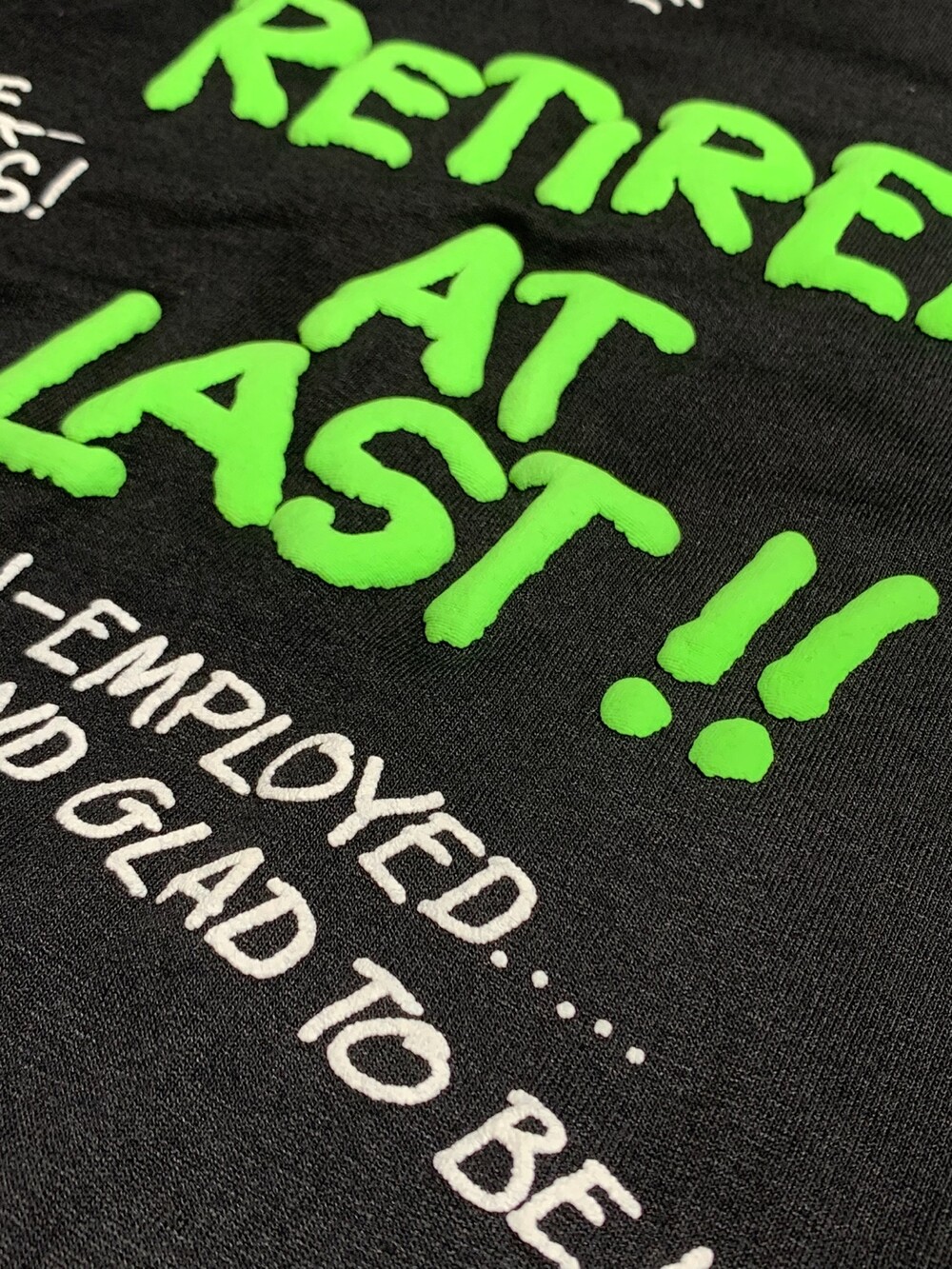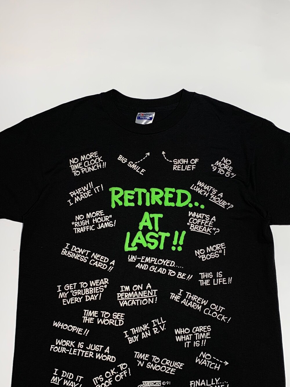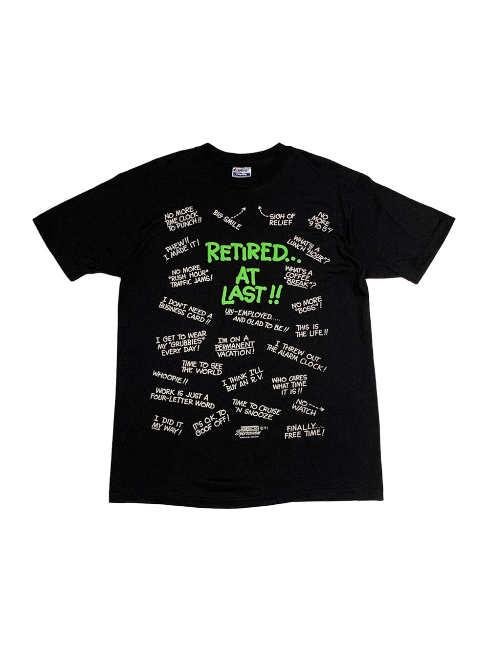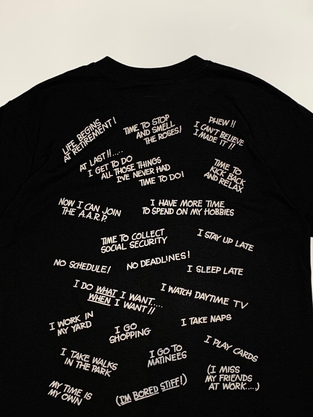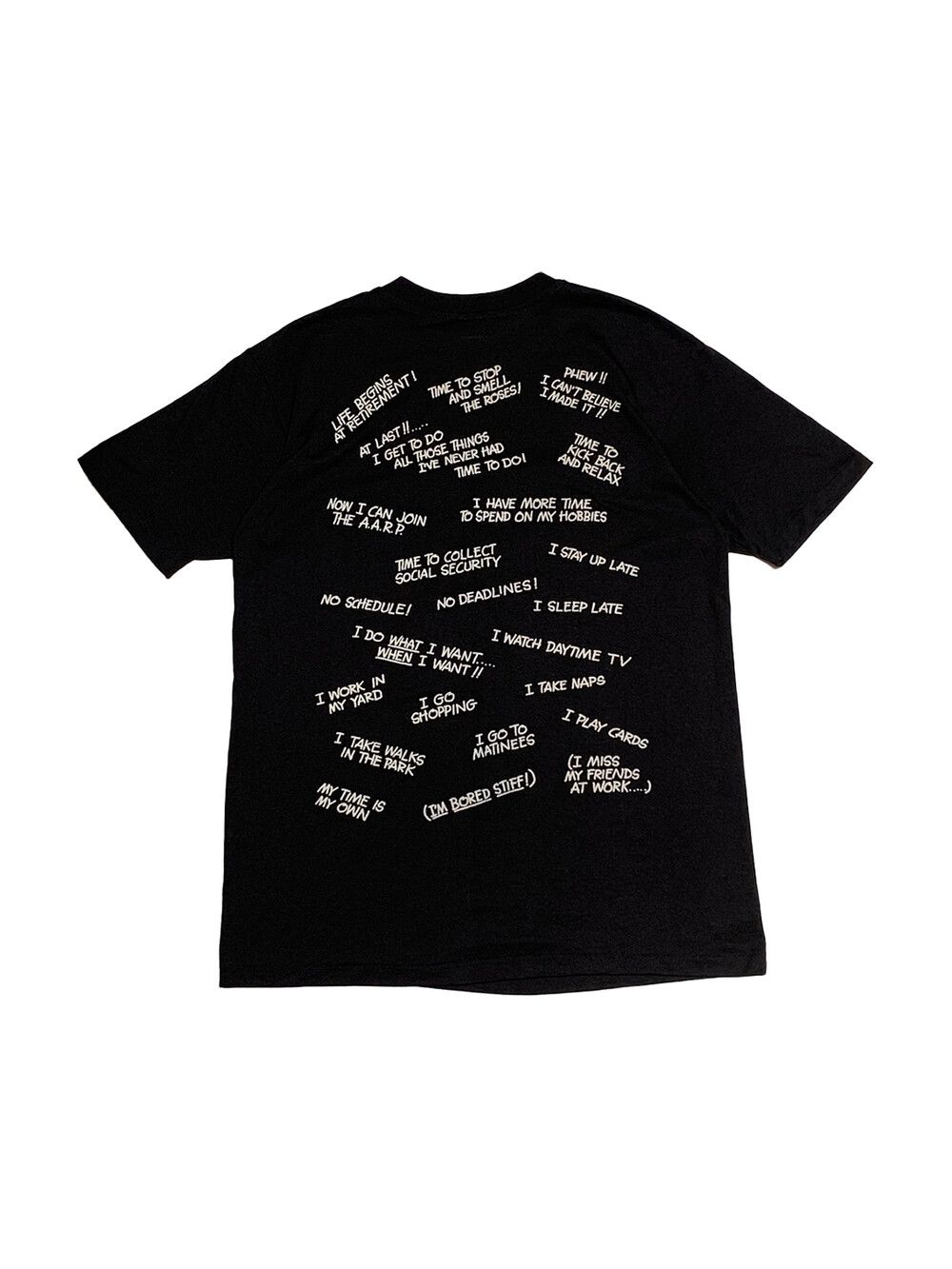 얇고 가벼운 폴리&코튼 혼방 원단 티셔츠 위에 은퇴를 선언함과 동시에 직장이 없는 삶에 대한 반응과 기대로 티셔츠를 가득 메운 프린팅이 돋보이는 제품입니다. 두께감이 어느정도 있어 입체감이 있는 프린팅으로 건조기 사용은 권장드리지 않습니다.