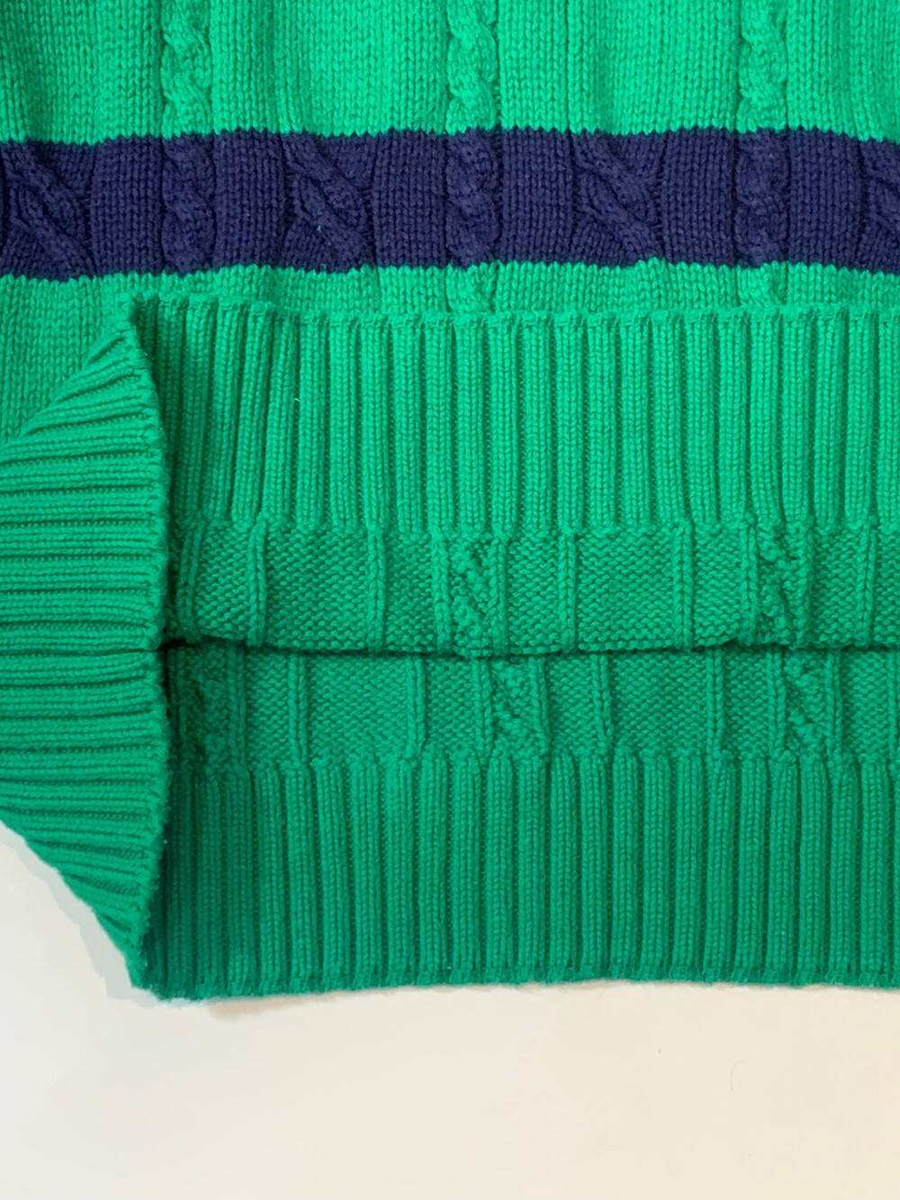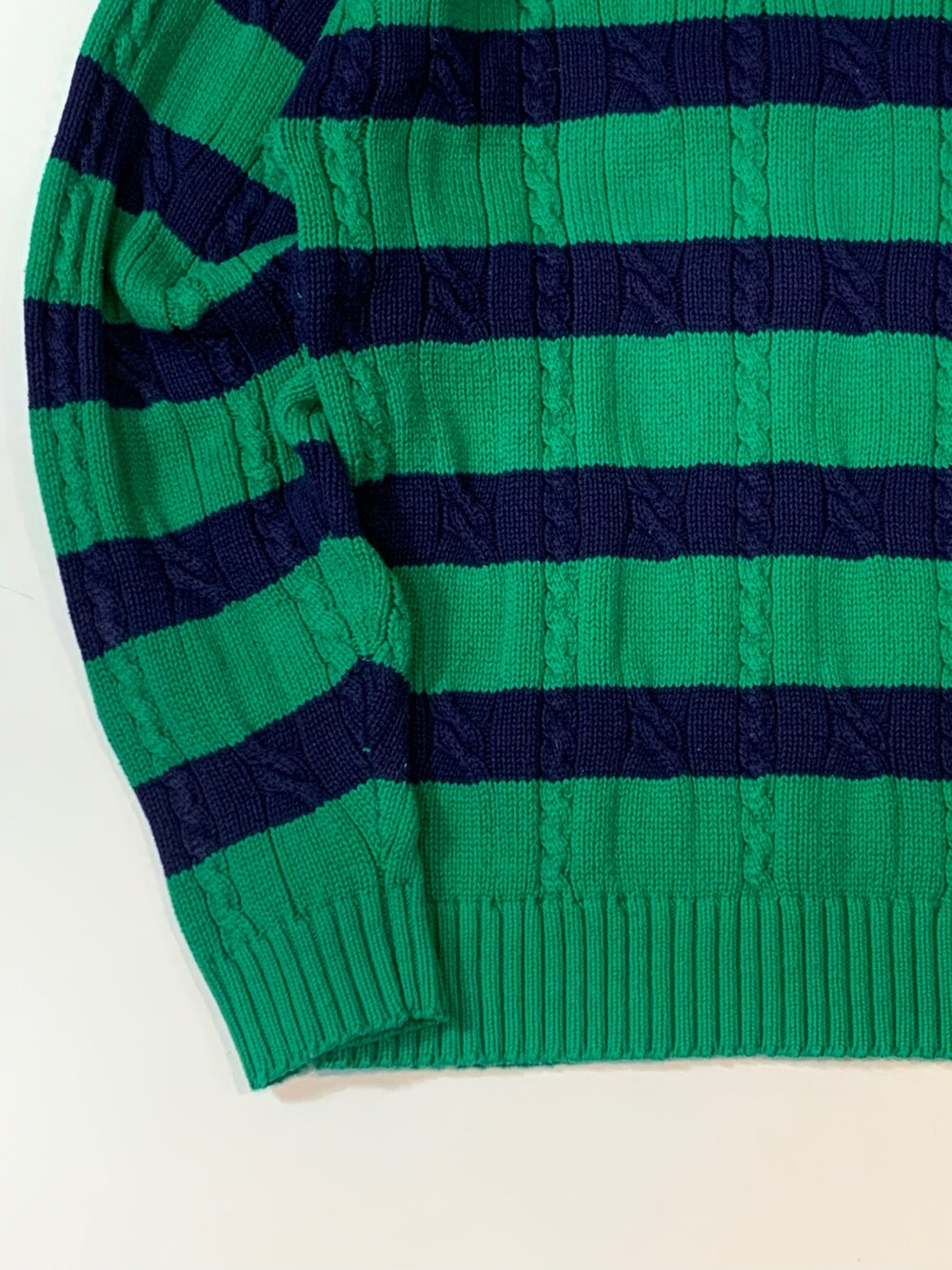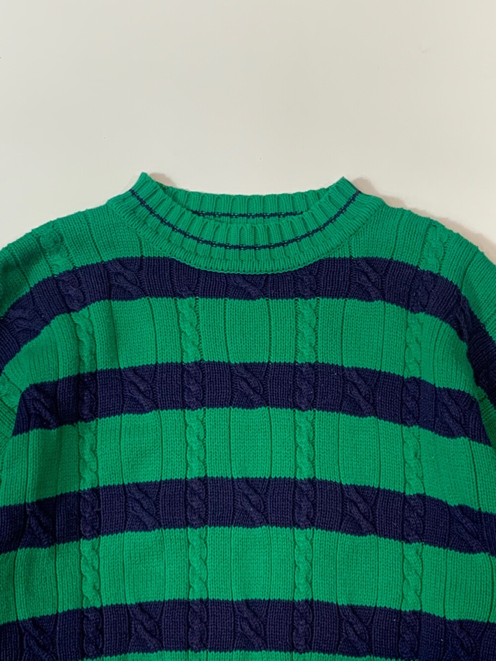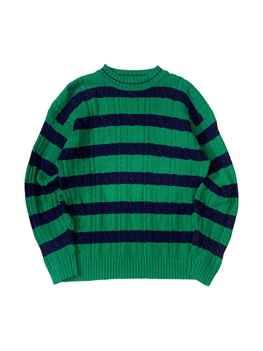어깨 부분 프레임만 단단하게 짜여지고 나머지 부분은 축 처지고 쉽게 늘어나기도 해 착용했을 때 루즈한 핏이 매력적인 코튼 니트 스웨터. 그린 & 네이비 스트라이프 배색에 케이블 짜임이 들어가는 클래식한 구성으로, 단품 뿐만아니라 티셔츠, 옥스포드 클로스 셔츠, 스웻후디 등과 레이어드해서 착용해도 좋을만한 제품입니다.