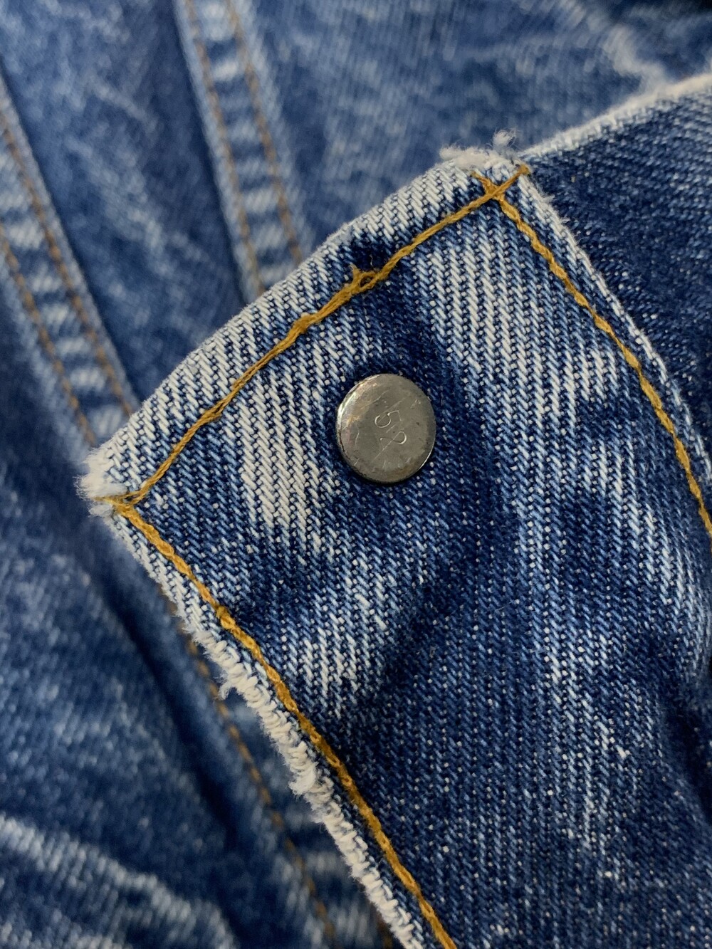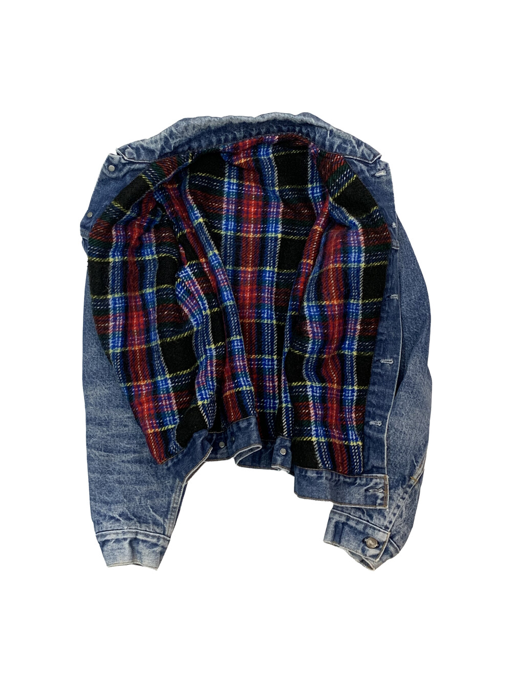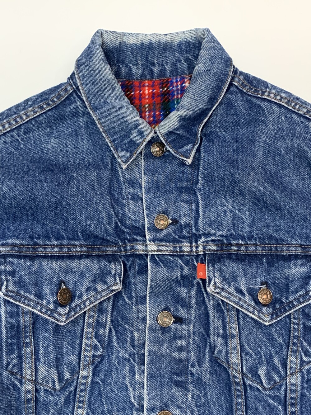 흔치 않은 플래드 체크 패턴의 두툼한 라이닝이 붙은 리바이스 4세대 데님 트러커 자켓. 블랭킷 안쪽에 택이 붙어 모델명은 확인할 수 없으나 전반적인 비례감은 70505 모델로 추정됩니다. 52 버튼 각인이 붙은 1970년대 미국 생산 제품으로, 페이딩으로 인한 소매 부분 색상 차이를 제외하면 비교적 균일한 색상을 보이는 제품입니다.