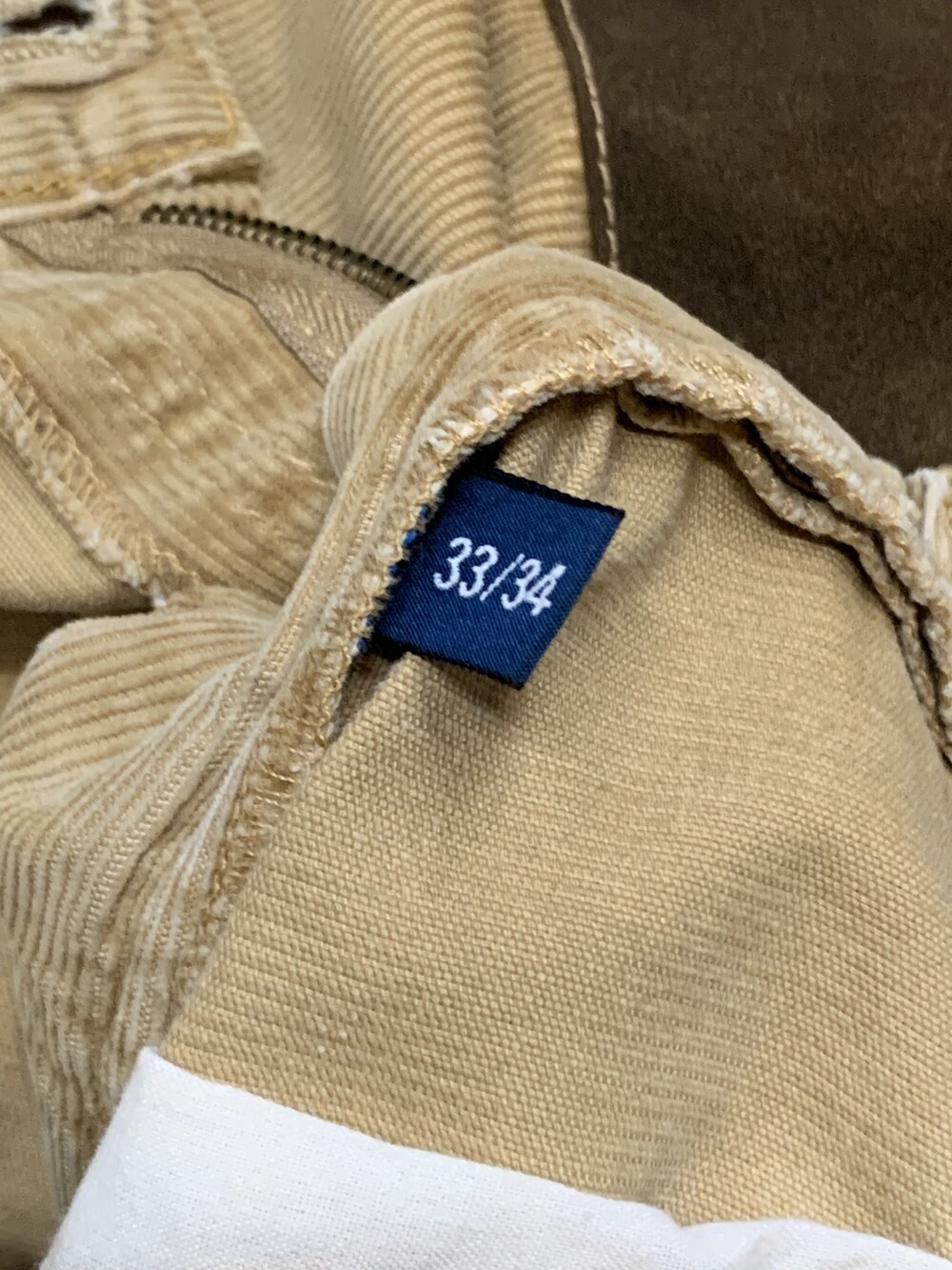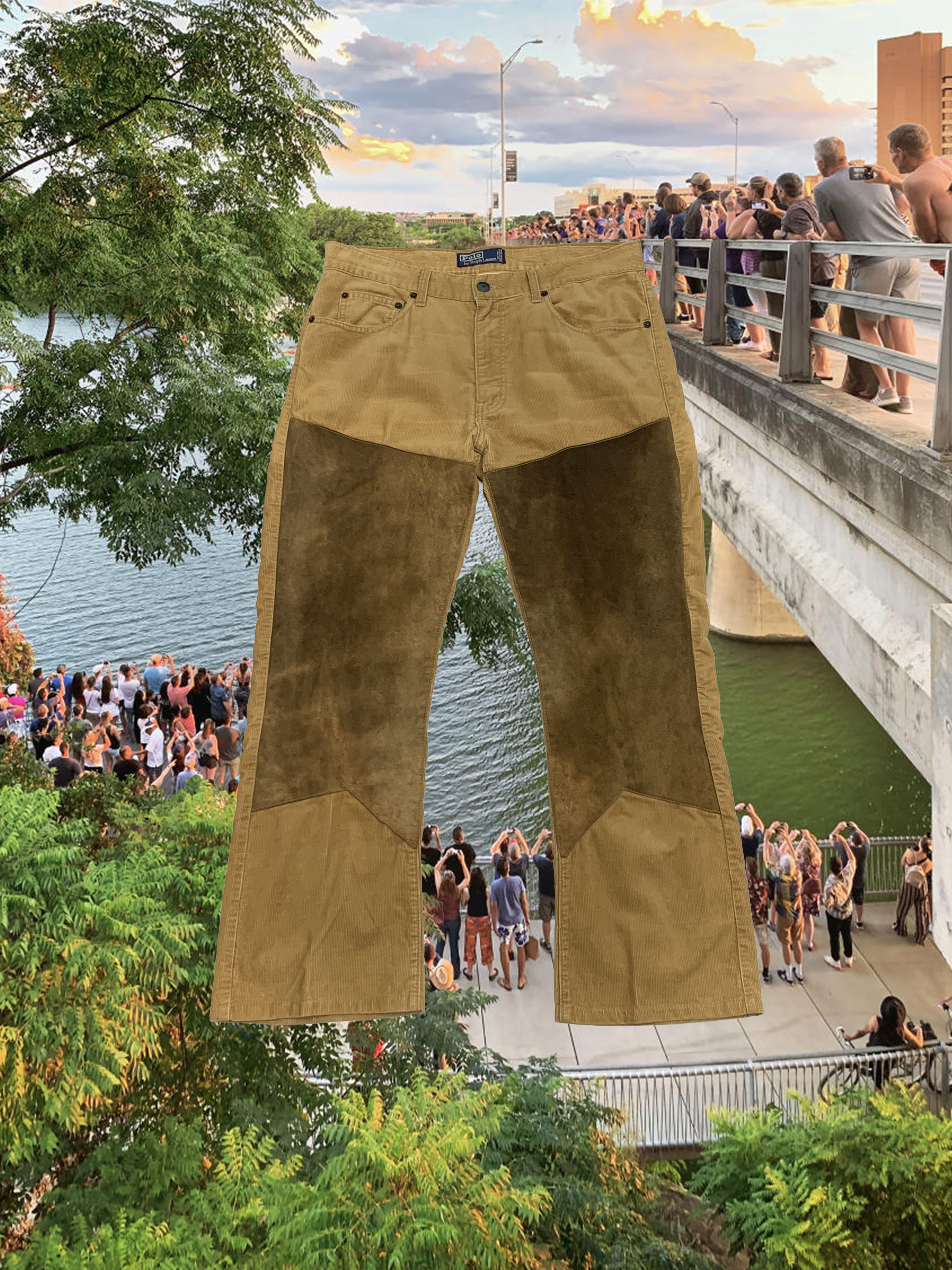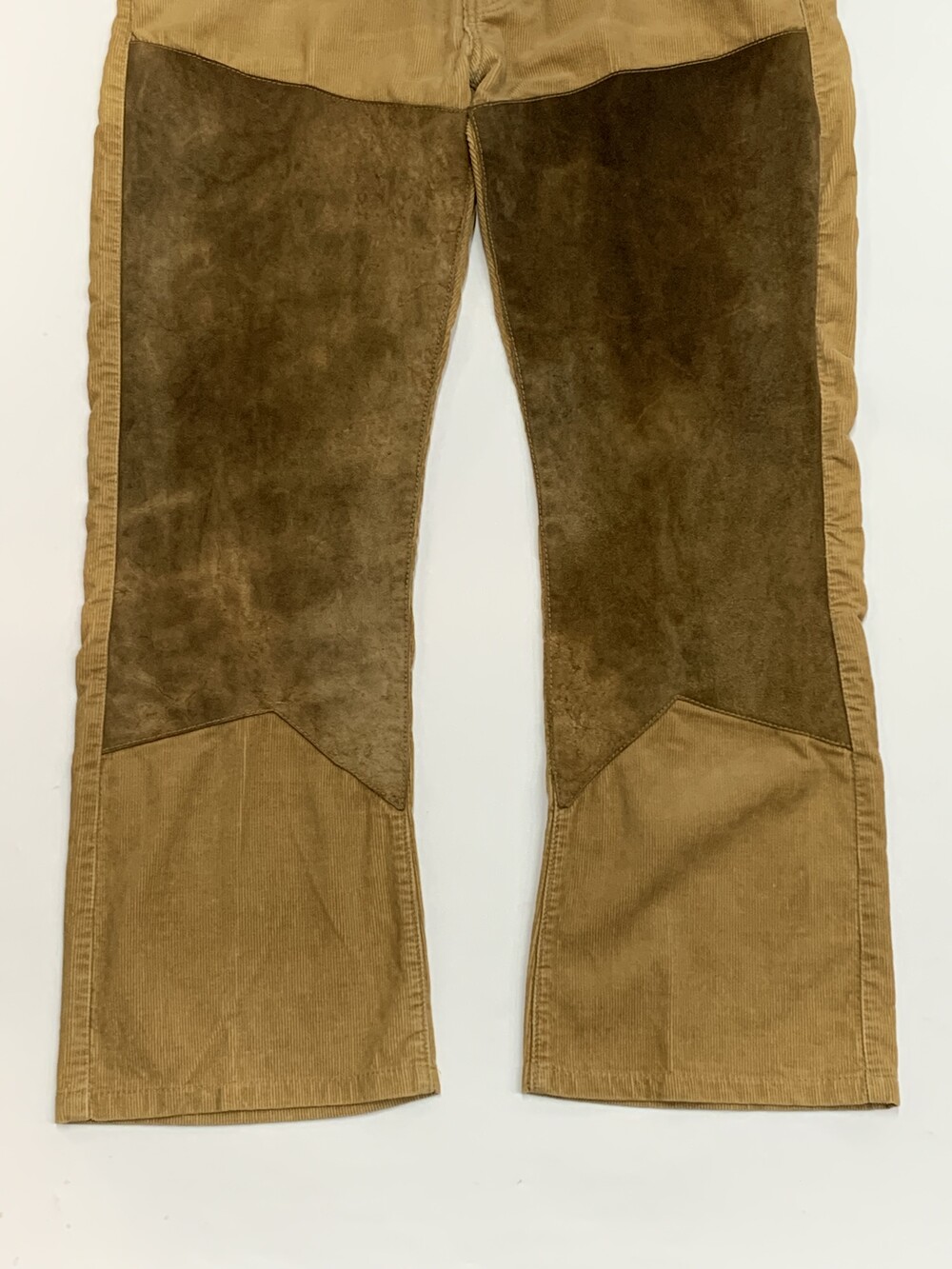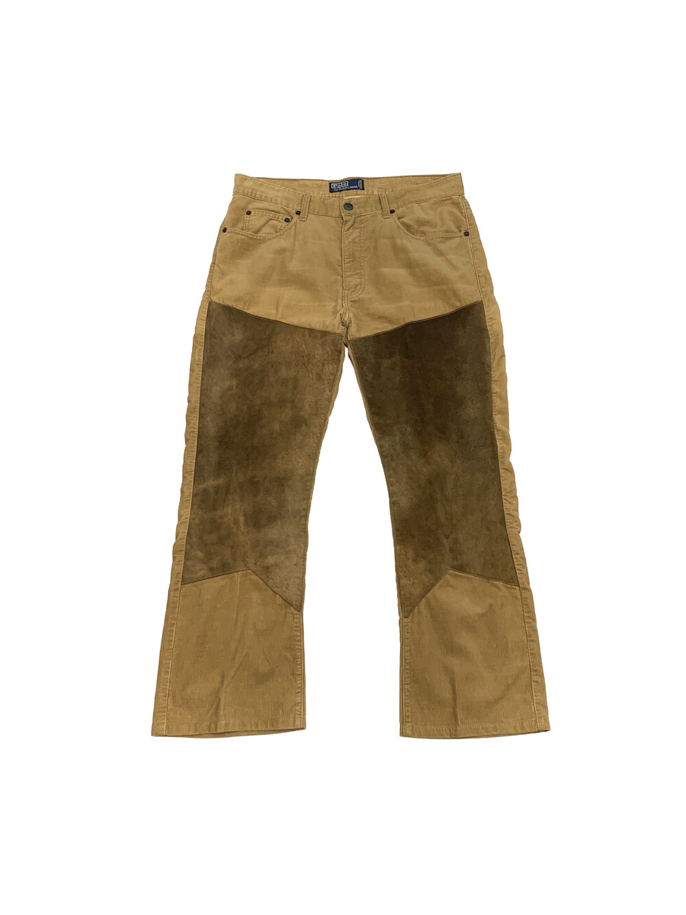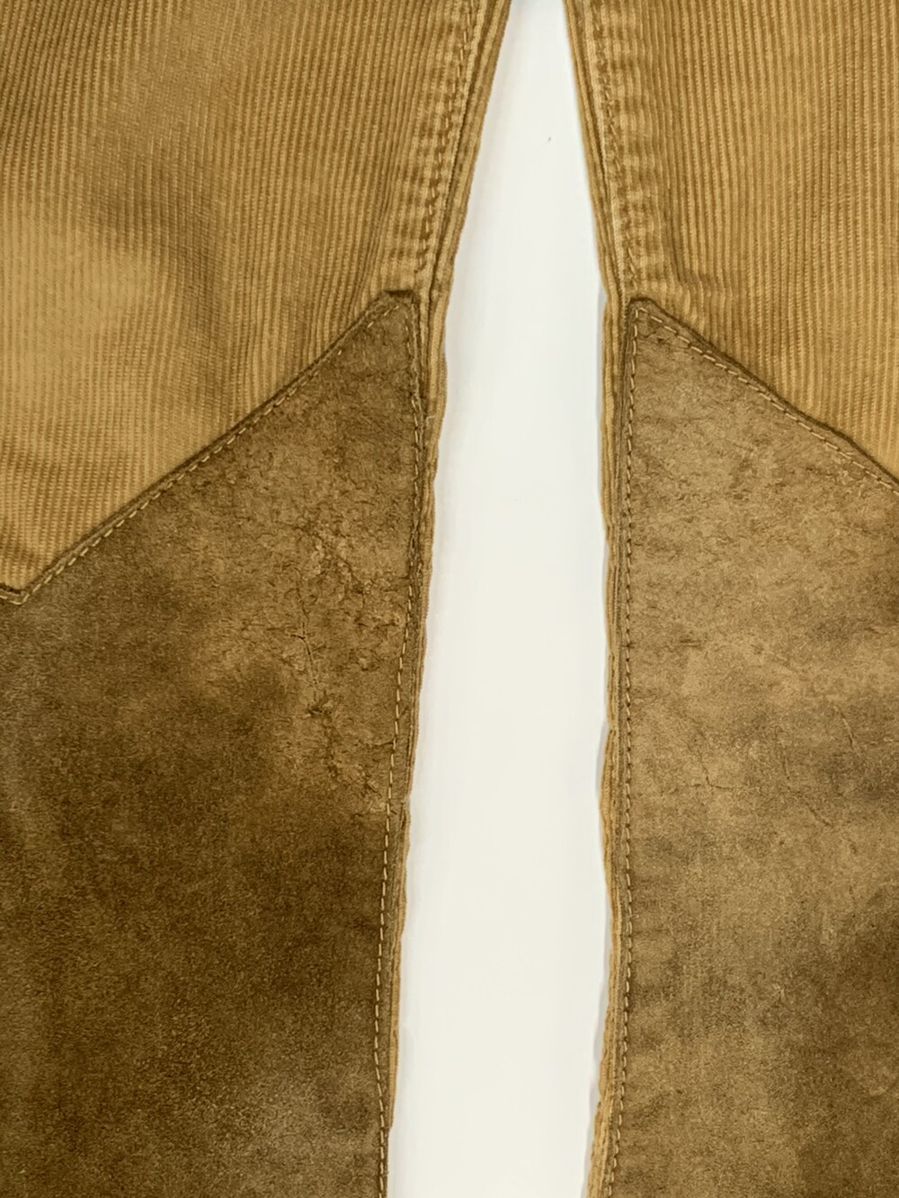 더블니 디테일이 트라우저보다는 팬츠에 어울릴만한 요소이다보니, 5포켓 사양의 얇은 코듀로이 팬츠 위에 가죽 패널을 덧대고 부츠컷 실루엣으로 변주를 준 폴로 랄프로렌의 코듀로이 더블니팬츠. 밑단 기장 길이가 수선되었으나 부츠컷 실루엣이 유지되어 적당한 기장감으로 착용할 수 있을만한 제품입니다.