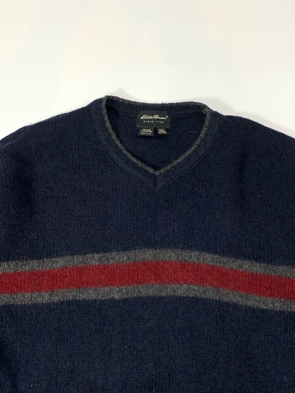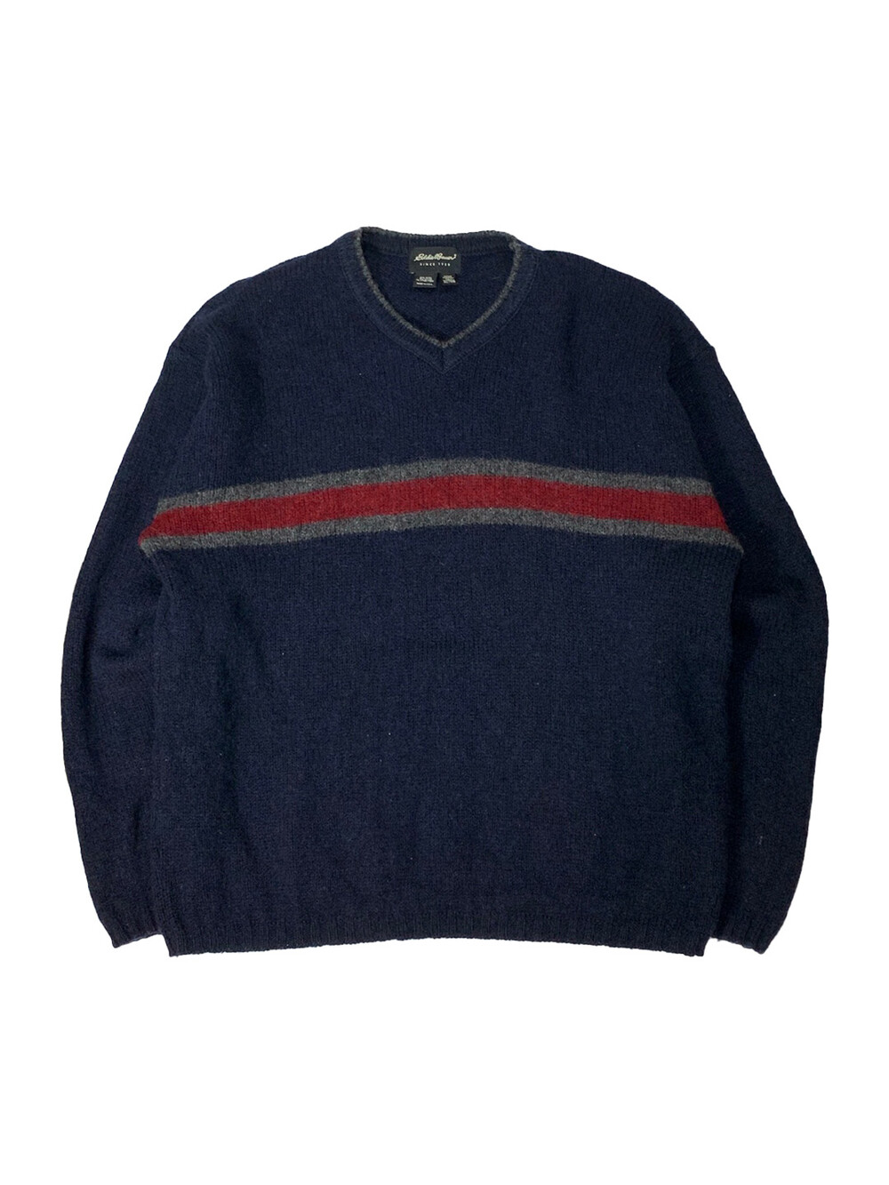 1990년대 후반부에 생산된 에디바우어의 브이넥 니트입니다. 스웨터라 할 수 있을만한 적당한 두께, 전면과 후면 가로 스트라이프, 여유로운 사이즈 등으로 캐주얼하게 활용하기 좋을만한 제품입니다.