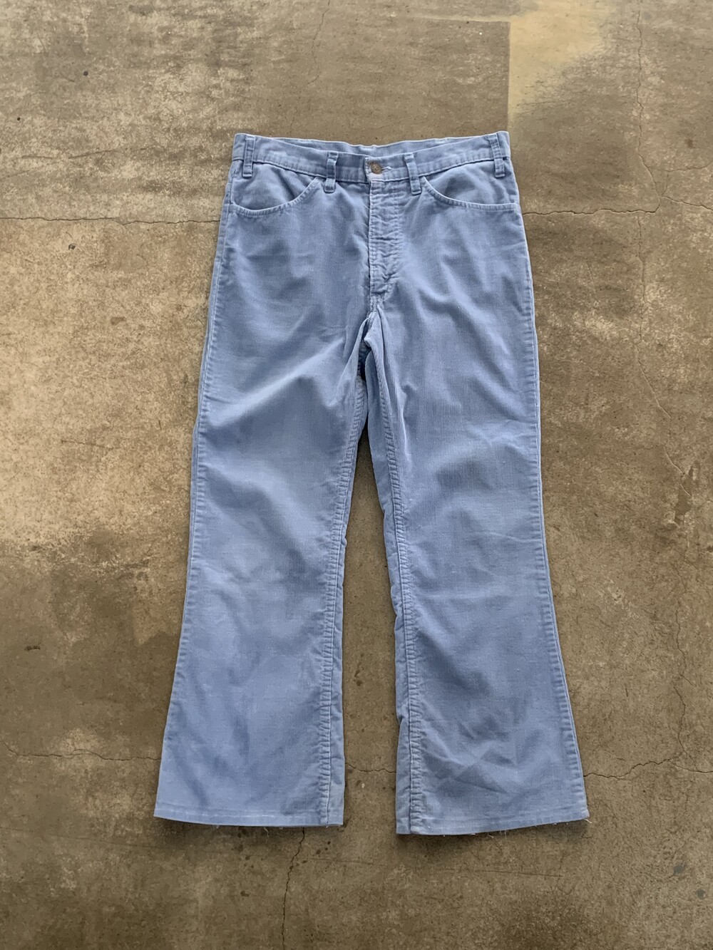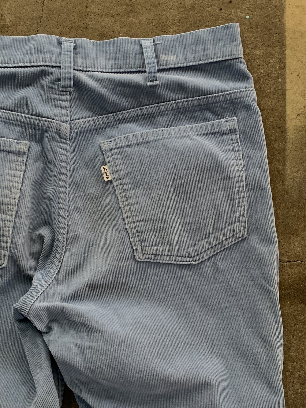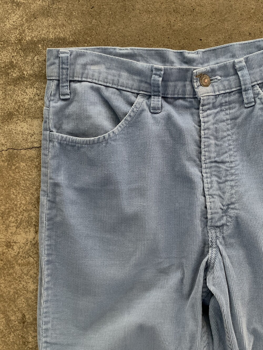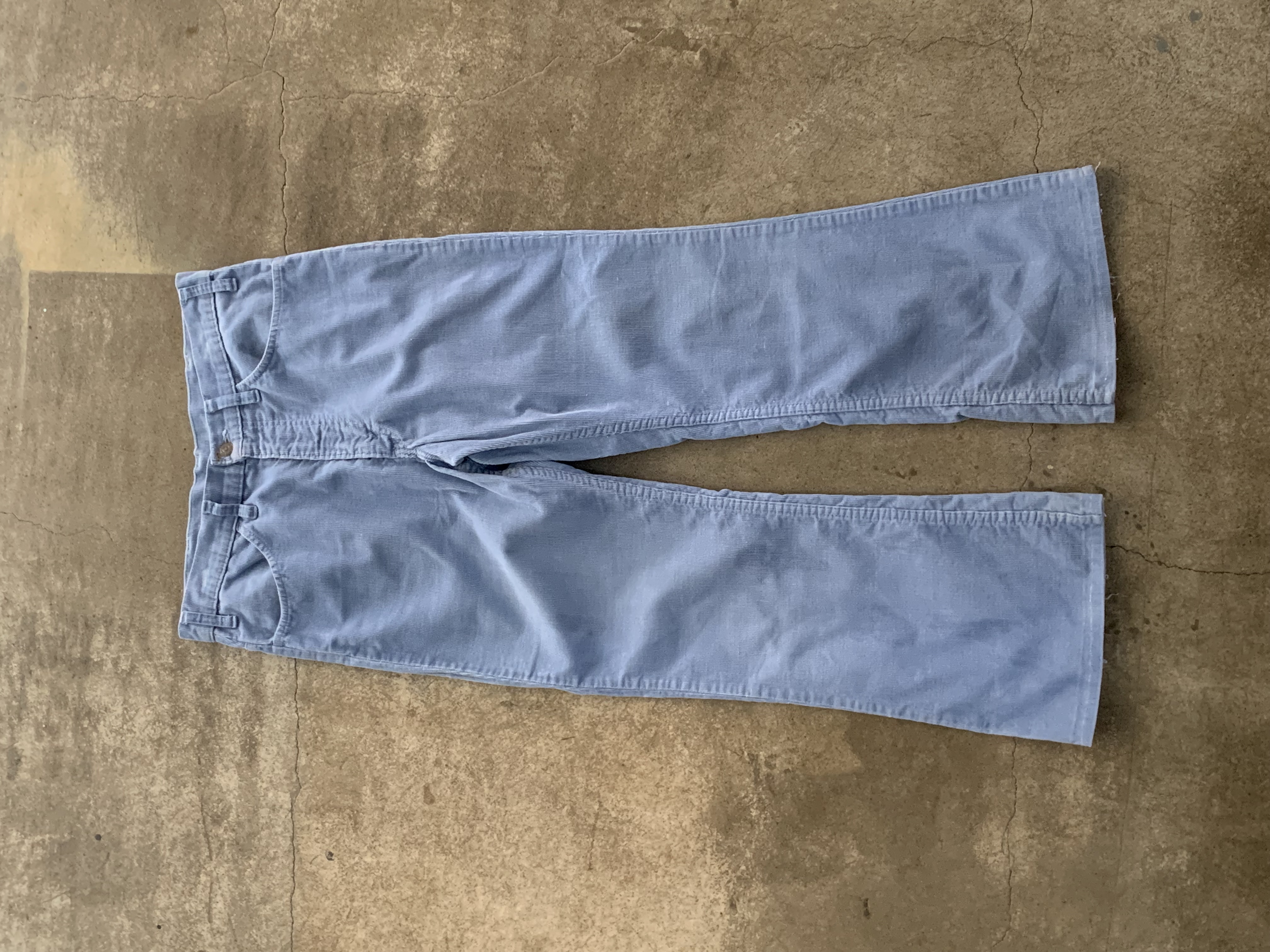 🚩Detail 무릎 아래로 급격하게 퍼지는 플레어핏이 특징적인 1978년 1월 생산 리바이스 646 벨바텀 코듀로이 팬츠. 얇은 골의 코듀로이 특유의 가벼운 원단감과 플레어 핏 그리고 하늘색 컬러 조합이 잘 어울리는 제품으로, 취향에 따라 정사이즈 혹은 오버사이징해도 좋을만한 제품입니다. 기장이 수선되었으나 벨바텀에서 기대할 수 있는 밑단 너비를 해치지 않는 선에서 기장이 수선되었으먀 보다 넓게 퍼지는 플레어 핏을 연출하고자 한다면 밑단 봉제를 풀어도 좋겠습니다.