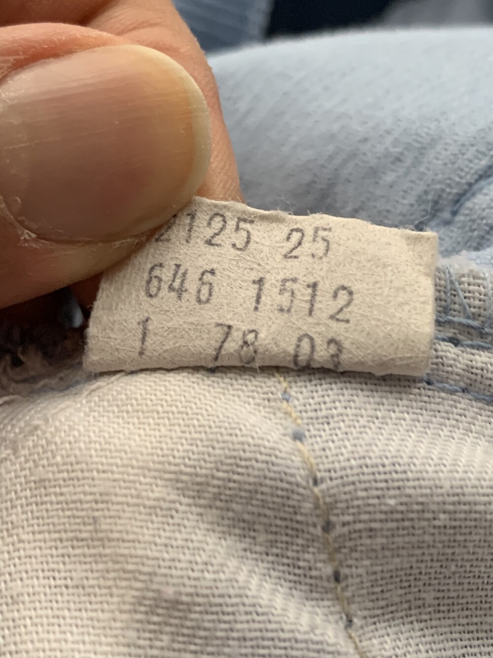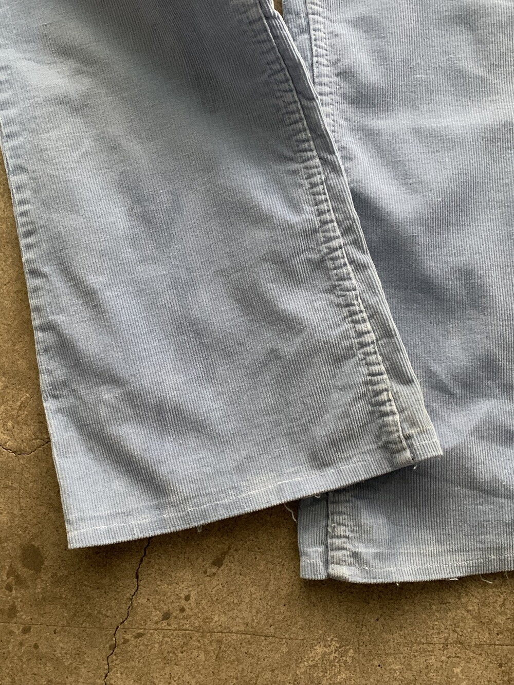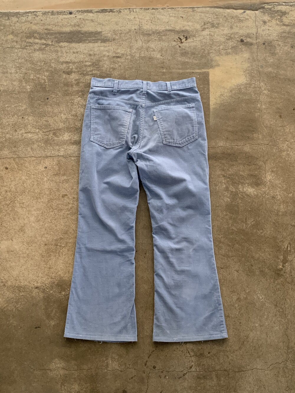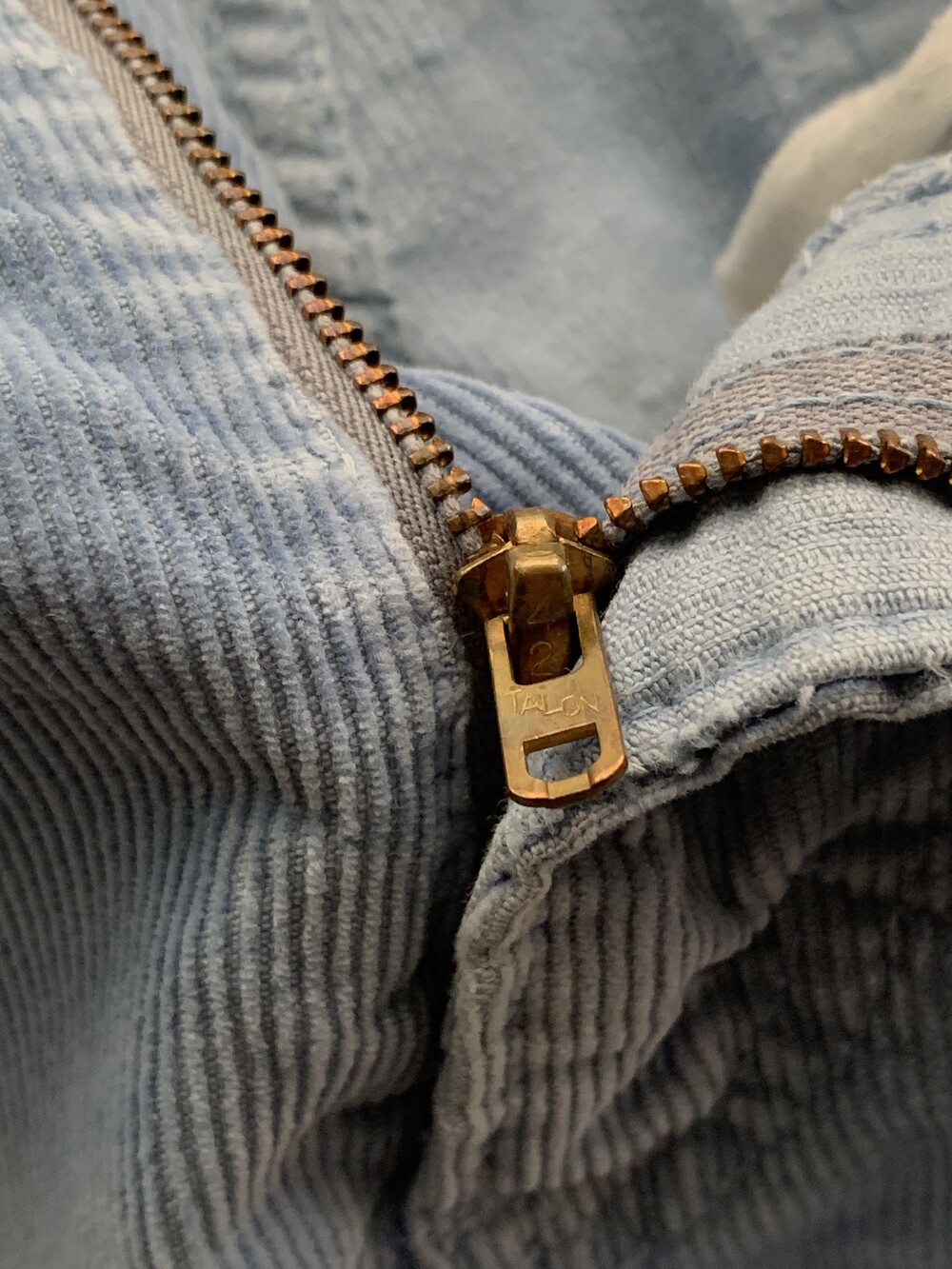 🚩Detail 무릎 아래로 급격하게 퍼지는 플레어핏이 특징적인 1978년 1월 생산 리바이스 646 벨바텀 코듀로이 팬츠. 얇은 골의 코듀로이 특유의 가벼운 원단감과 플레어 핏 그리고 하늘색 컬러 조합이 잘 어울리는 제품으로, 취향에 따라 정사이즈 혹은 오버사이징해도 좋을만한 제품입니다. 기장이 수선되었으나 벨바텀에서 기대할 수 있는 밑단 너비를 해치지 않는 선에서 기장이 수선되었으먀 보다 넓게 퍼지는 플레어 핏을 연출하고자 한다면 밑단 봉제를 풀어도 좋겠습니다.
