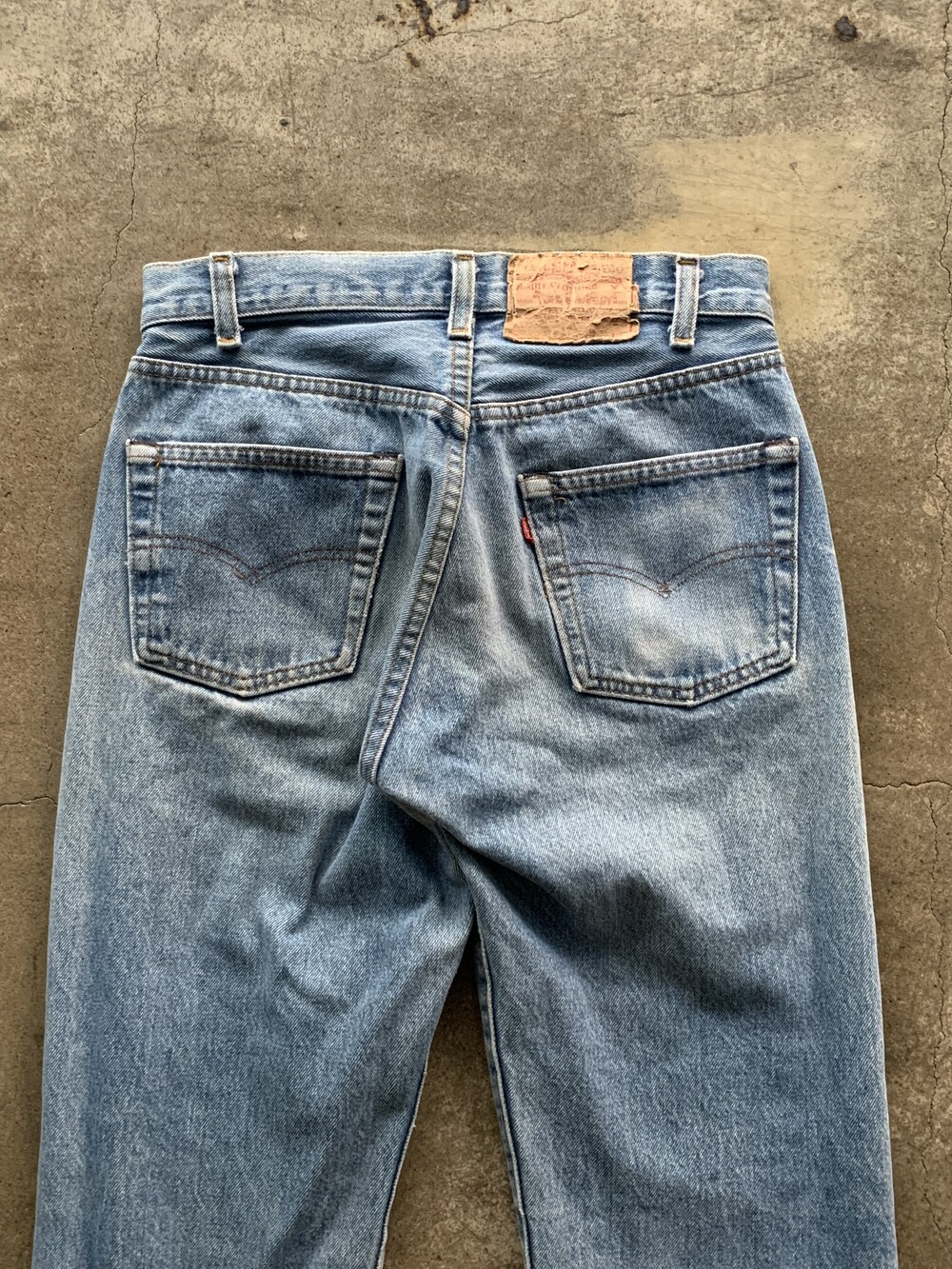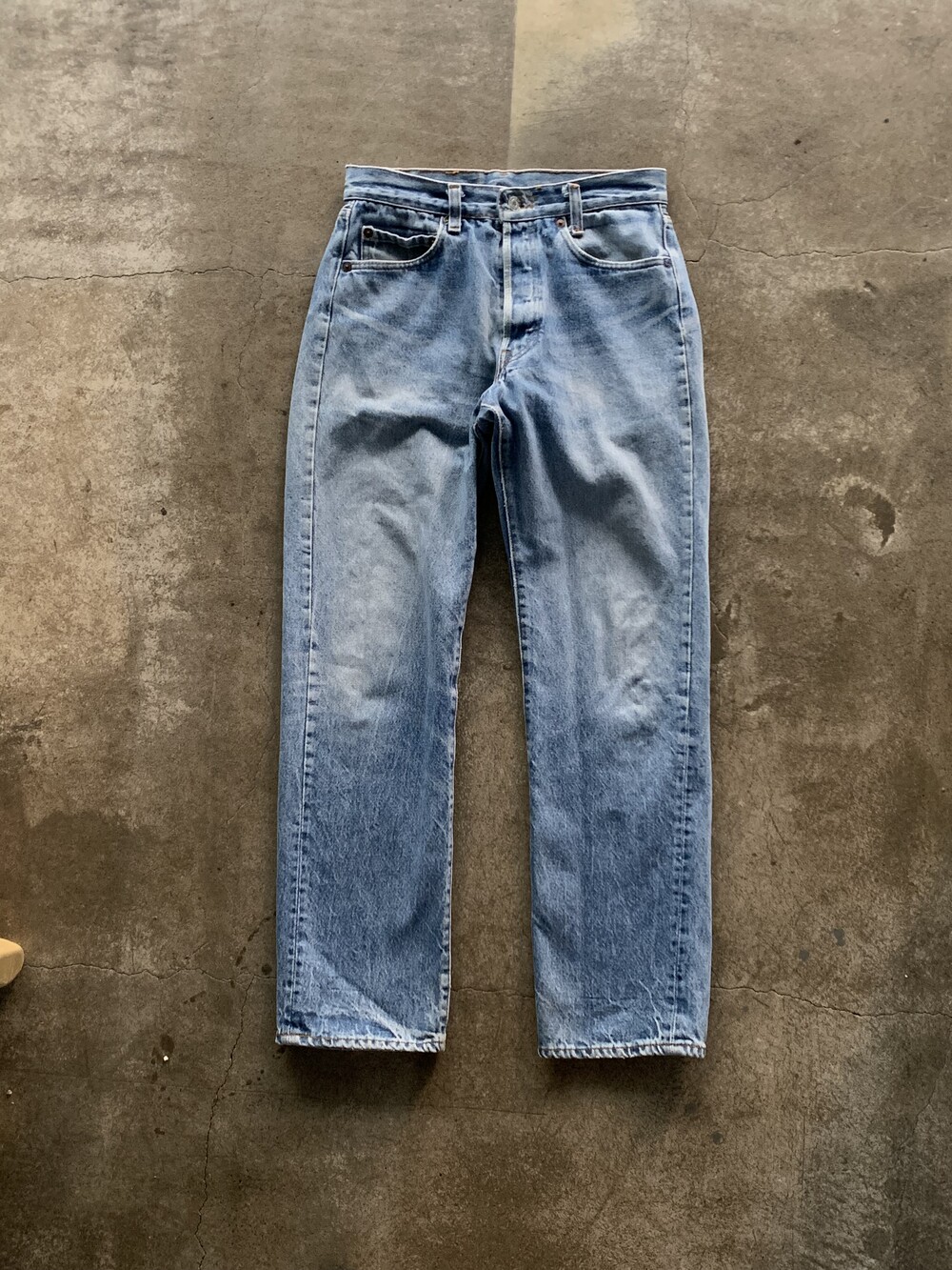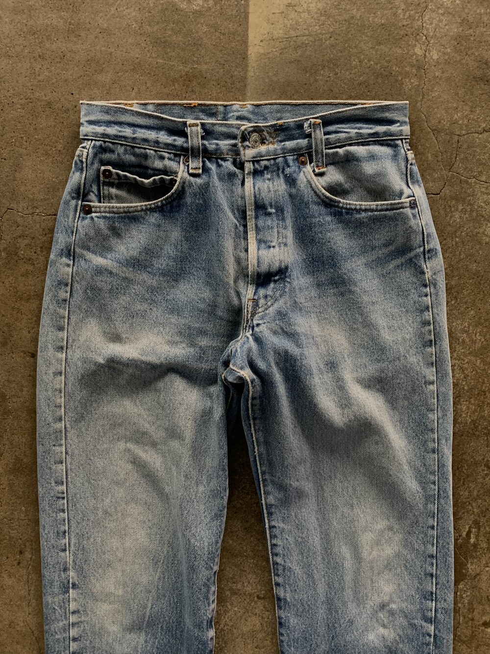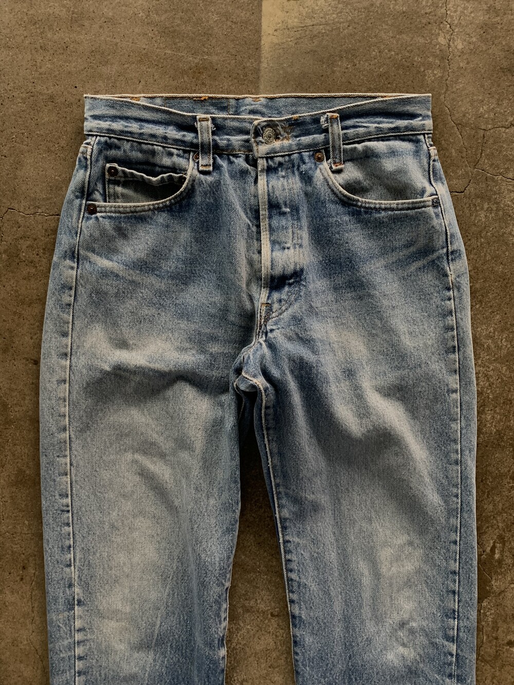 측면 셀비지 라인 없이 밑단이 체인스티치로 마감된, 66후기 모델과 동일한 원단을 사용했을 1980년대 초반 생산 리바이스 501 데님팬츠.