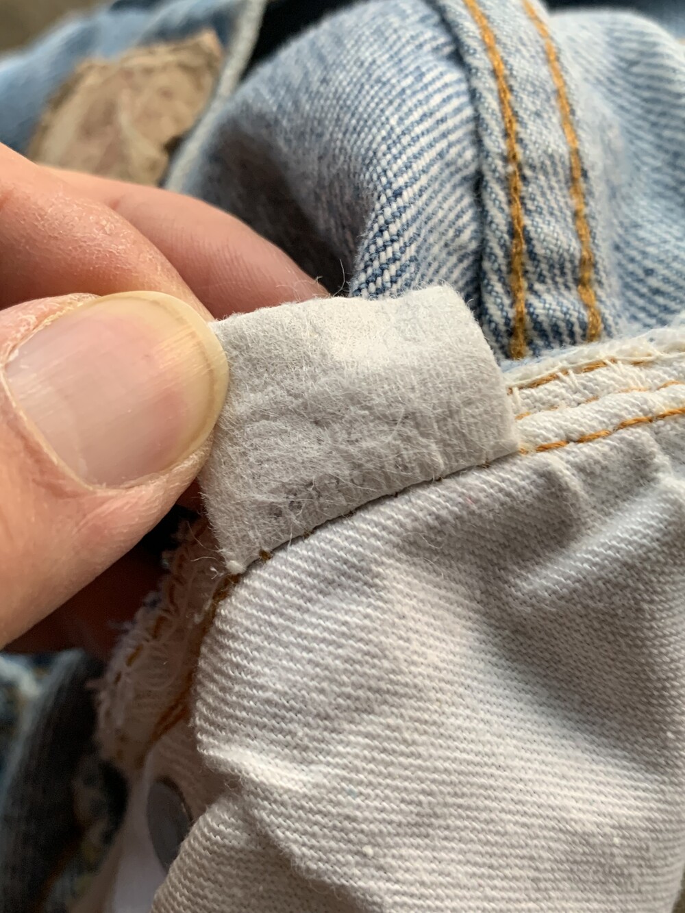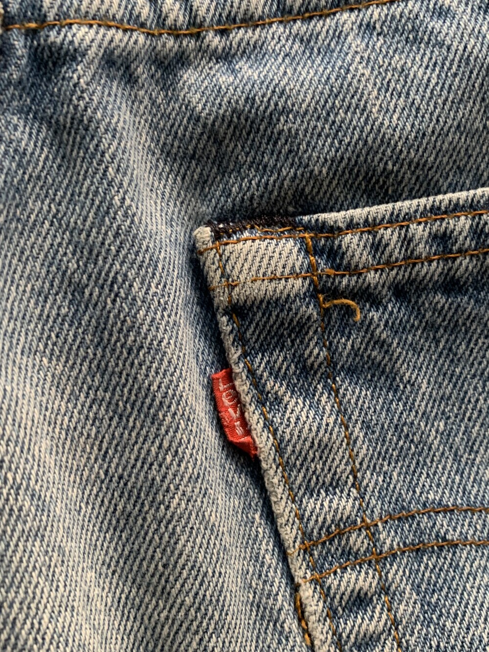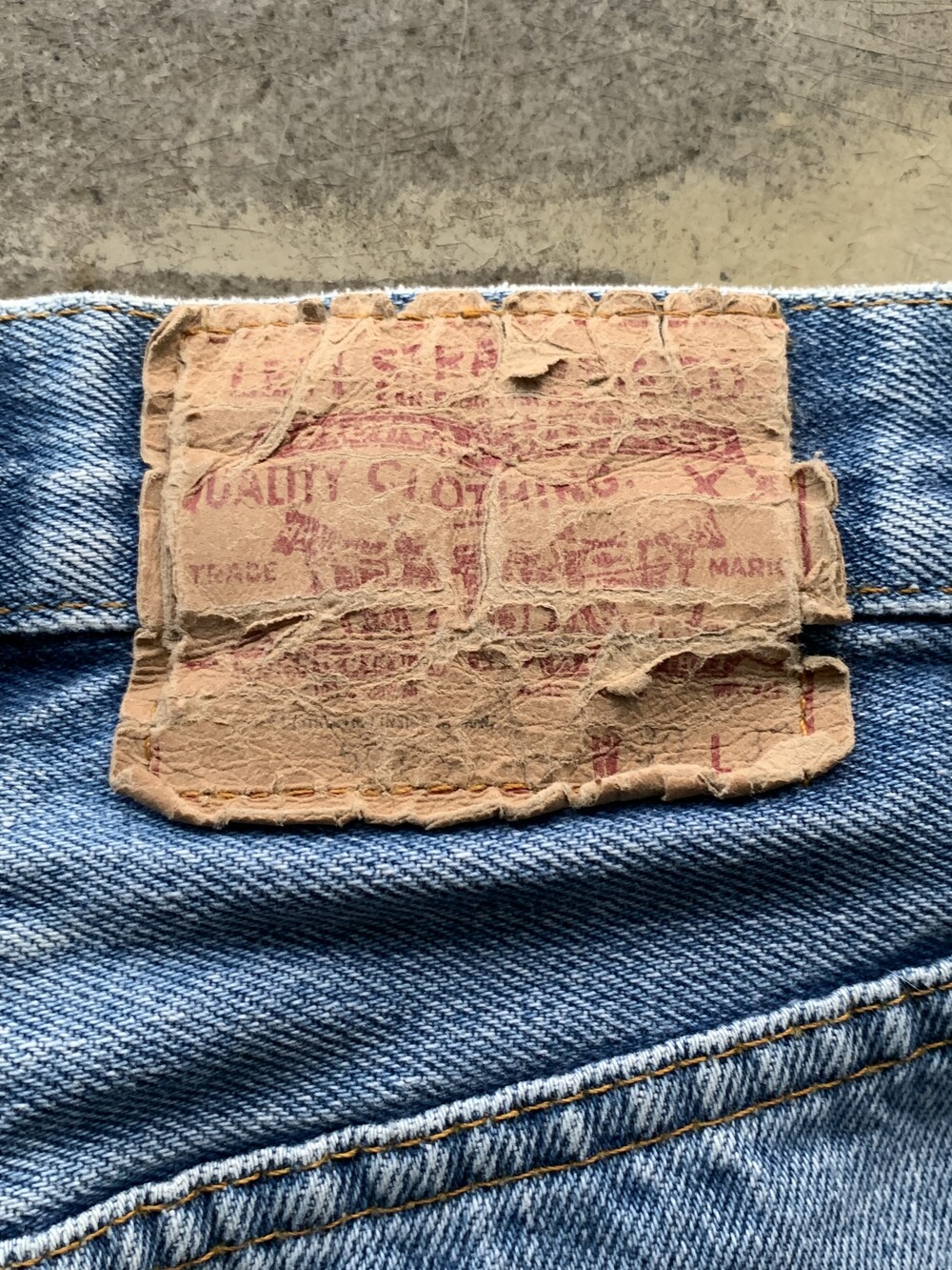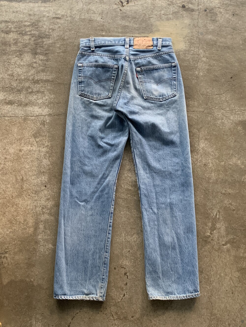 측면 셀비지 라인 없이 밑단이 체인스티치로 마감된, 66후기 모델과 동일한 원단을 사용했을 1980년대 초반 생산 리바이스 501 데님팬츠.