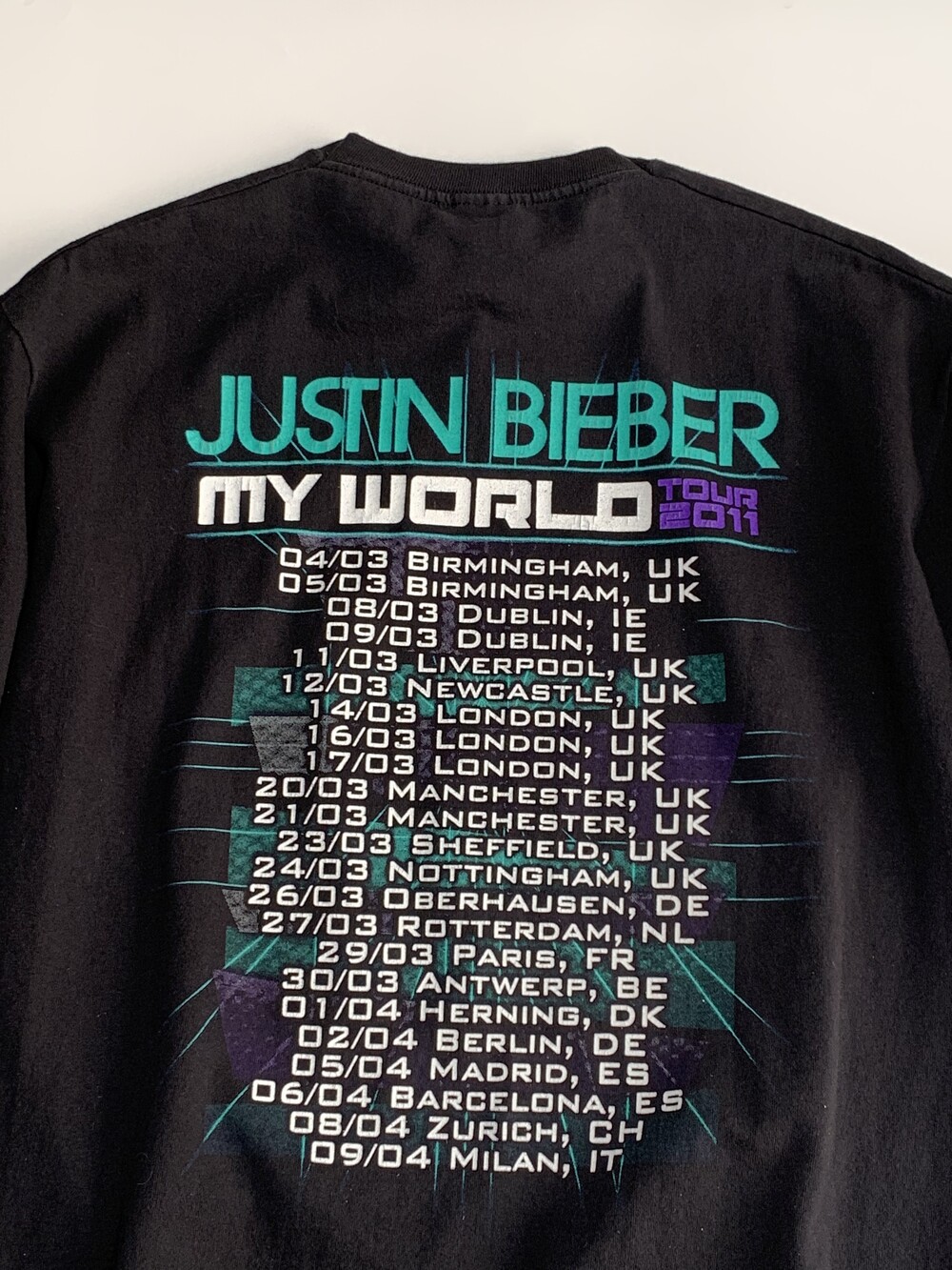 저스틴 비버의 데뷔 앨범 MY WORLD 시리즈로 기획한 커리어 첫번쨰 투어 MY WORLD TOUR, 그 중에서도 미국과 캐나다에서의 일정을 마무리하고 유럽 주요 국가에서 진행했던 2011년 투어 프로모션 프린팅이 올려진 티셔츠.