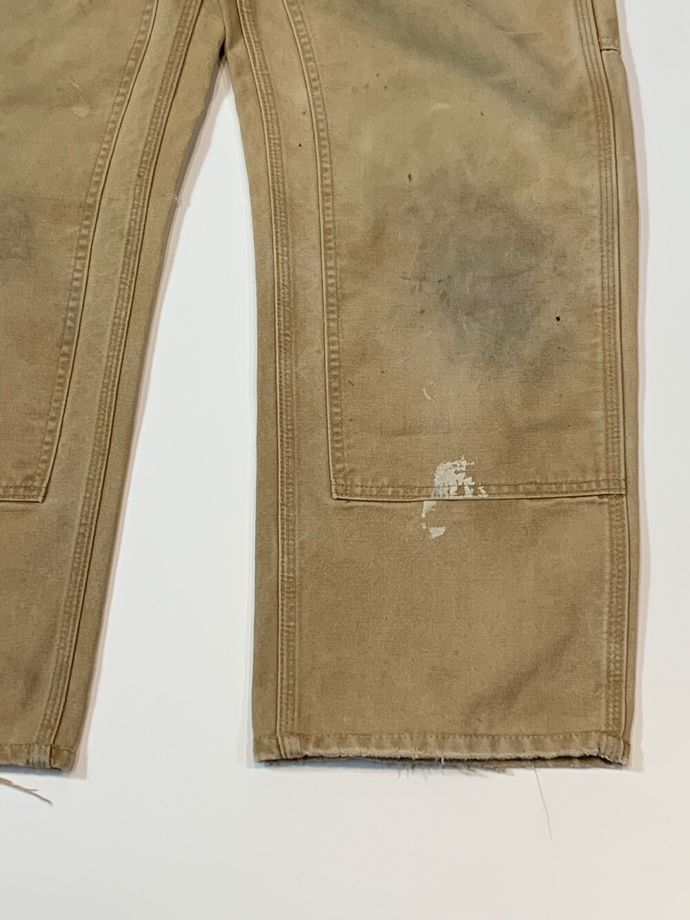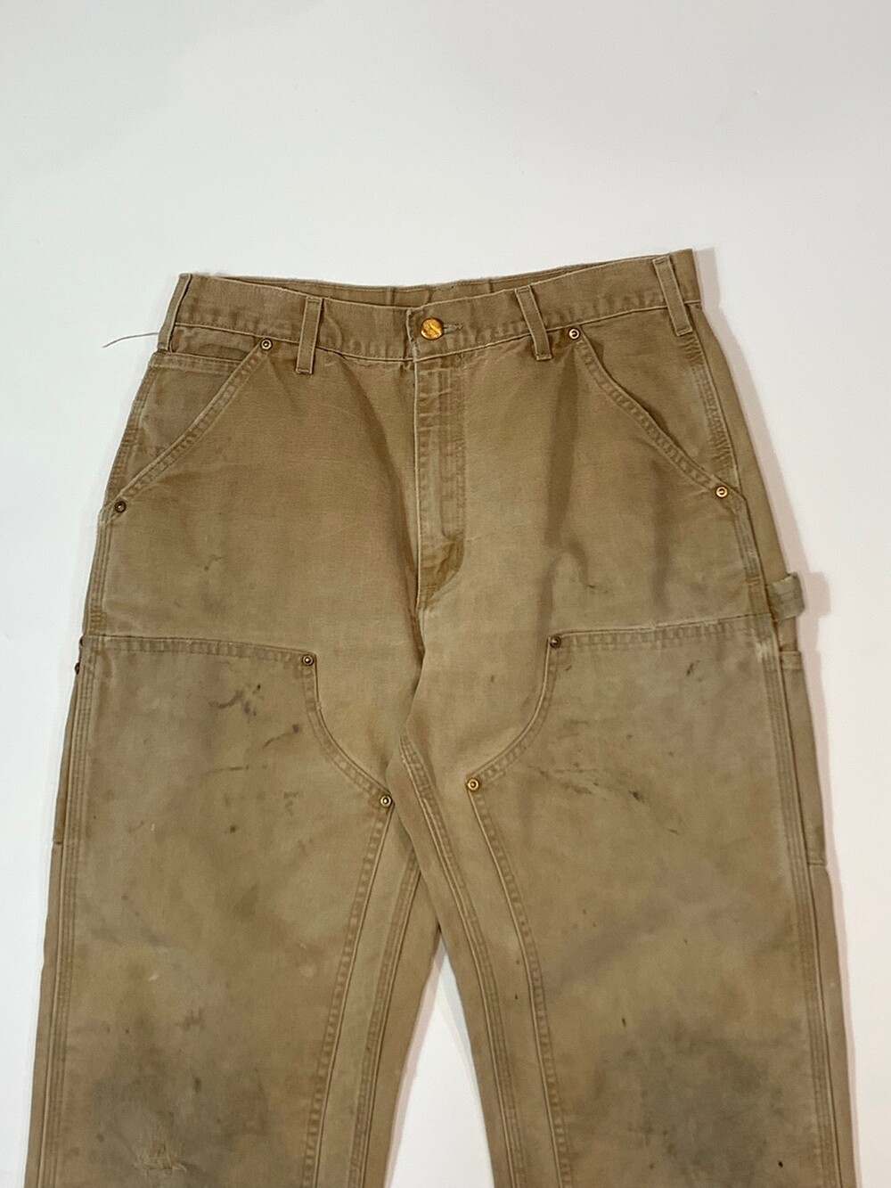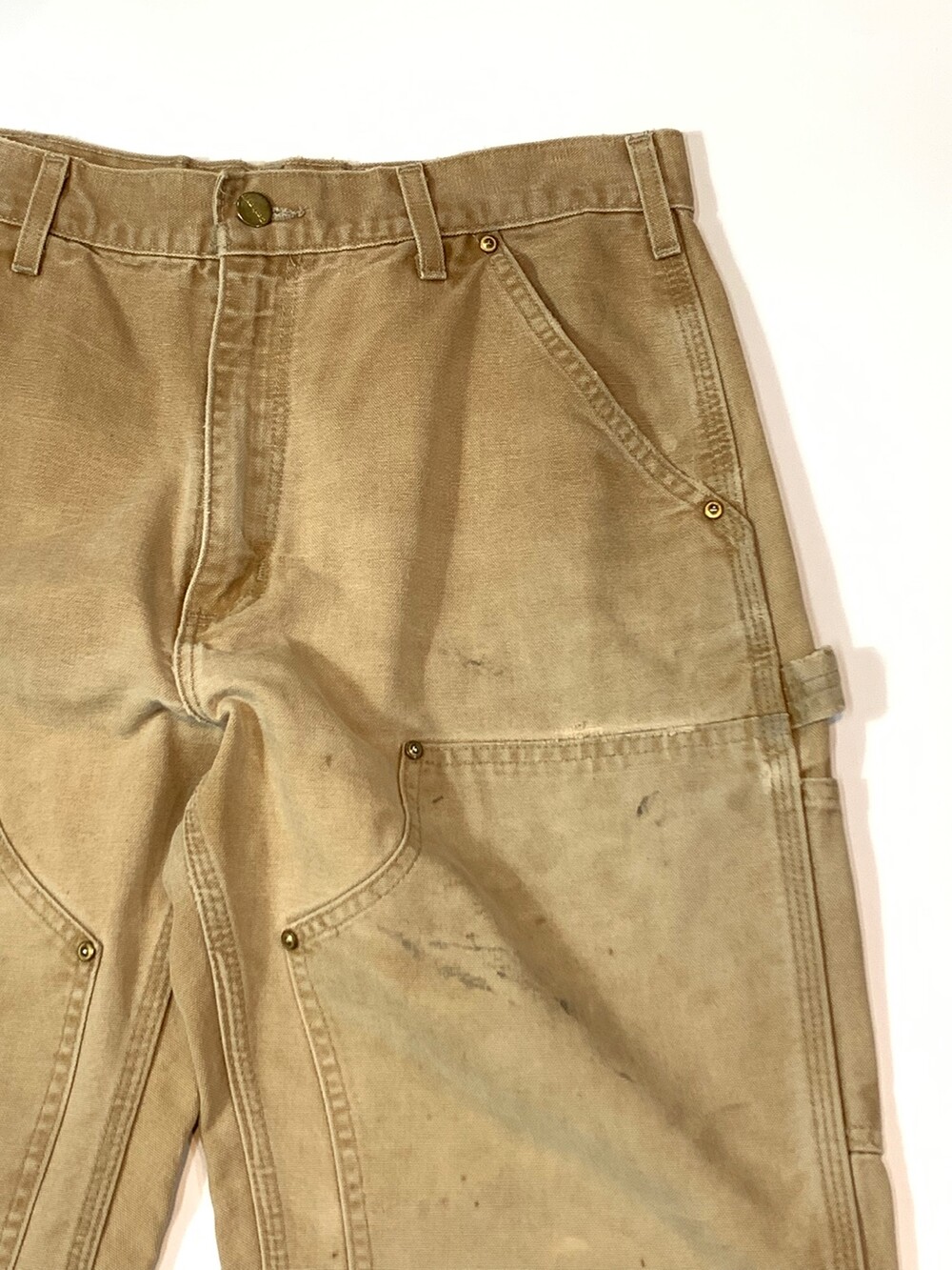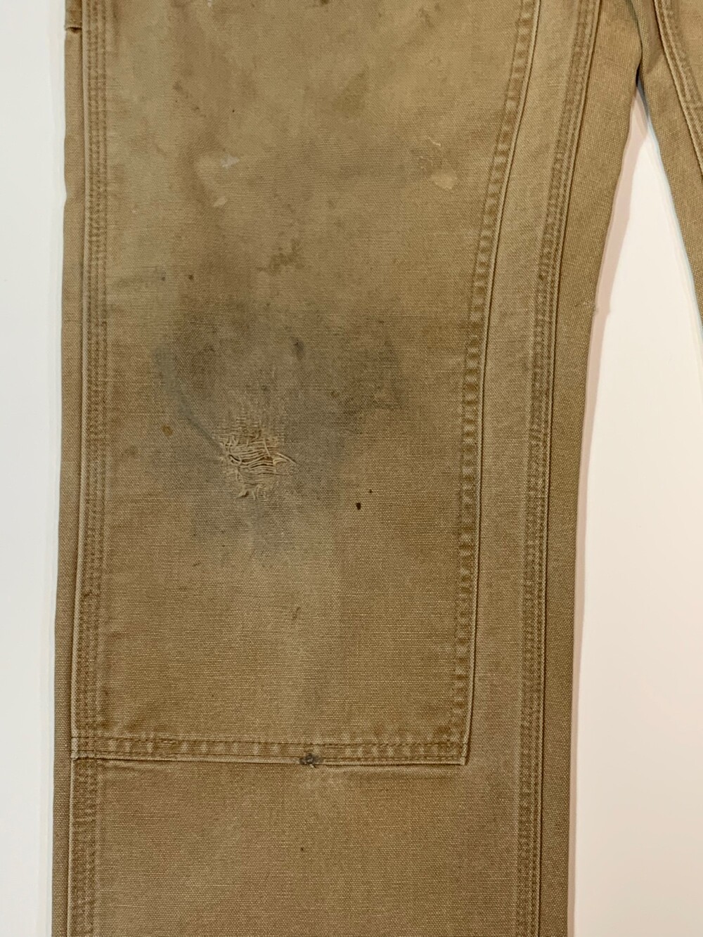 작업 노동자의 부상을 방지하기 위해 무릎에 원단을 덧댄 칼하트의 더블니 워크팬츠입니다. 2000년도 중반 혹은 그 이후에 생산된 것으로 추정되는 제품으로, 스탠다드 컬러인 브라운 덕캔버스 원단이 페이딩을 거쳐 은은한 색감과 닳아 헤진 부분이 있는, 워크팬츠다운 사용감이 돋보이는 제품입니다.