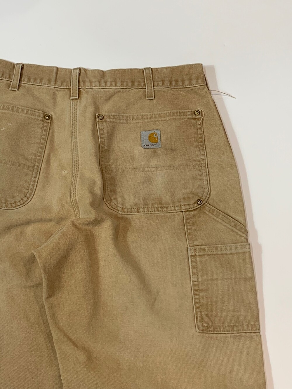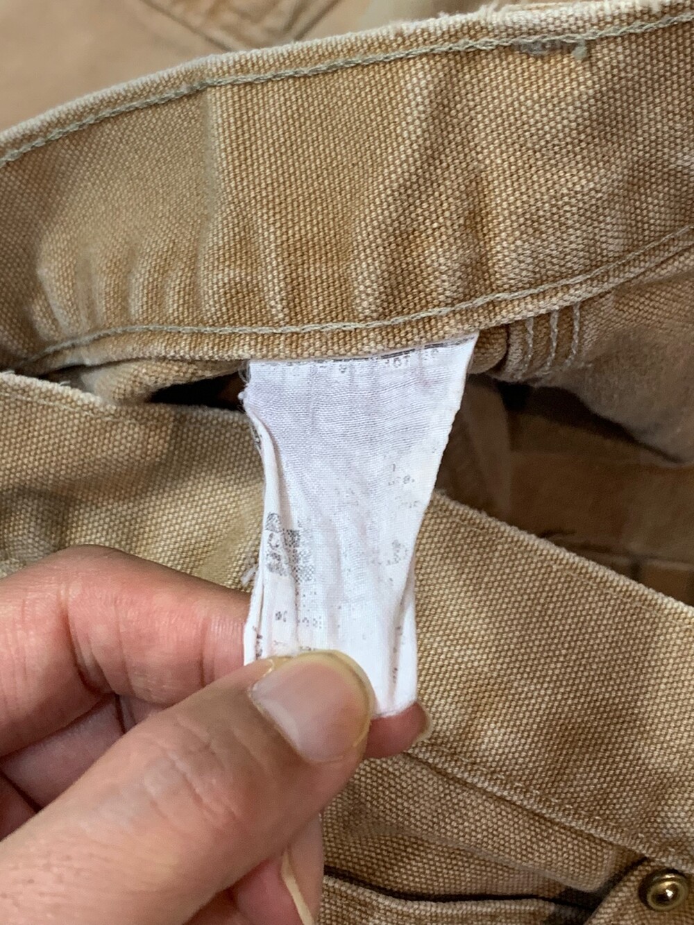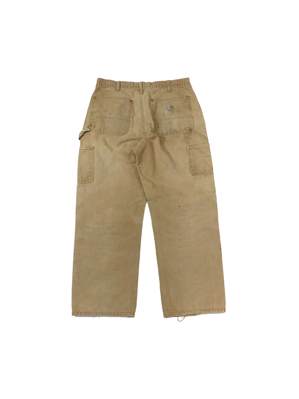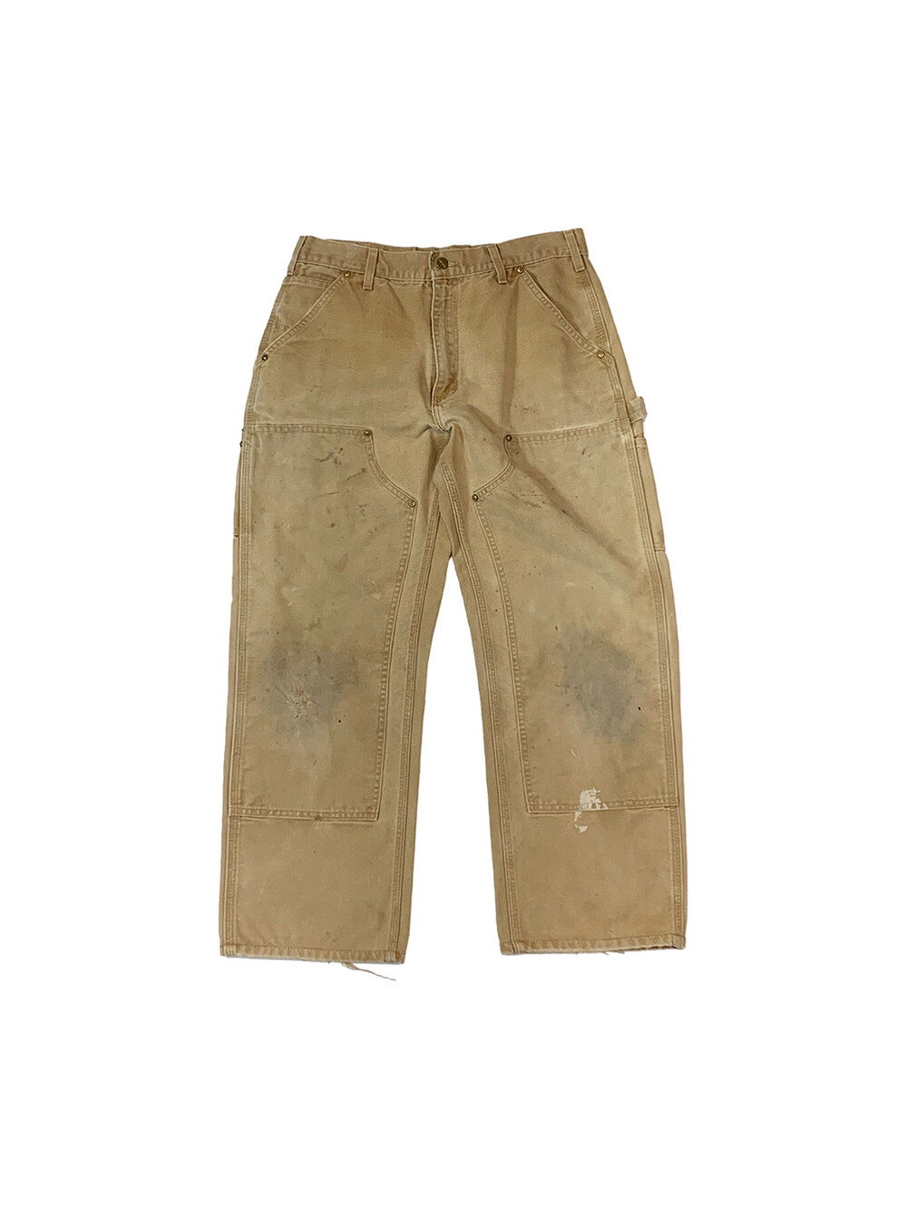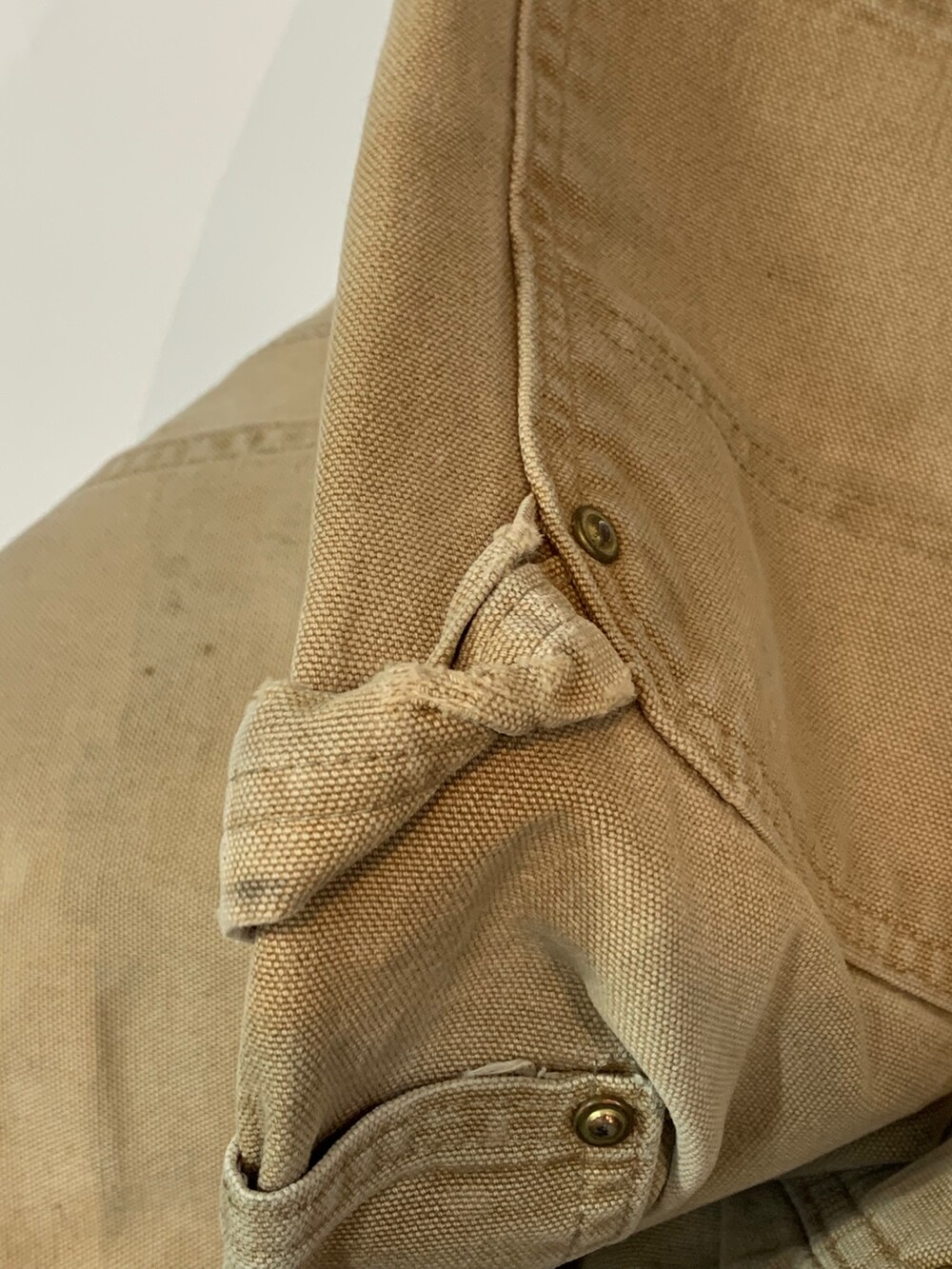 작업 노동자의 부상을 방지하기 위해 무릎에 원단을 덧댄 칼하트의 더블니 워크팬츠입니다. 2000년도 중반 혹은 그 이후에 생산된 것으로 추정되는 제품으로, 스탠다드 컬러인 브라운 덕캔버스 원단이 페이딩을 거쳐 은은한 색감과 닳아 헤진 부분이 있는, 워크팬츠다운 사용감이 돋보이는 제품입니다.