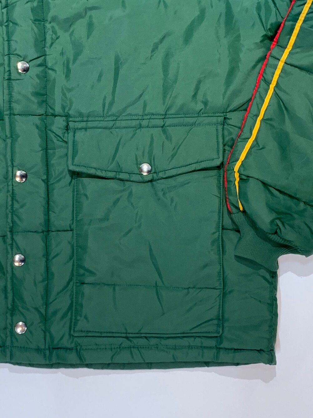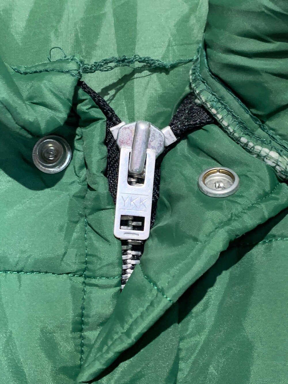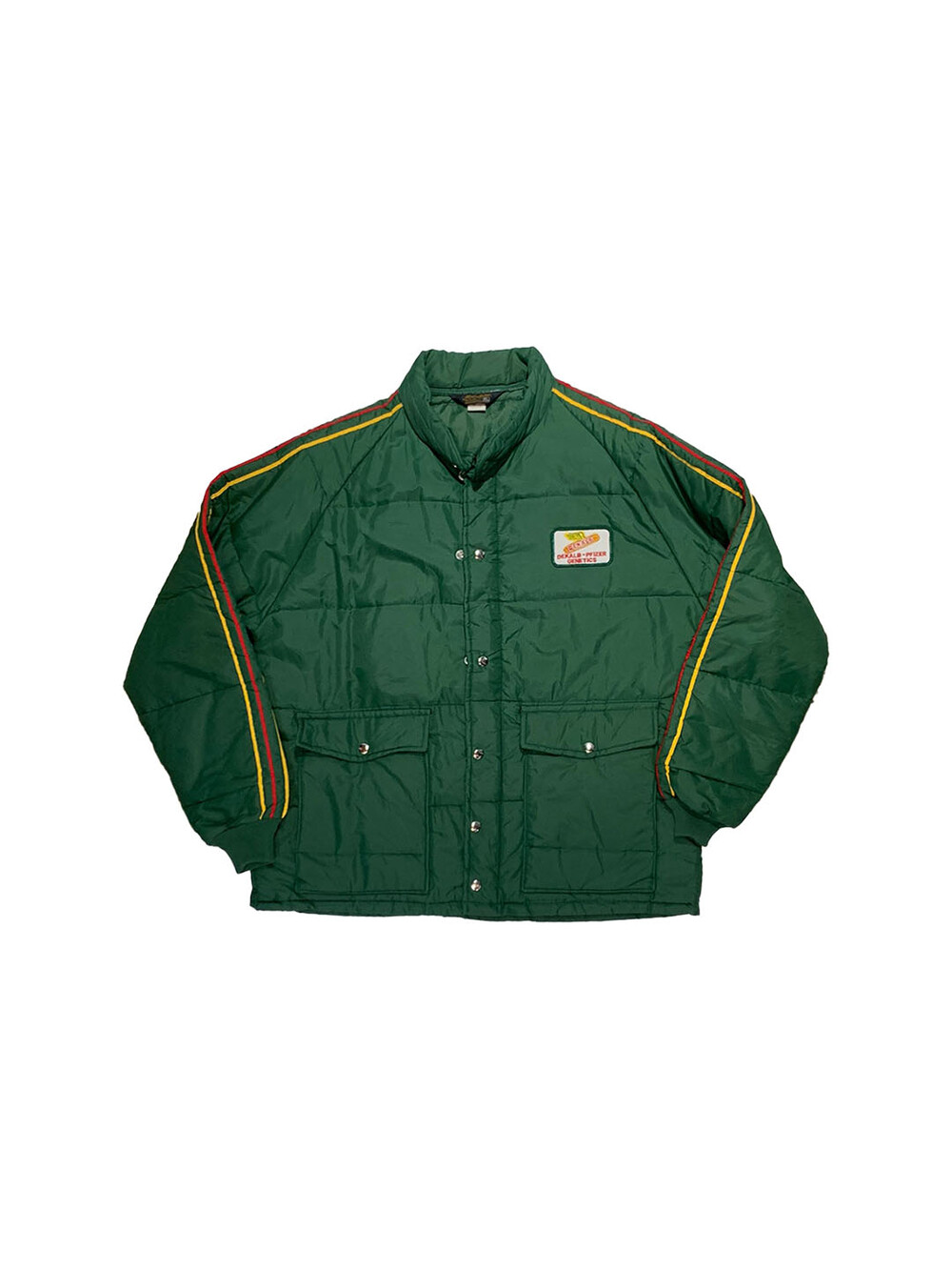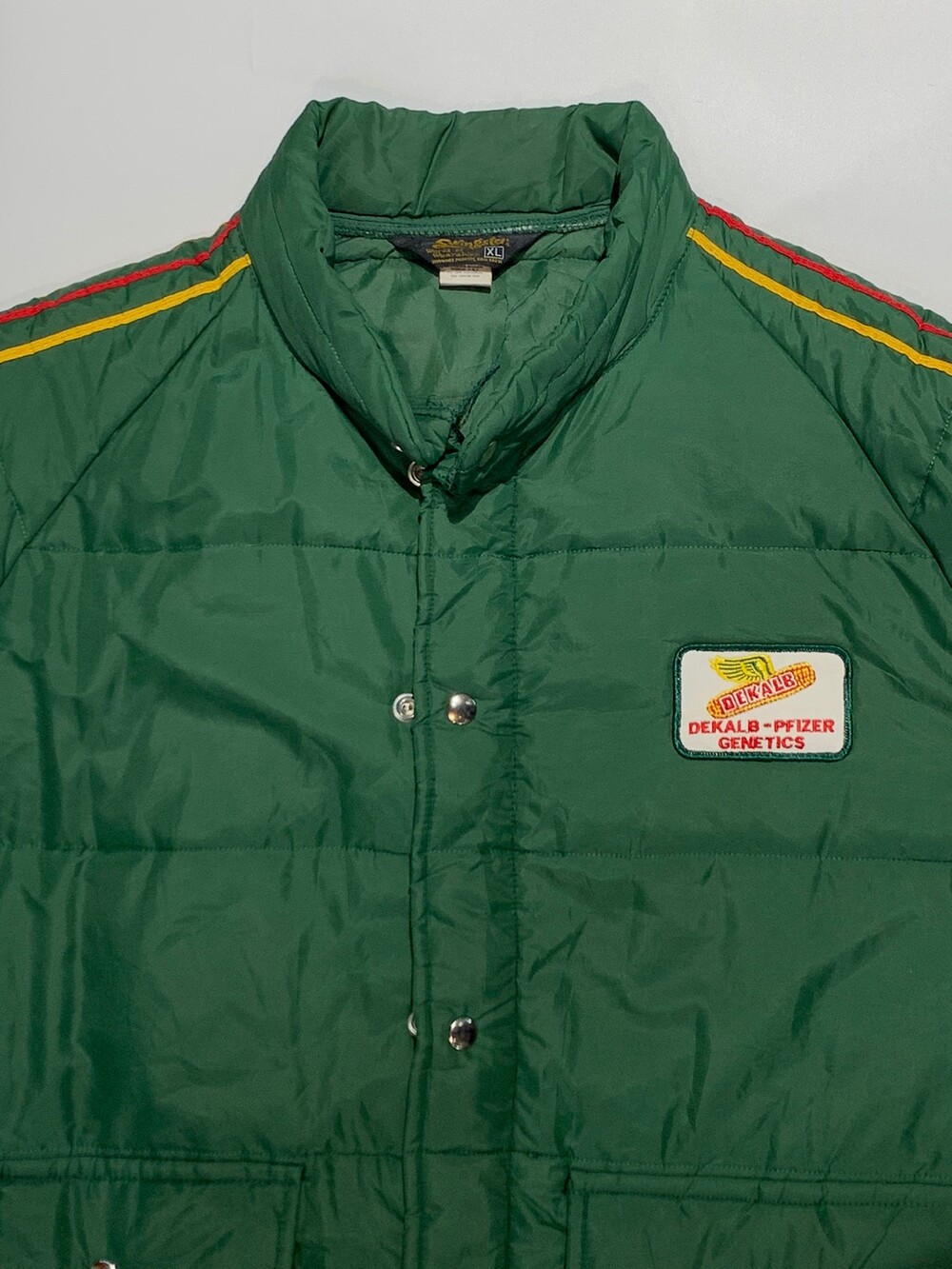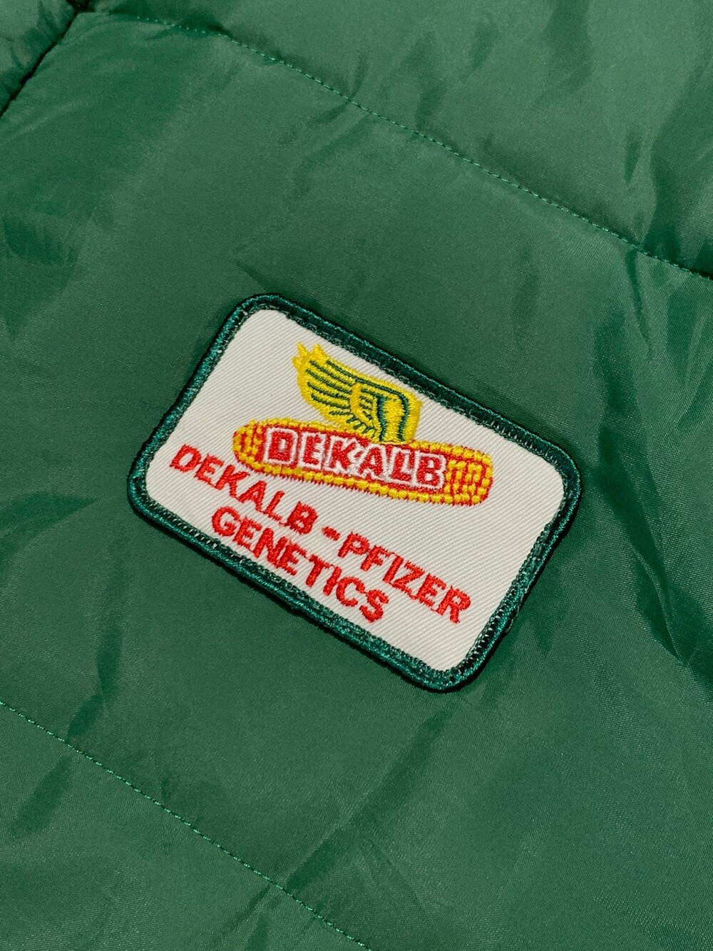 퀼티드 타입의 스윙스터 나일론 자켓 바디 위에 1912년부터 유전적으로 개량된 농업용 씨앗을 주로 판매해왔던 회사 데캘브 제네틱스(DEKALB PFIZER GENETICS) 패치가 붙은 제품. 개량된 품종의 옥수수를 개발하여 판매하는 것이 그들의 첫 프로젝트였기에, 데캘브의 로고는 날개 달린 옥수수 디자인을 채택했다고 합니다. 나일론 겉감에 폴리 충전재가 들어가 가볍게 착용하기 좋을 제품입니다.