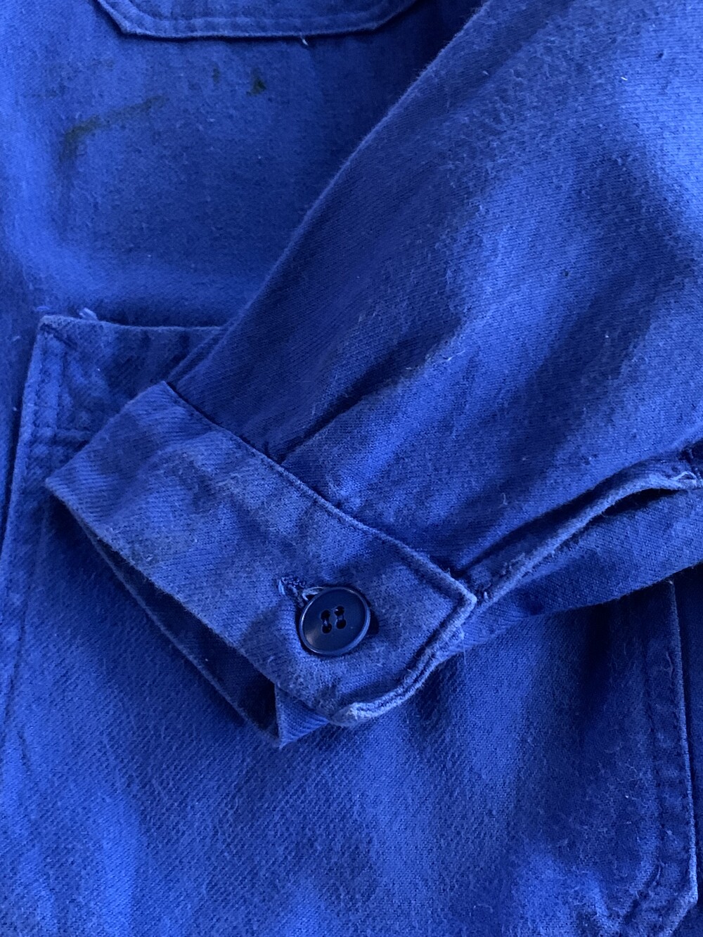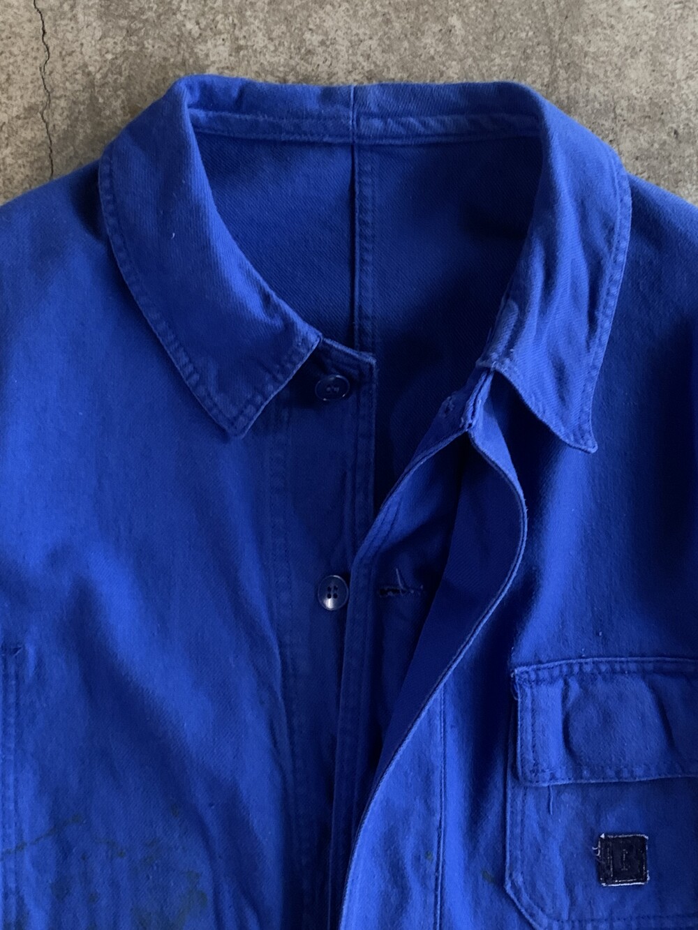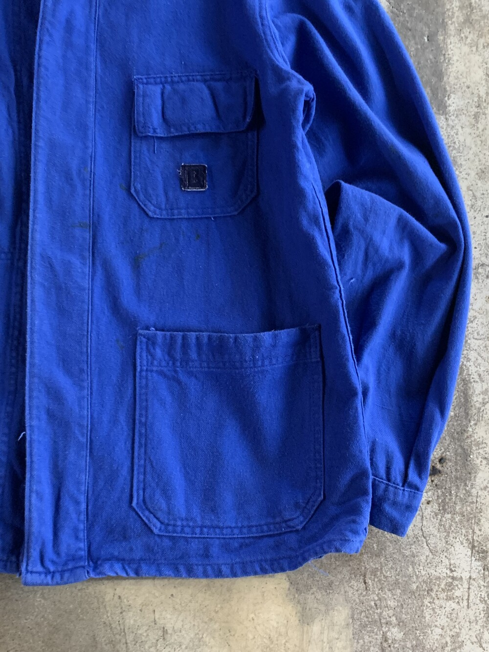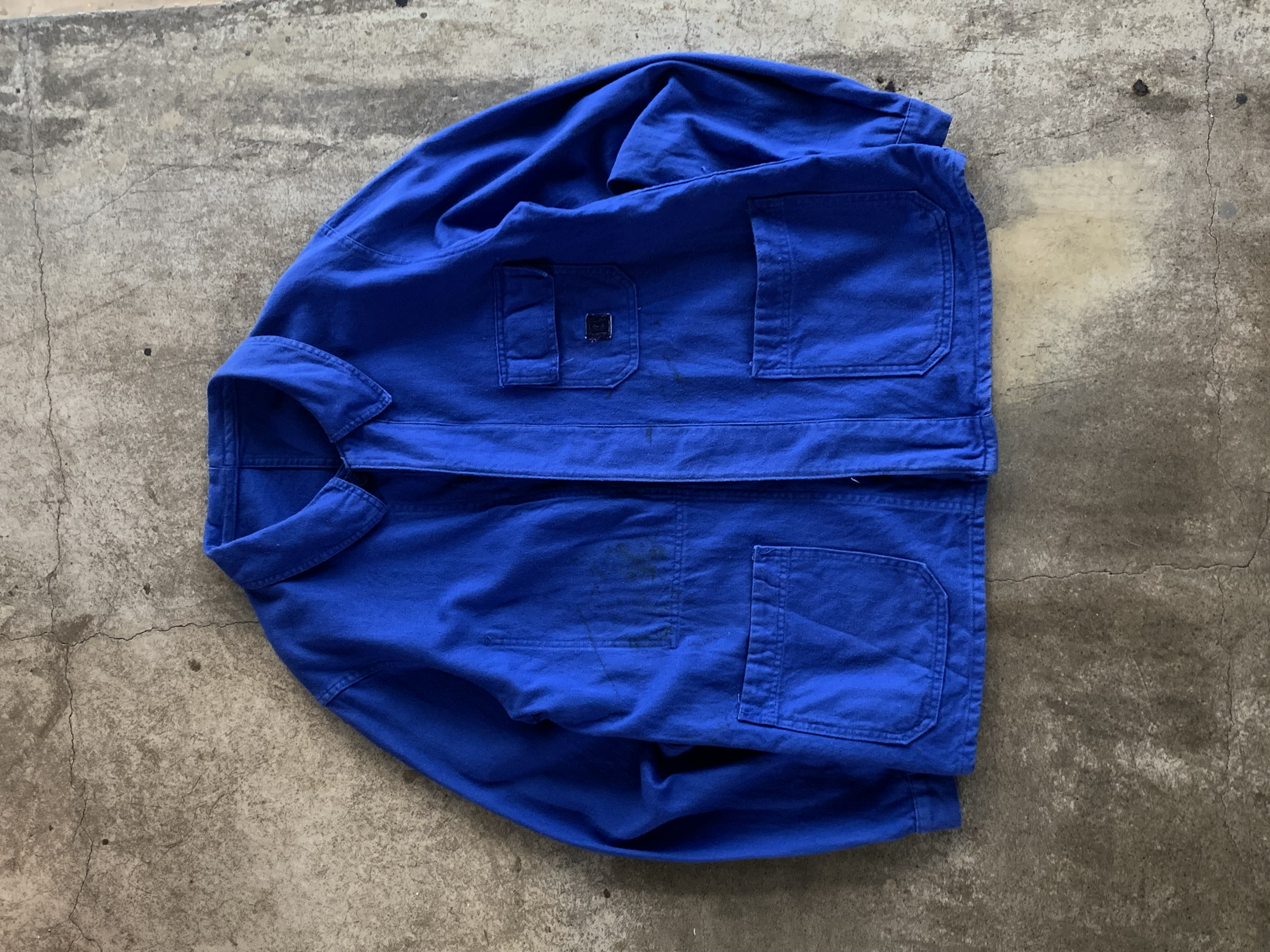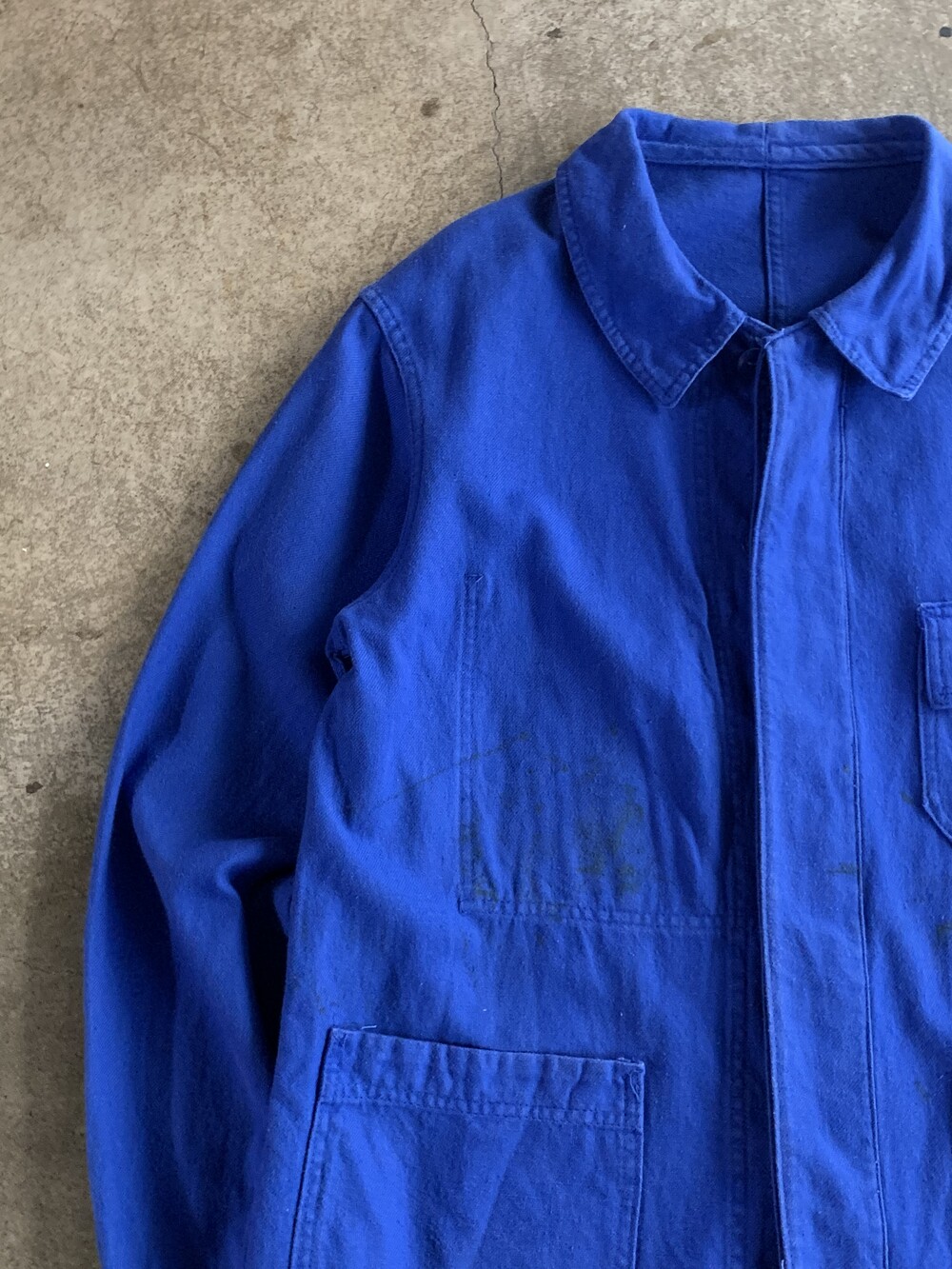전면 몸판과 소매에 페인트 얼룩이 있는, 사용감 있는 제품.