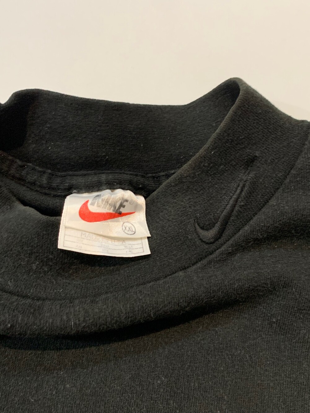 1990년대 생산된 것으로 추정되는 건조한 촉감과 적당한 두께의 코튼 소재 반팔 티셔츠. 넥라인 높이가 다소 낮고 폭이 여유있는 모크넥 타입으로, 넥라인에 스우시 자수 외에는 별다른 자수나 프린팅 없는 심플한 제품입니다. 표기 XXL의 큰 사이즈로 단품으로 착용하거나 롱슬리브 티셔츠나 스웻후디 위에 레이어드해서 착용해도 좋을만한 제품입니다.