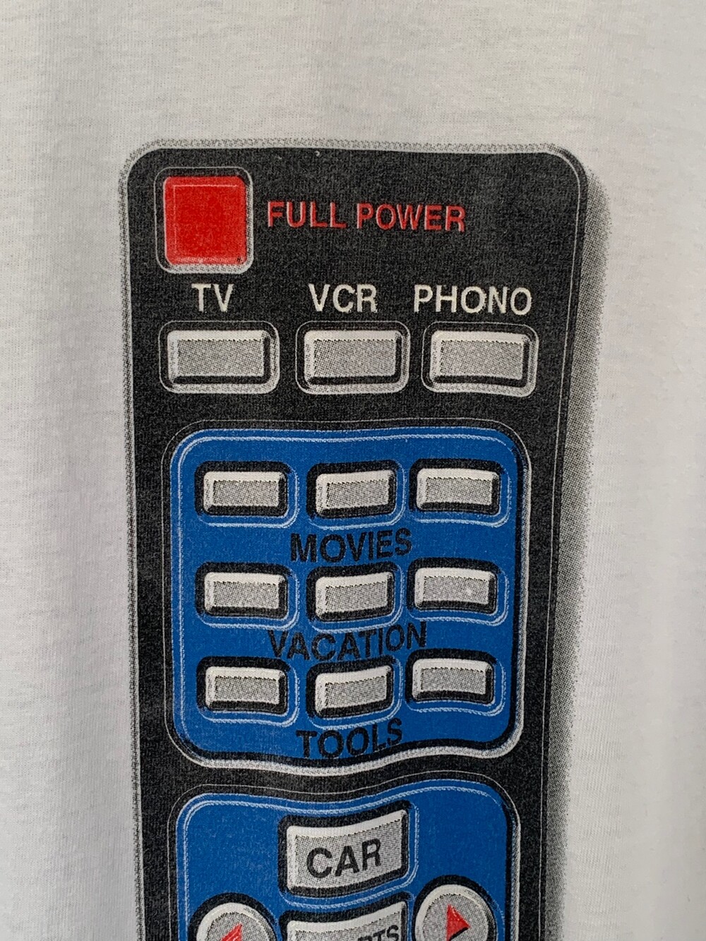 MOVIES, VACATION, TOOLS, CAR, SPORTS, BEER 등 특히나 남자들이 좋아할만한 버튼으로 채워진, 어딘가 나사빠진듯한 너드미를 빌산하는 리모콘 프린팅이 돋보이는 티셔츠.