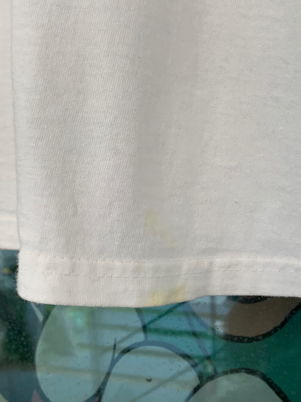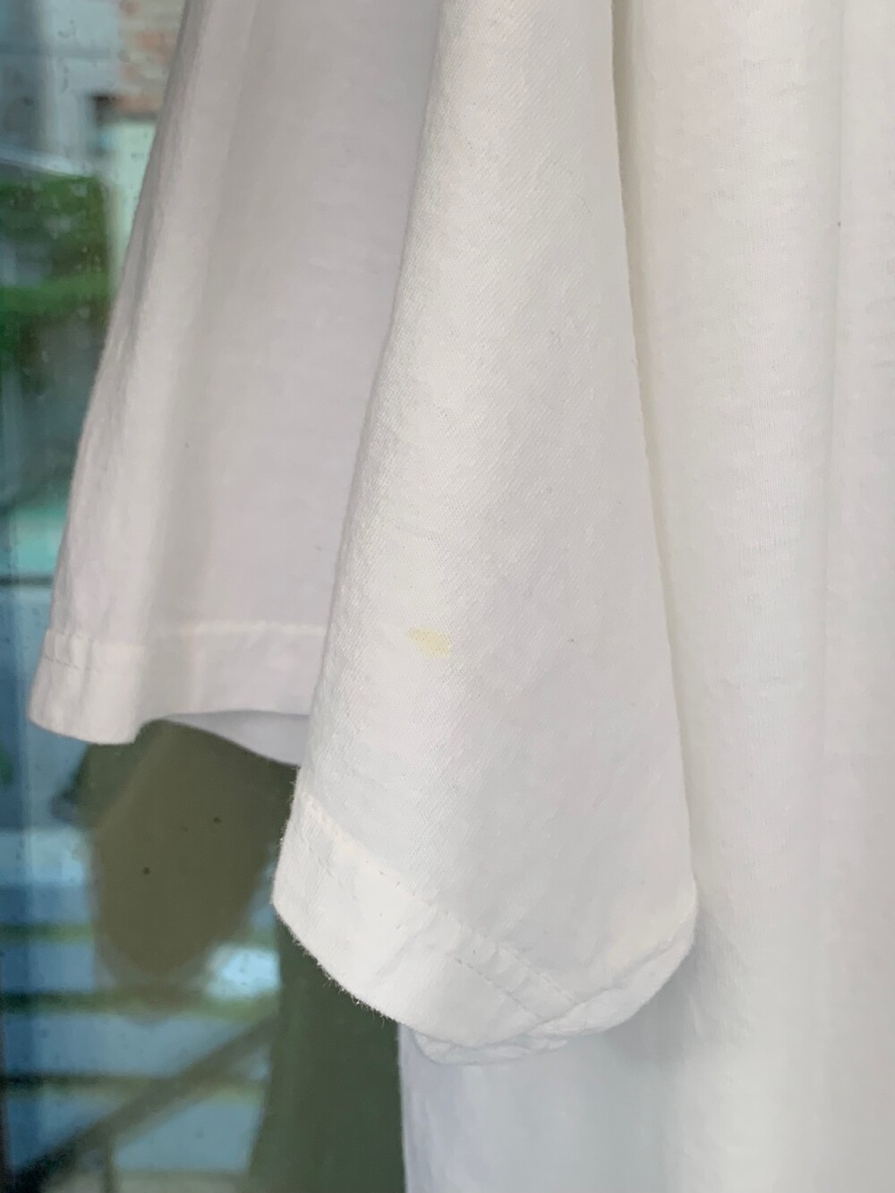 넥라인 부근, 몸판, 밑단 부근에 얼룩이 있으며 전면에 핀홀이 있는, 사용감 있는 제품.