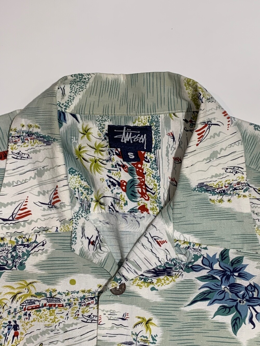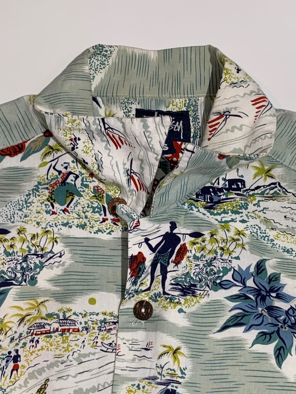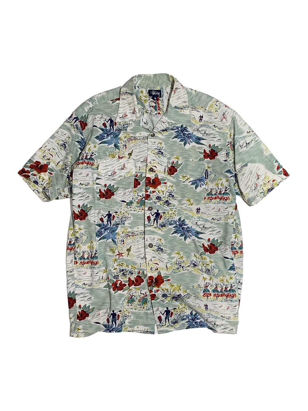 🚩Detail 루프칼라 디테일과 6버튼 사양의 나무 단추 등 빈티지 하와이안 셔츠를 고증을 살린, 1990년대에서 2000년대 초반 사이에 생산된 스투시의 하와이안 셔츠. 코튼/레이온 혼방 원단으로 가벼운 착용감과 동시에 관리하기에도 용이해 캐주얼하게 착용하기 좋을만한 제품입니다. 이너 없이 단품으로 착용하거나 혹은 슬리브리스 탑과 함께 핏한 느낌으로 매치해도 좋을만한 제품입니다.
