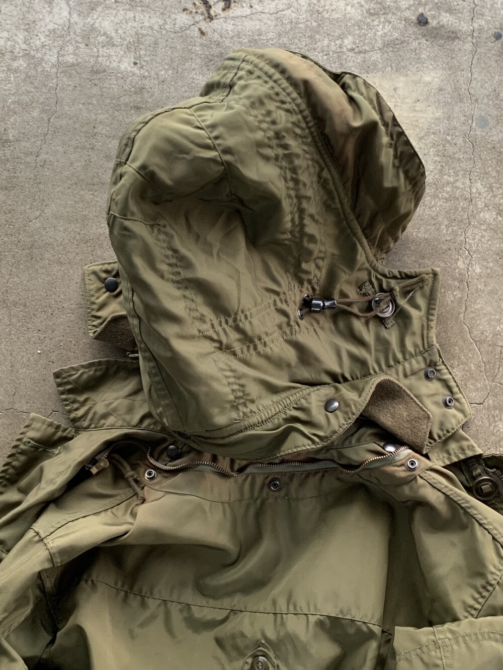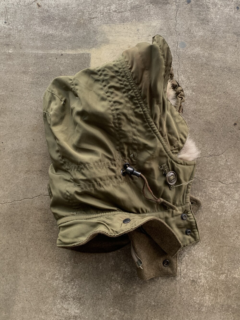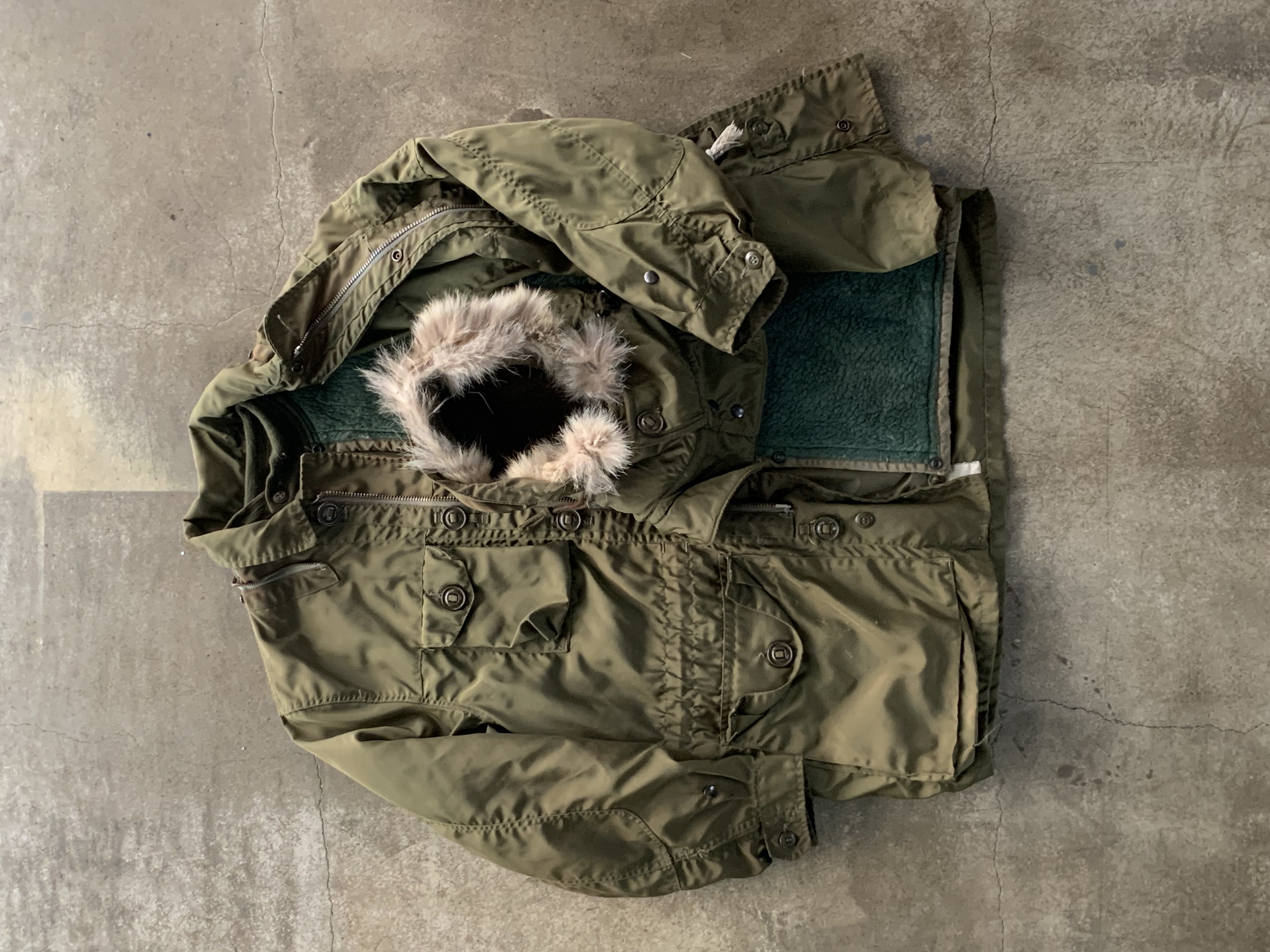 미군 M-48이나 M-51 초기형에 비해서도 훨씬 가벼우면서도 요철감이 있는 나일론 옥스포드 원단 아웃쉘, 그린 컬러 울 파일과 울 소재 친스트랩이 붙어 보온을 담당하는 라이너, 지퍼와 스냅으로 체결할 수 있는 후드가 붙어 구성 빠짐없이 세트로 구성된 제품입니다. 표기 Large로 105호 혹은 그보다 조금 작게 입는 분들에게 권장드립니다.