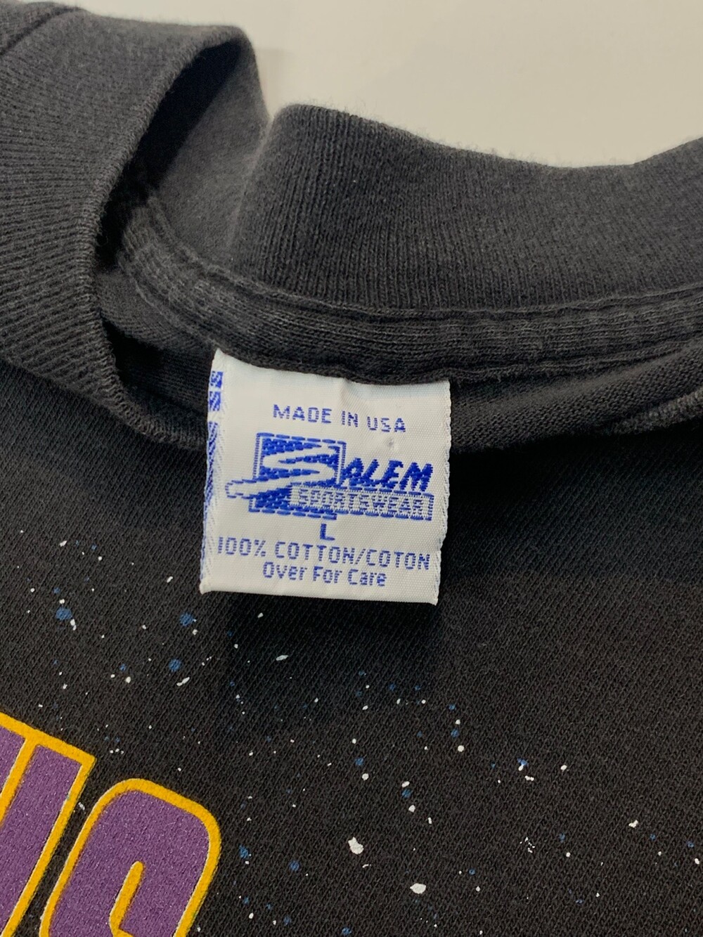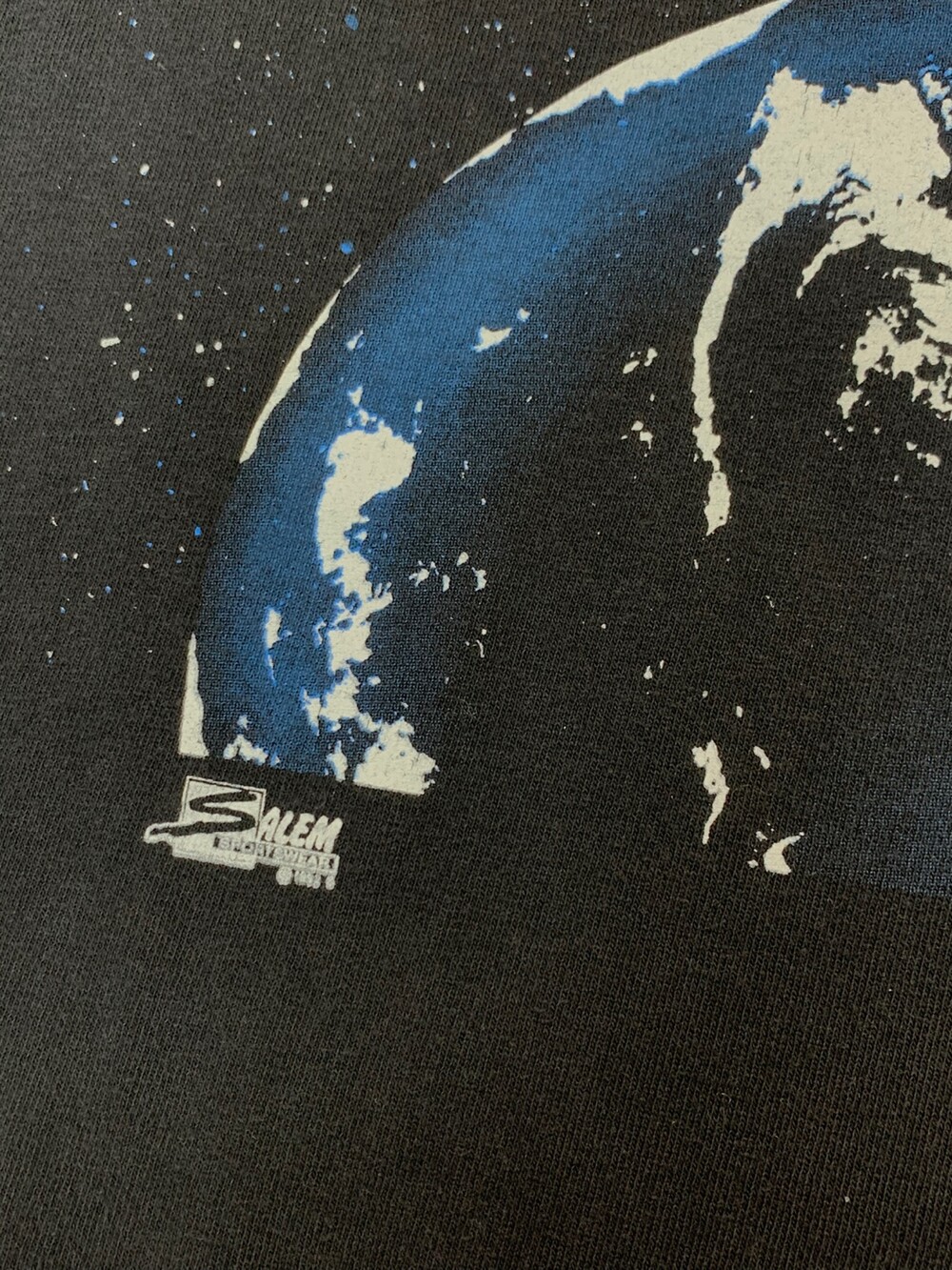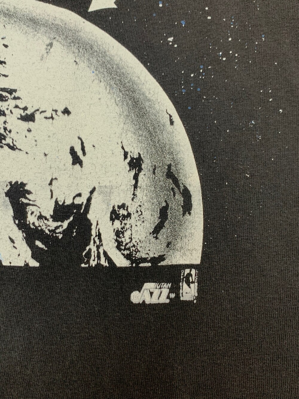 스크린 프린팅 회사로 시작하여 스포츠 관련 프린팅을 주력으로 선보이고 직접 바디까지 제작한 스포츠웨어 브랜드 세일럼 스포츠웨어 티셔츠. US AGAINST THE WORLD 라는 슬로건에 어울리는 지구 프린팅이 전면에, 후면에는 유타 재즈 구단 로고 프린팅이 올려져 있습니다.