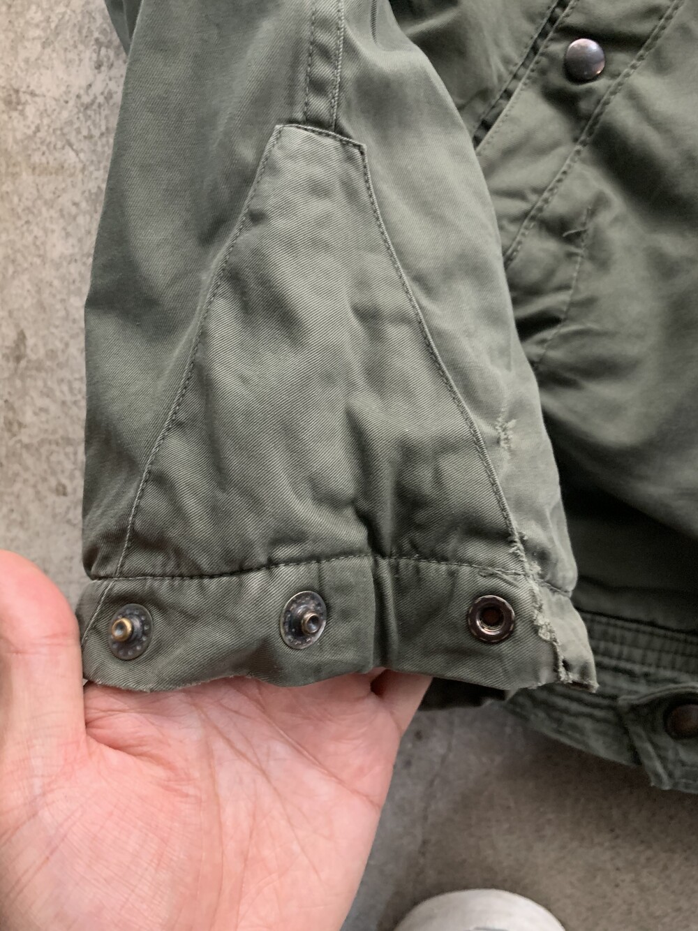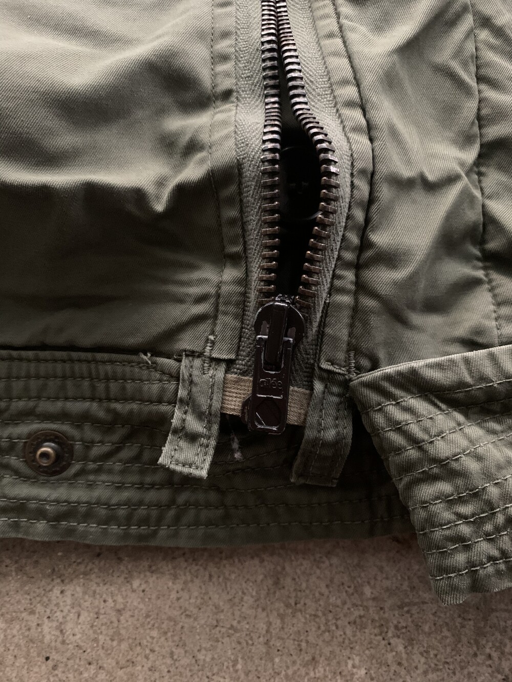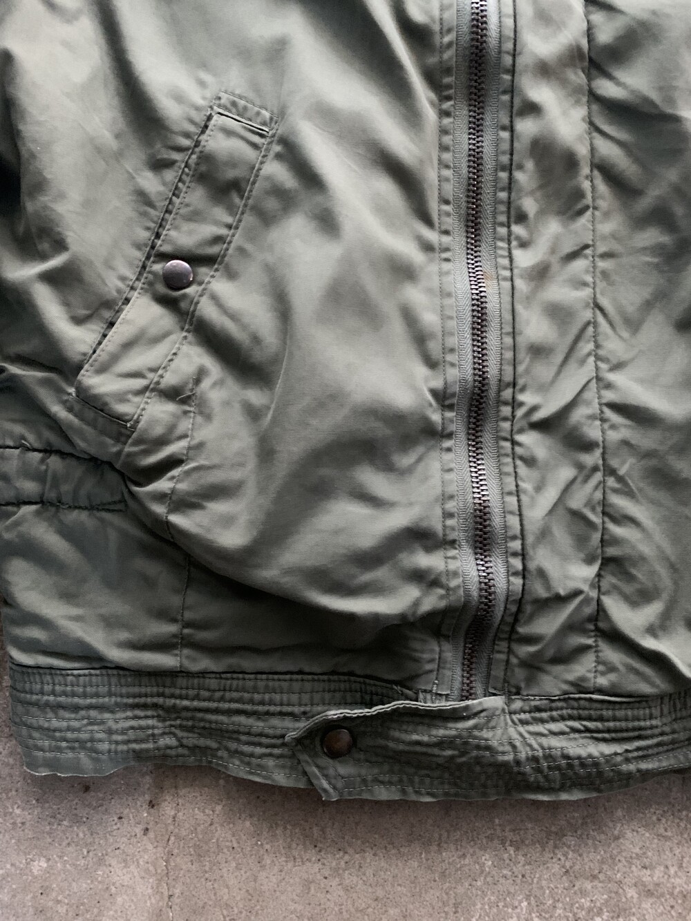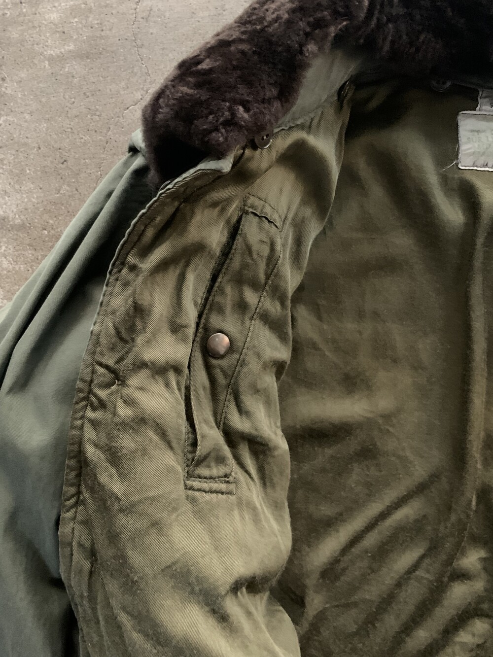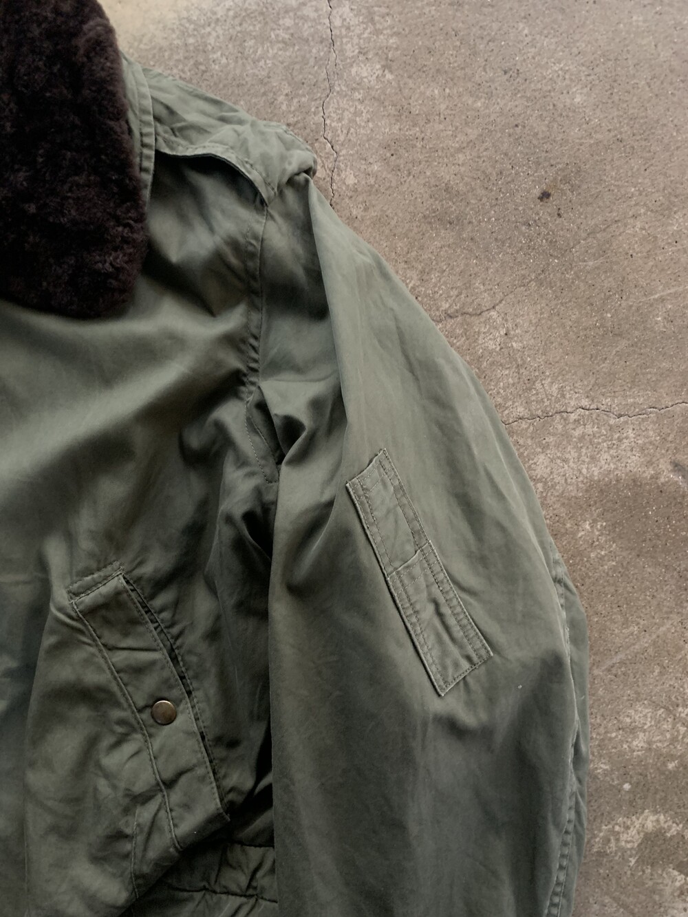 🚩Detail 군용 플라이트 자켓이 기존의 가죽 소재에서 코튼사틴이나 나일론 원단으로 변경되는 주된 이유 중 하나는 제트기의 보급되면서 파일럿 조종석이 좁아졌기 때문입니다. 프랑스군 역시 1950년대 후반 제트기 도입으로 새로운 플라이트 자켓을 선보였는데, 그 중에서도 스트랩과 버클로 조절하는 어드저스터가 사라지고 간편한 스냅 체결 방식으로 변경된 1960년대에서 1970년대 사이 생산 프링스 공군 플라이트 자켓입니다.