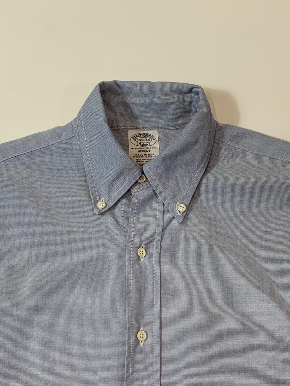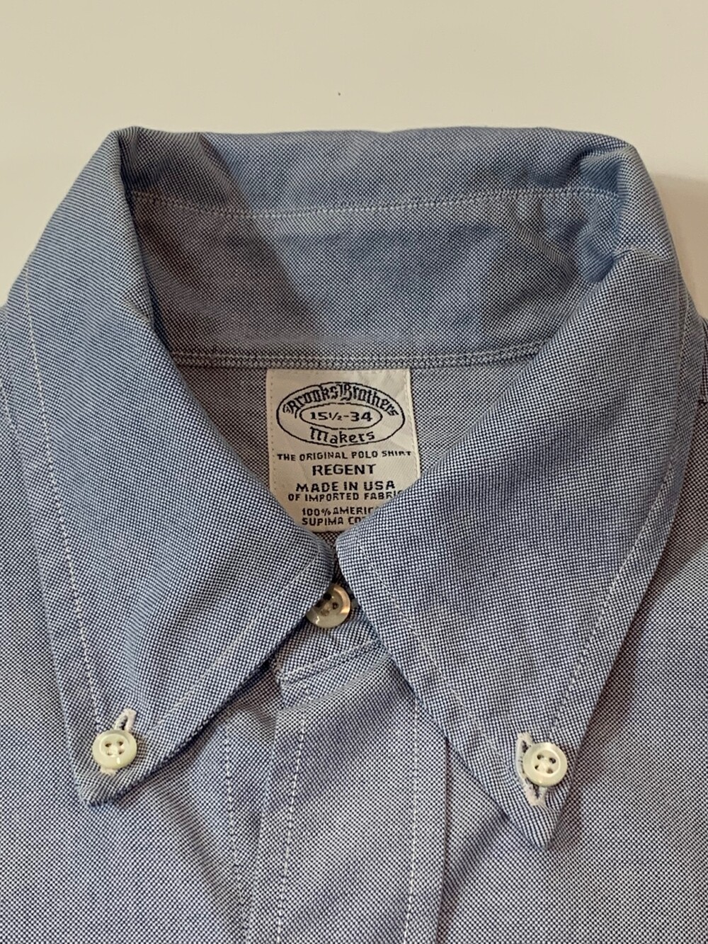 높은 넥밴드와 길게 잡아 뺀듯한 칼라, 그리고 얕은 요크라인이 클래식 버튼다운 셔츠의 표본이라 할 수 있는 브룩스 브라더스 메이커스(Makers) 라인의 옥스포드 클로스 버튼다운 셔츠입니다. 널리 알려진 브룩스 브라더스의 OCBD 셔츠와 달리 전면 포켓이 생략되고 조금 더 슬림한 인상이 강한 리젠트(REGENT) 라인으로, 캐주얼하게 혹은 포멀하게 어느쪽이든 활용하기 좋을만한 블루 컬러 셔츠입니다.