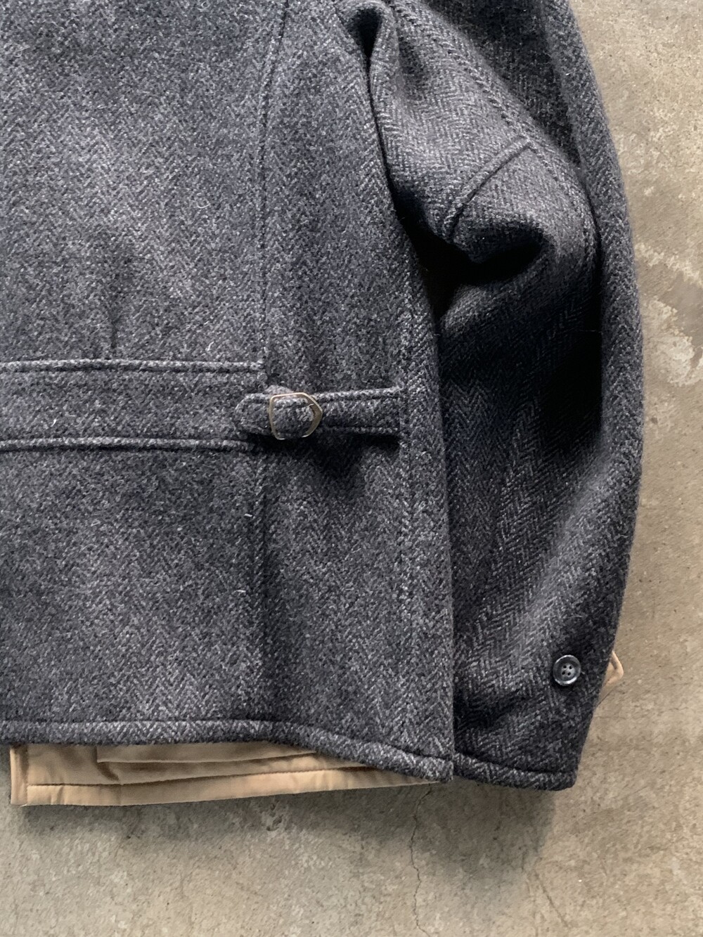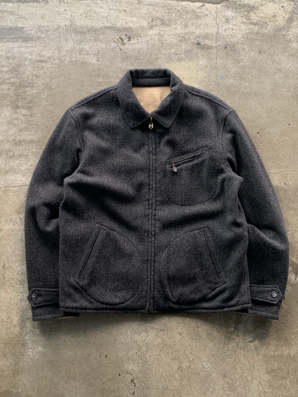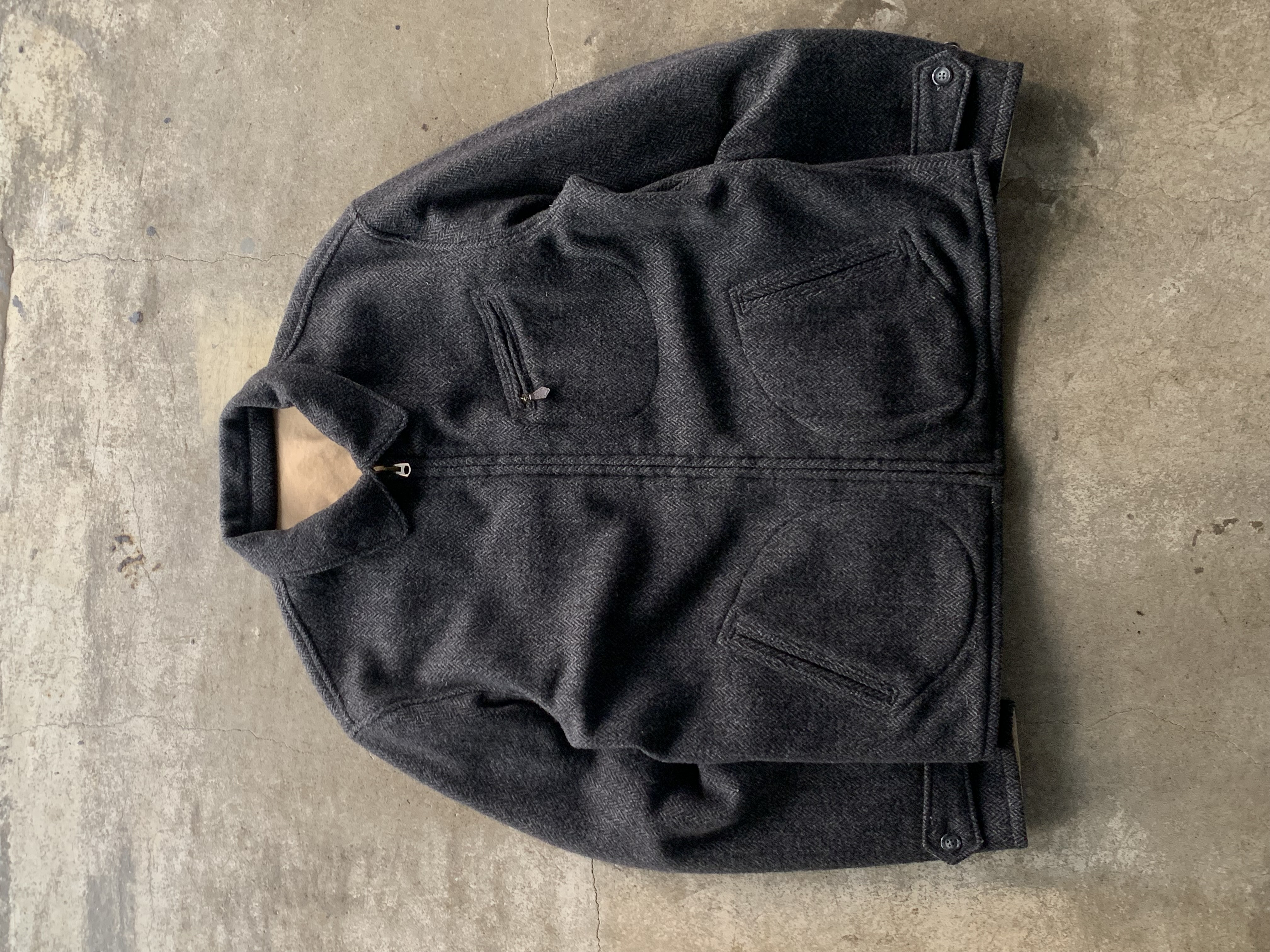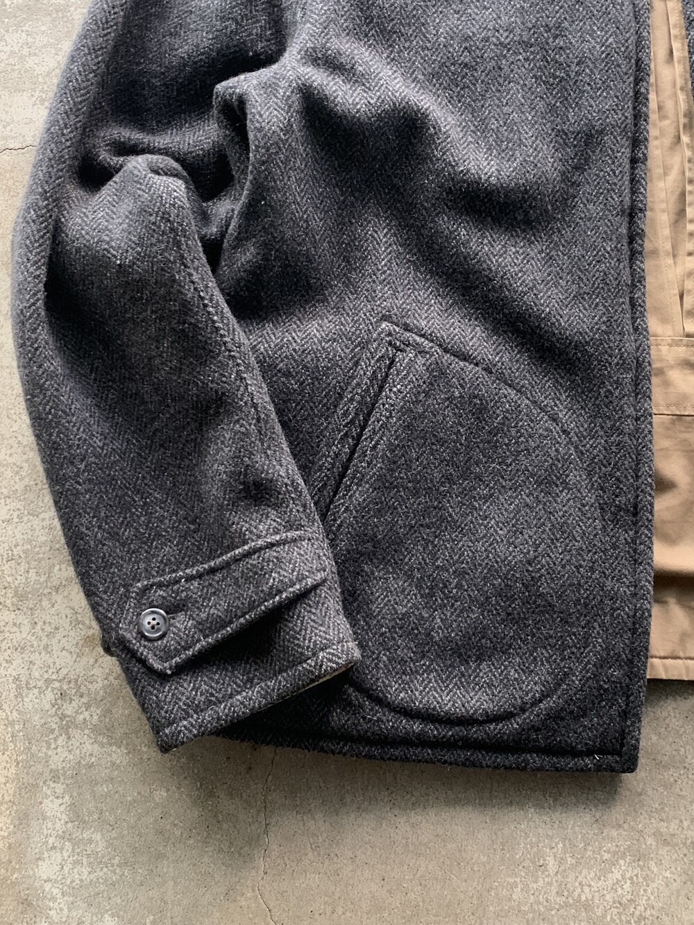 울 헤링본 겉감 상단부 포켓 입구 부분 미세한 헤진 흔적이 있는, 사용감 있는 제품.