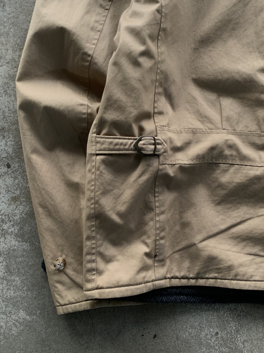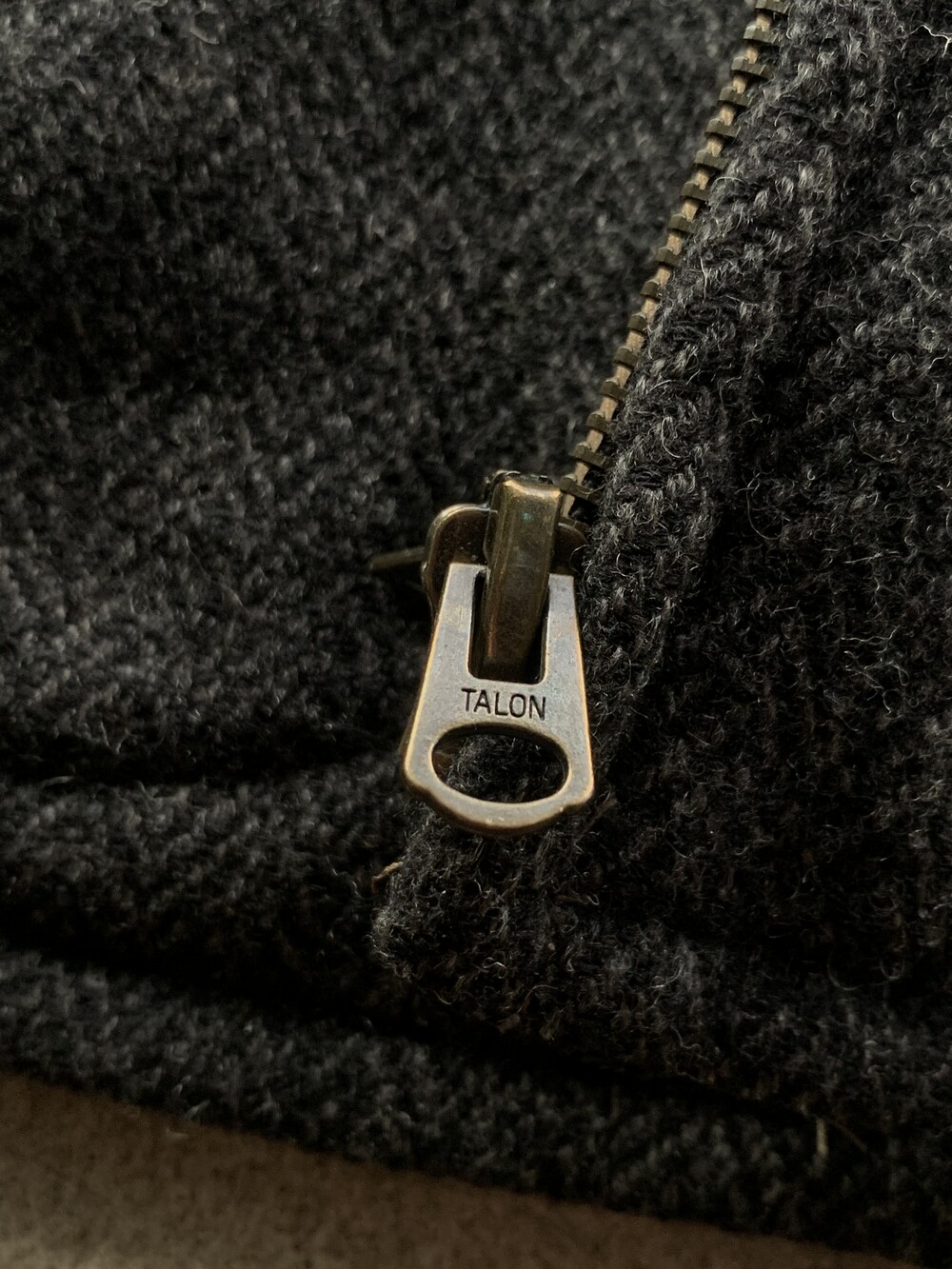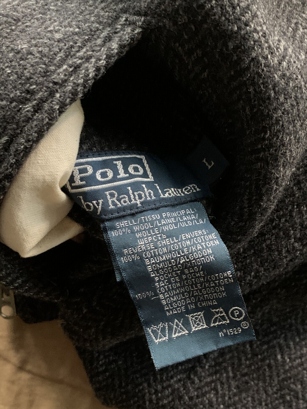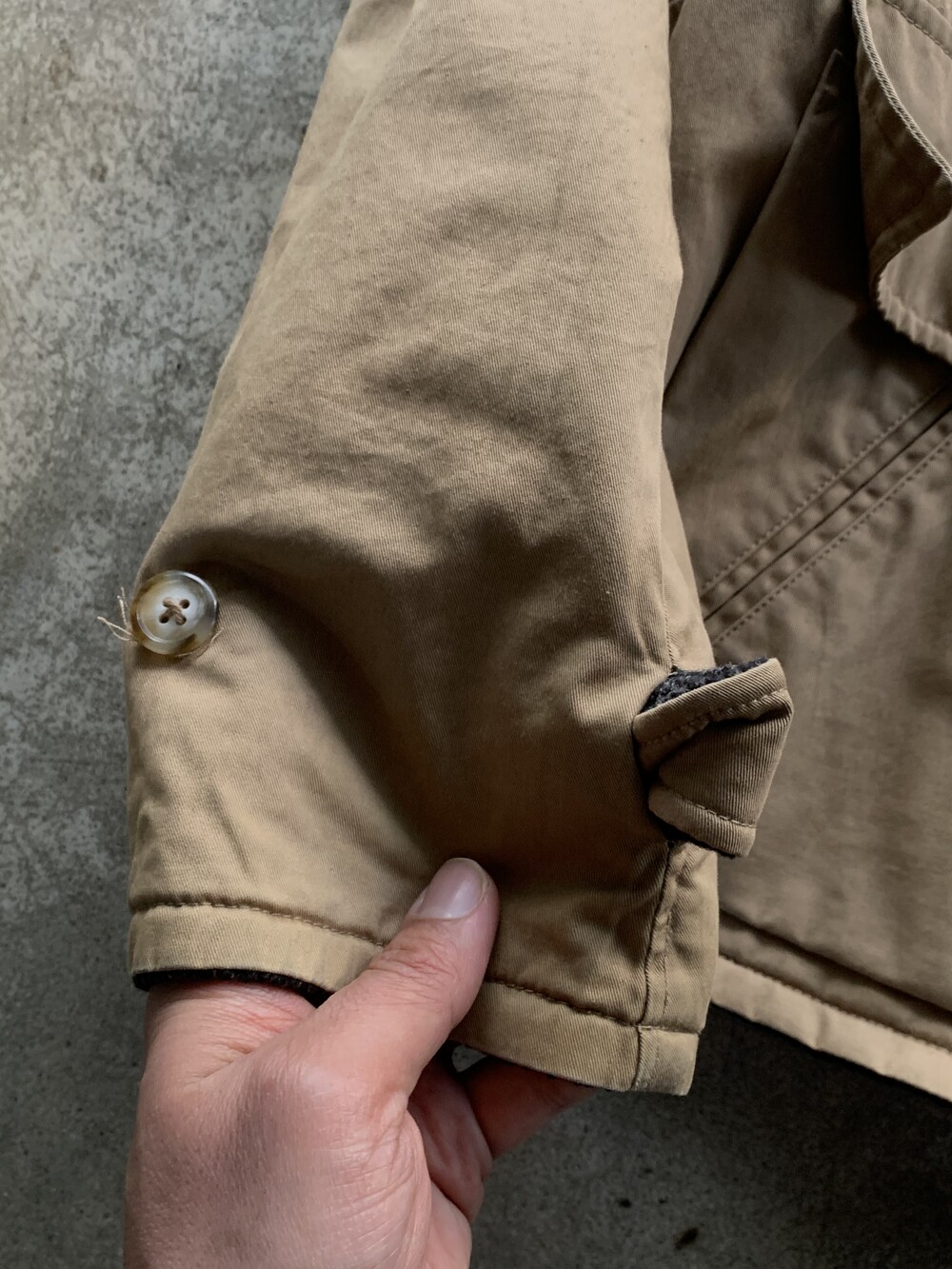 울 헤링본 겉감 상단부 포켓 입구 부분 미세한 헤진 흔적이 있는, 사용감 있는 제품.