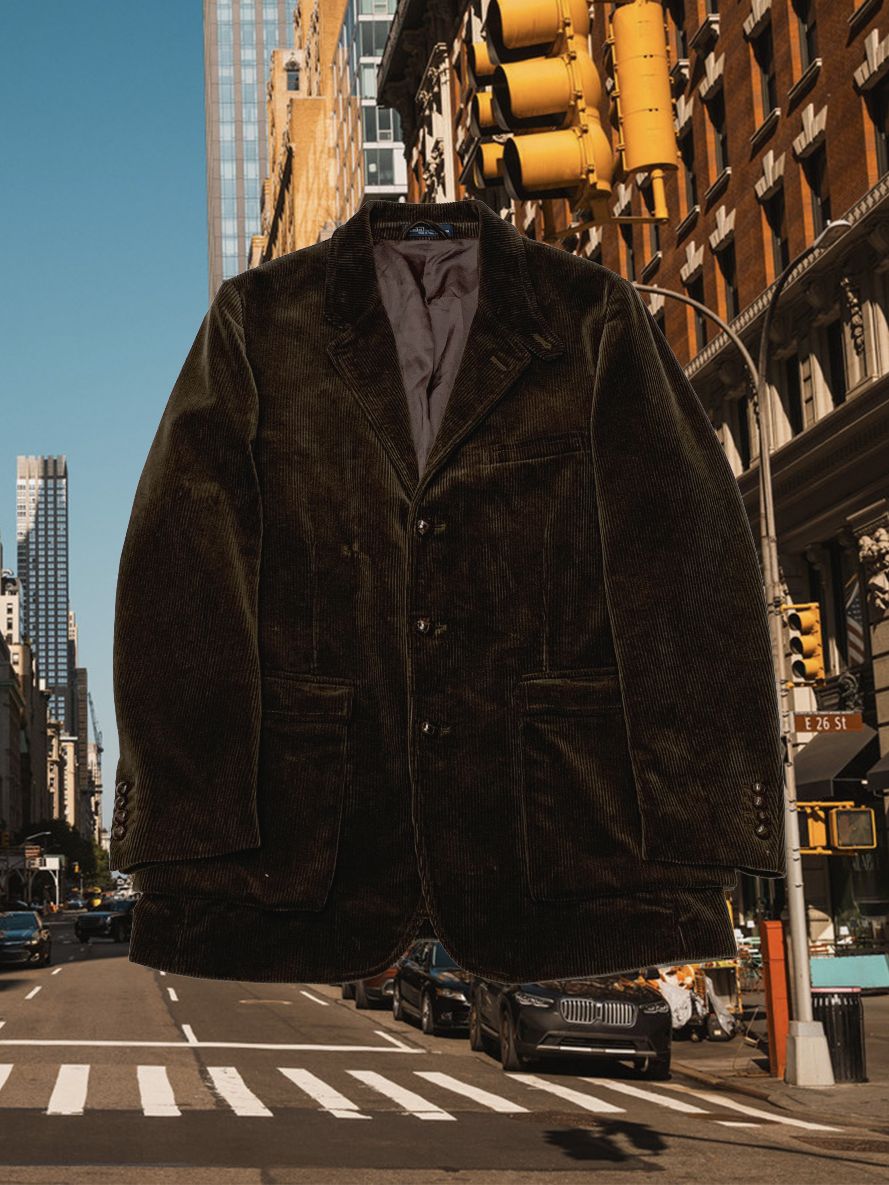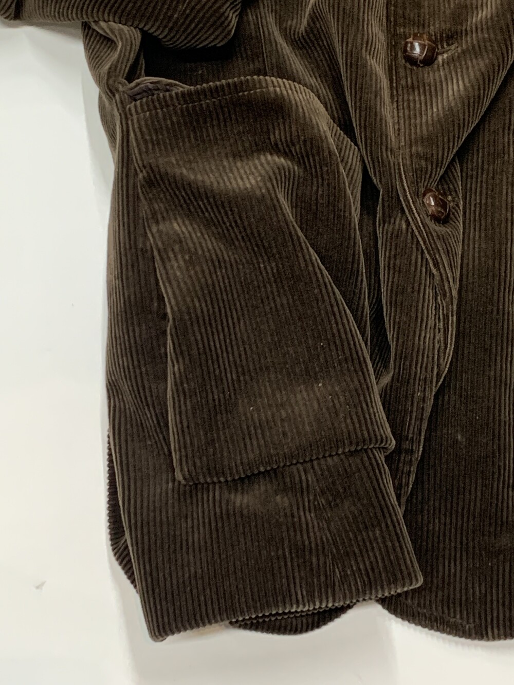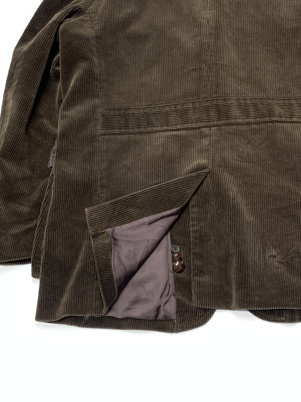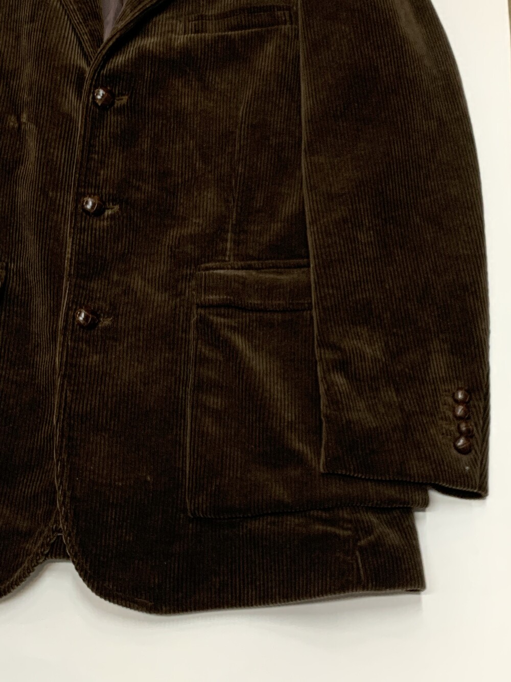 골이 깊고 두께감이 있는 코듀로이 원단 특유의 묵직함이 두드러지는 폴로 랄프로렌의 3버튼 스포츠자켓입니다. 깊지 않은 V존과 더불어 실제로 착용했을 때 화면에서 보이는 것보다 입체적인 전면 하단부 아웃포켓 덕분에 캐주얼하게 착용하기 좋을만한 제품입니다. 원단이 두께감이 있다보니 평직 원단의 셔츠보다는 옥스포드 클로스나 데님 셔츠, 혹은 스웻류나 청키한 니트와 조합해도 좋을만한 제품입니다.
