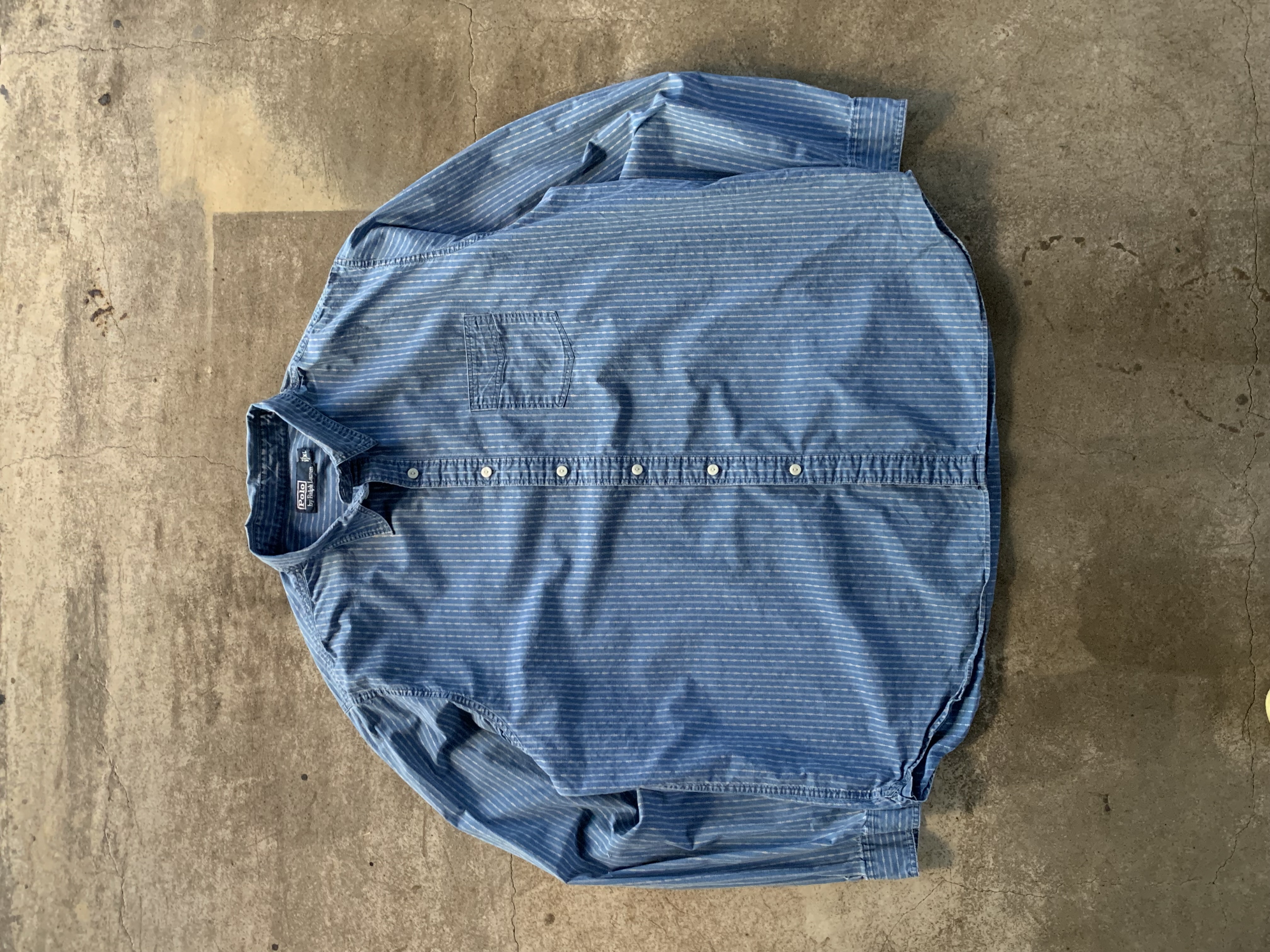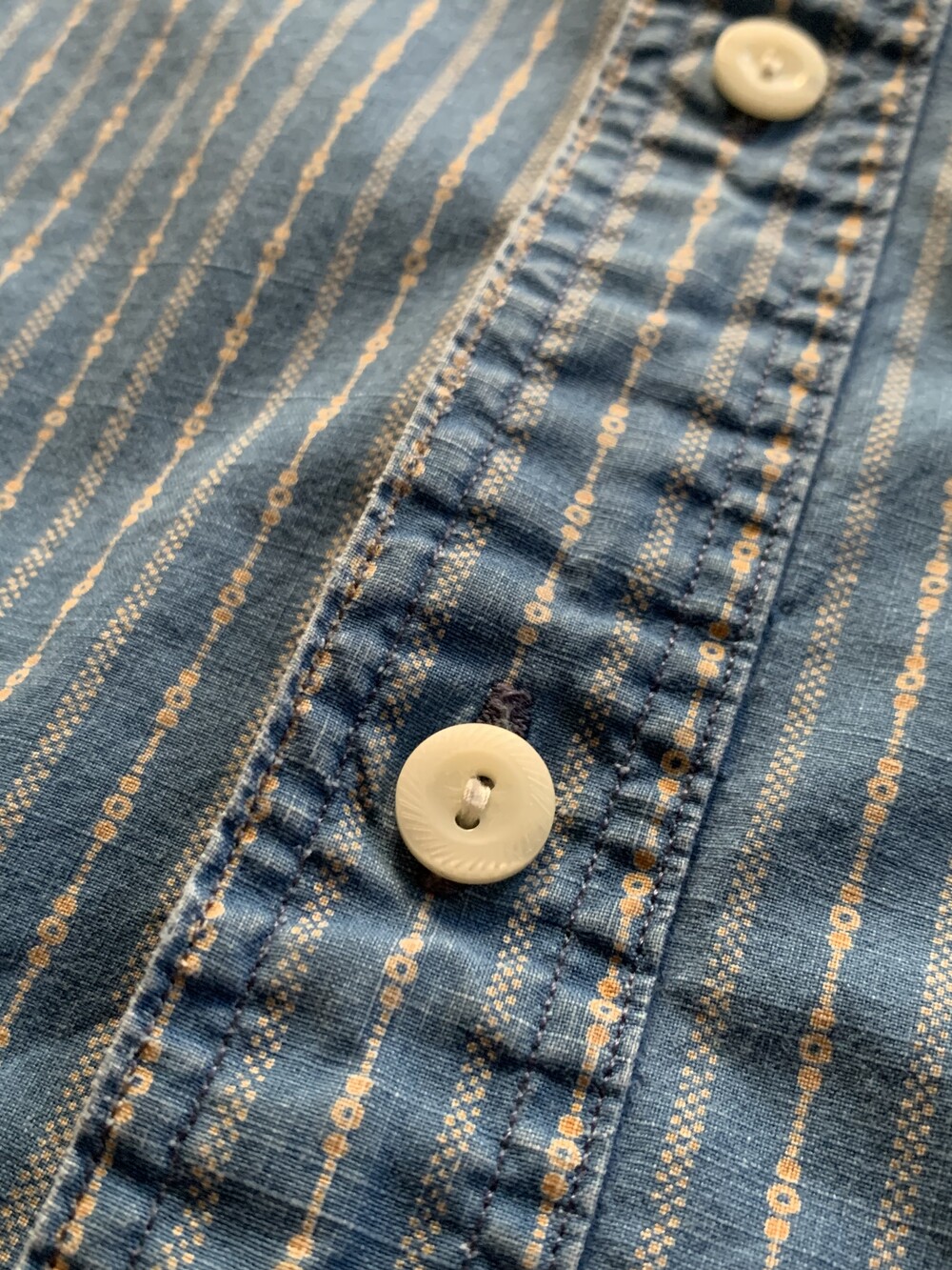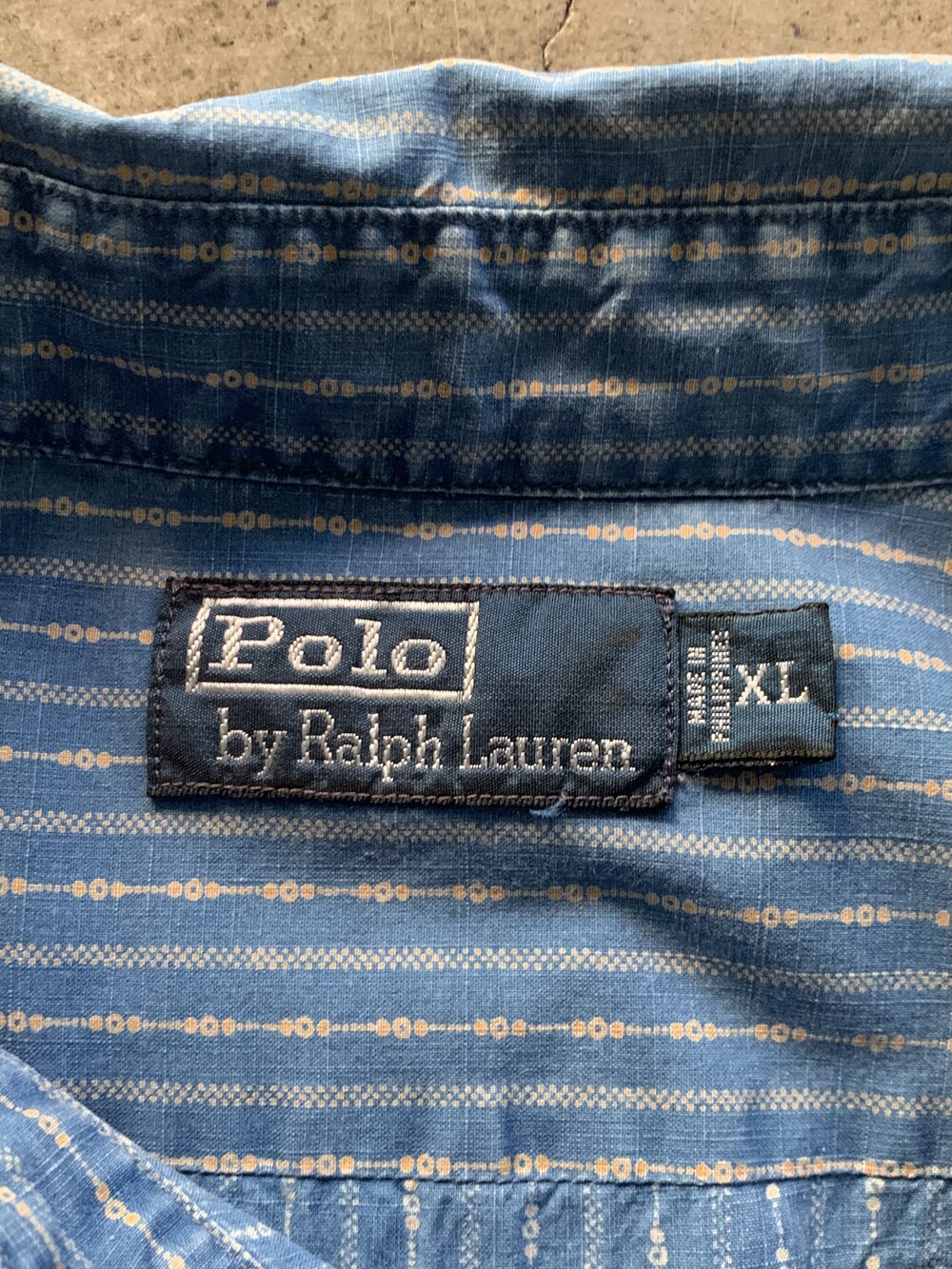 크고 작은 도트로 구성된 스트라이프 패턴, 넥라인 친 스트랩, 단추 디테일 등 전반적으로 네이티브 아메리칸 스타일을 캐주얼하게 즐길 수 있을만한 폴로 랄프로렌의 코튼 포플린 셔츠. 전반적으로 여유로운 사이즈로 다양한 착장에 활용하기 좋을만한 제품입니다.