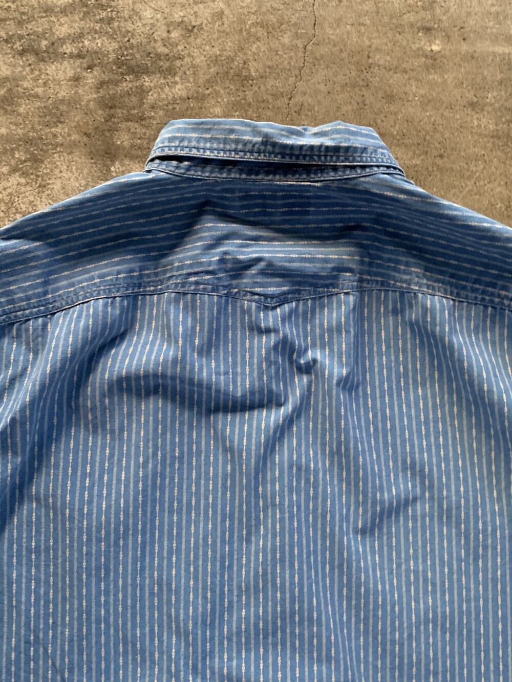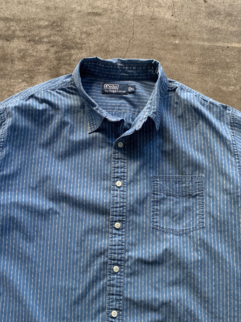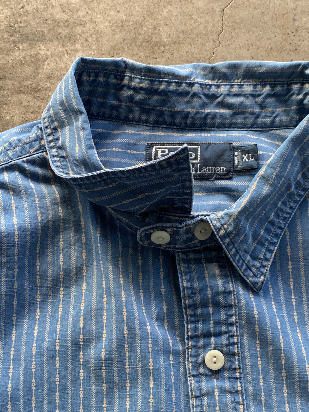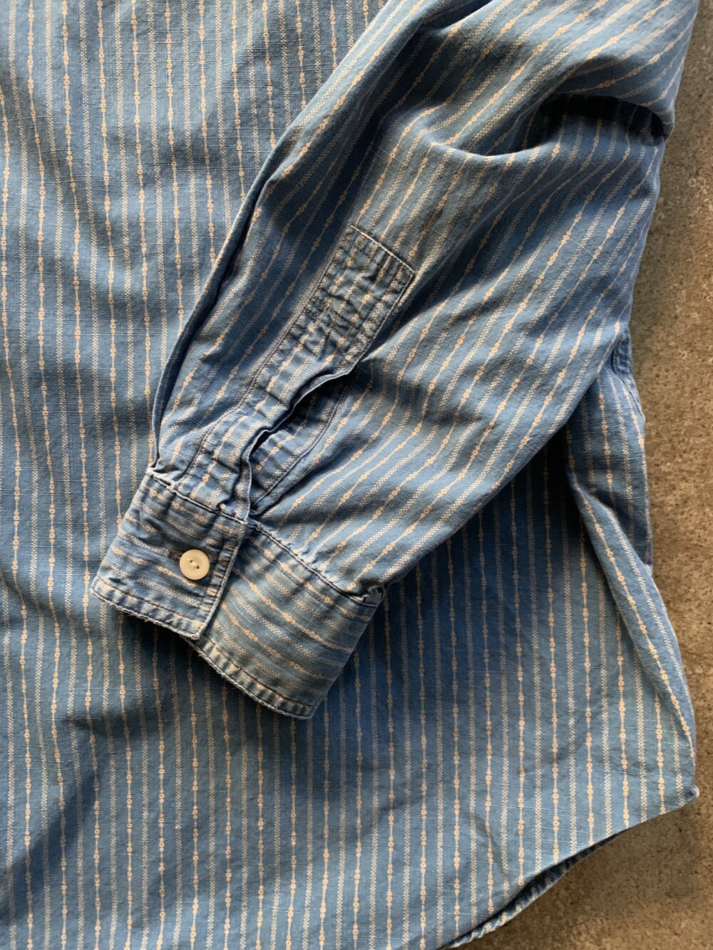 크고 작은 도트로 구성된 스트라이프 패턴, 넥라인 친 스트랩, 단추 디테일 등 전반적으로 네이티브 아메리칸 스타일을 캐주얼하게 즐길 수 있을만한 폴로 랄프로렌의 코튼 포플린 셔츠. 전반적으로 여유로운 사이즈로 다양한 착장에 활용하기 좋을만한 제품입니다.