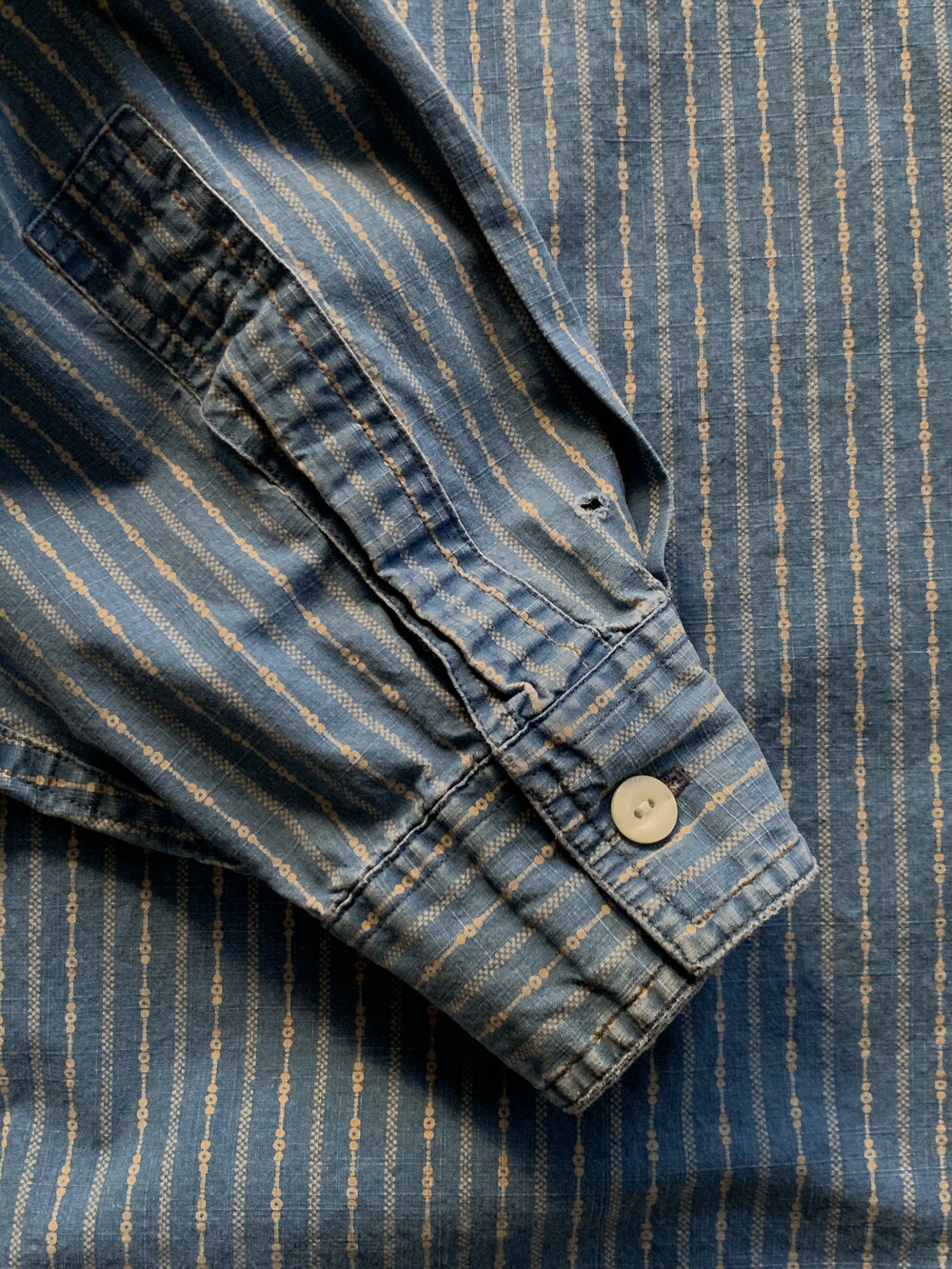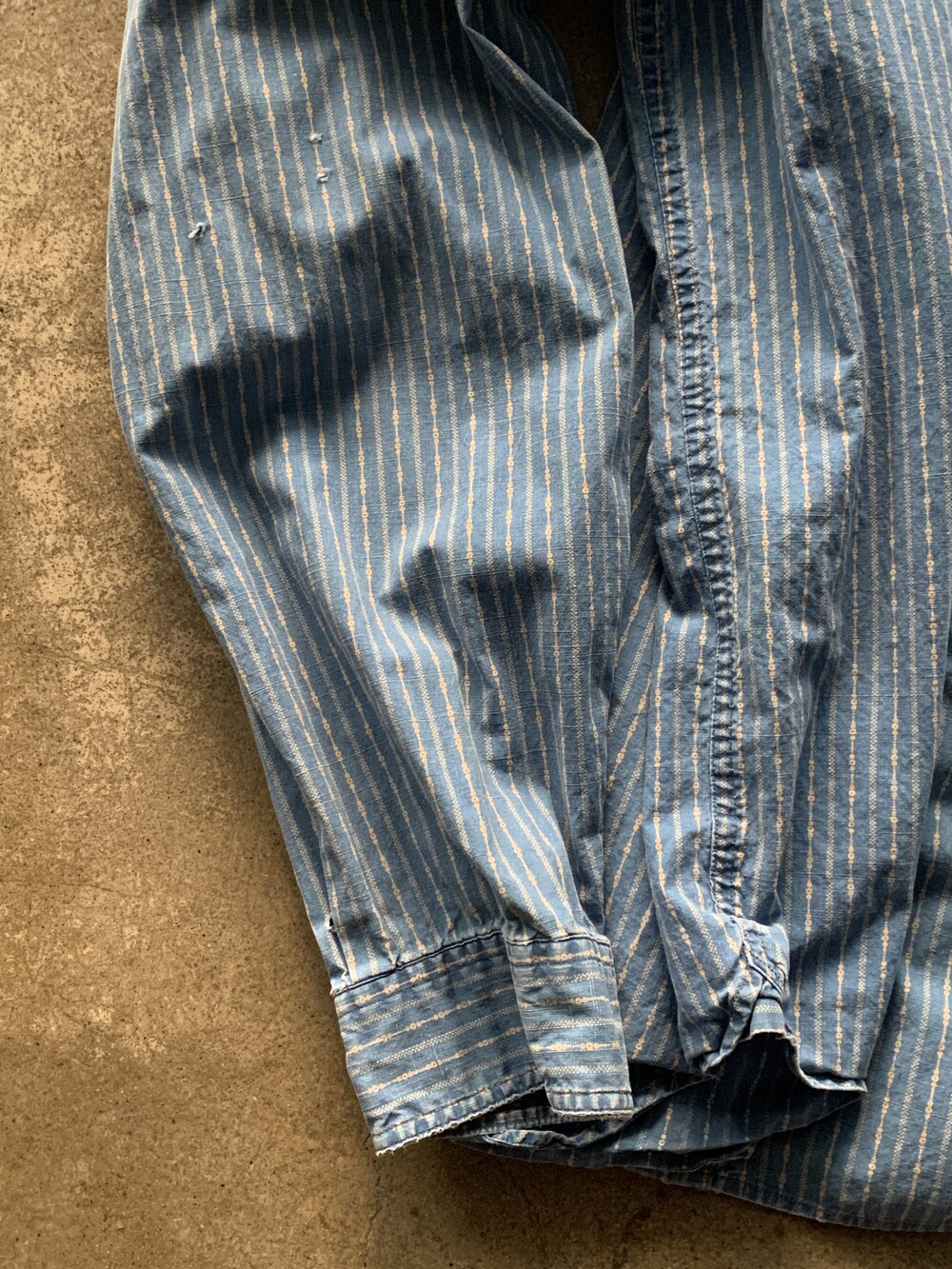 소매 중간 부분과 커프스 부근 핀홀이 있으며 커프스 가장자리 부분 닳아 헤진 흔적이 남은, 사용감 있는 제품.