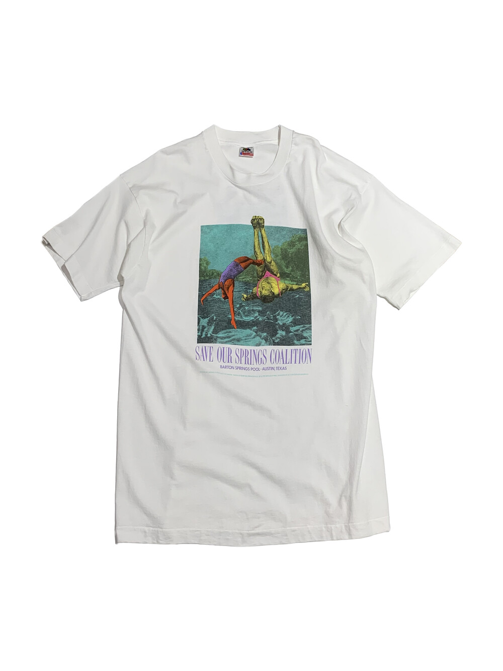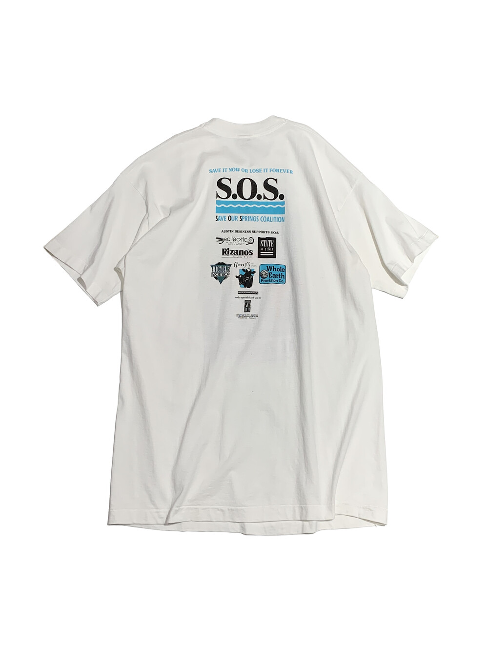 SOSC를 위해 제작된 JAGMO의 작품이 전면에, SAVE OUR SPRINGS COALITION을 비롯한 뜻을 함께 하는 환경 보호 단체와 로컬 샵들이 후면에 프린팅된, 전후면 프린팅 조합이 독특한 아트 티셔츠입니다. 포스터 이미지가 제법 실효성이 있었는지 이후에 발매된 티셔츠 역시 동일한 프린팅을 사용하는데, 1997년 SAVE OUR SPRINGS ALLIANCE로 단체 이름을 변경하여 프린팅이 되는지라 해당 제품은 1992-1997년 사이 비영리단체 초창기에 프린팅된 제품으로 추정됩니다.