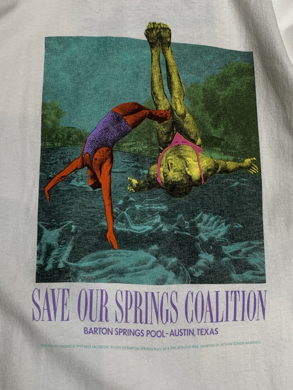 1990년 텍사스 주 오스틴에서 바턴 강 개발에 반대하는 모임으로 시작한 비영리단체 SAVE OUR SPRINGS COALITION도 일찍이 이를 깨달았던 것일까요. 1992년에 연합을 결성하고 개발로 인한 강물과 대수층의 수질오염의 경각심을 일깨우고 뜻을 함께하는 사람들을 모으고자, JAGMO라는 활동명을 쓰는 포스터 아티스트 넬스 제이콥스(Nels Jacobson)에게 의뢰하여 포스터를 제작합니다. 바턴 강에서 평화로이 한때를 보내는 사람들의 사진 위에 수영복을 입고 다이빙을 하는듯한 이미지가 겹쳐진 포스터는 짐작건대 자연환경을 파괴하는 행위로 잃게 될 일상의 소중함을 어필하는 내용이 아닐까 싶습니다.