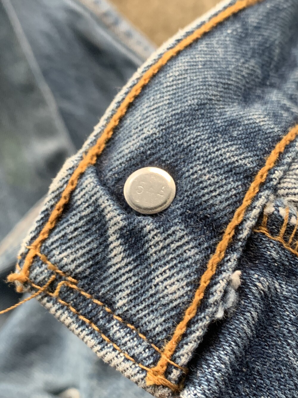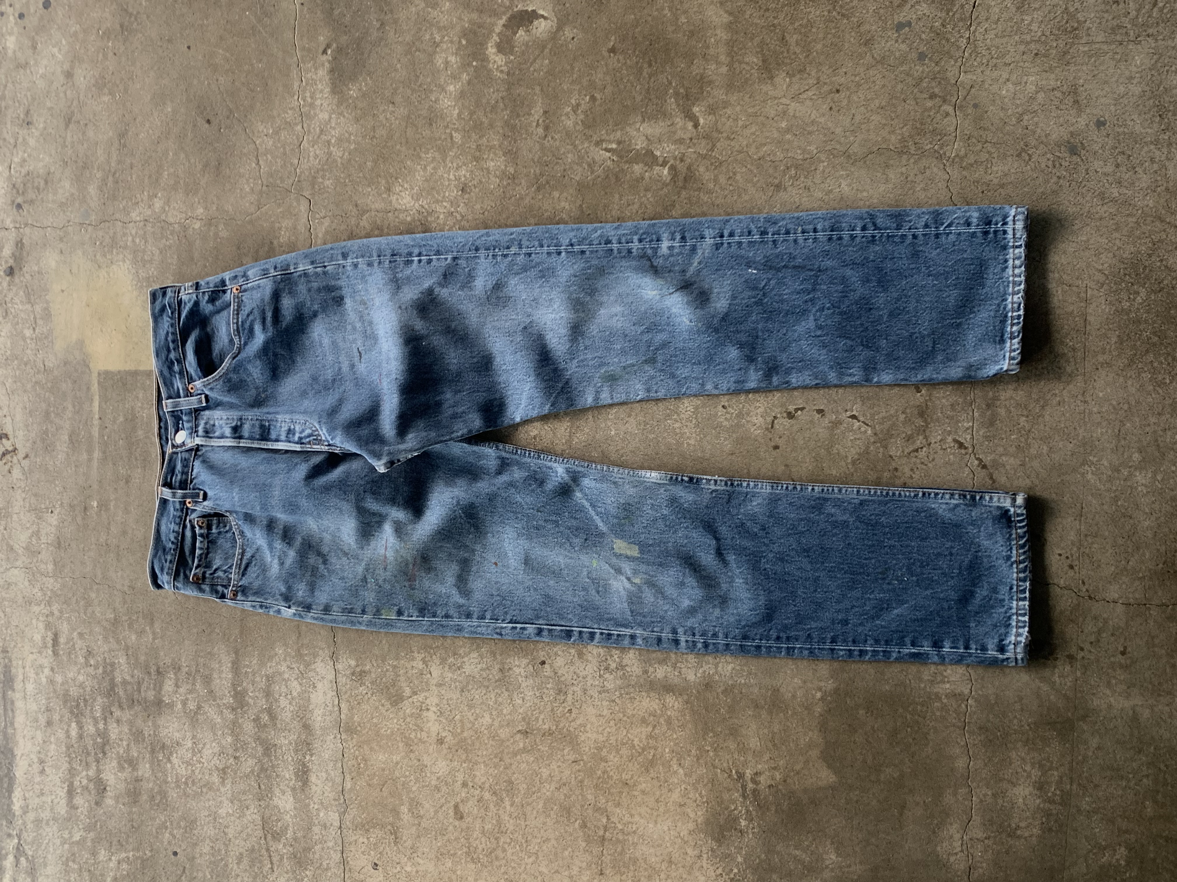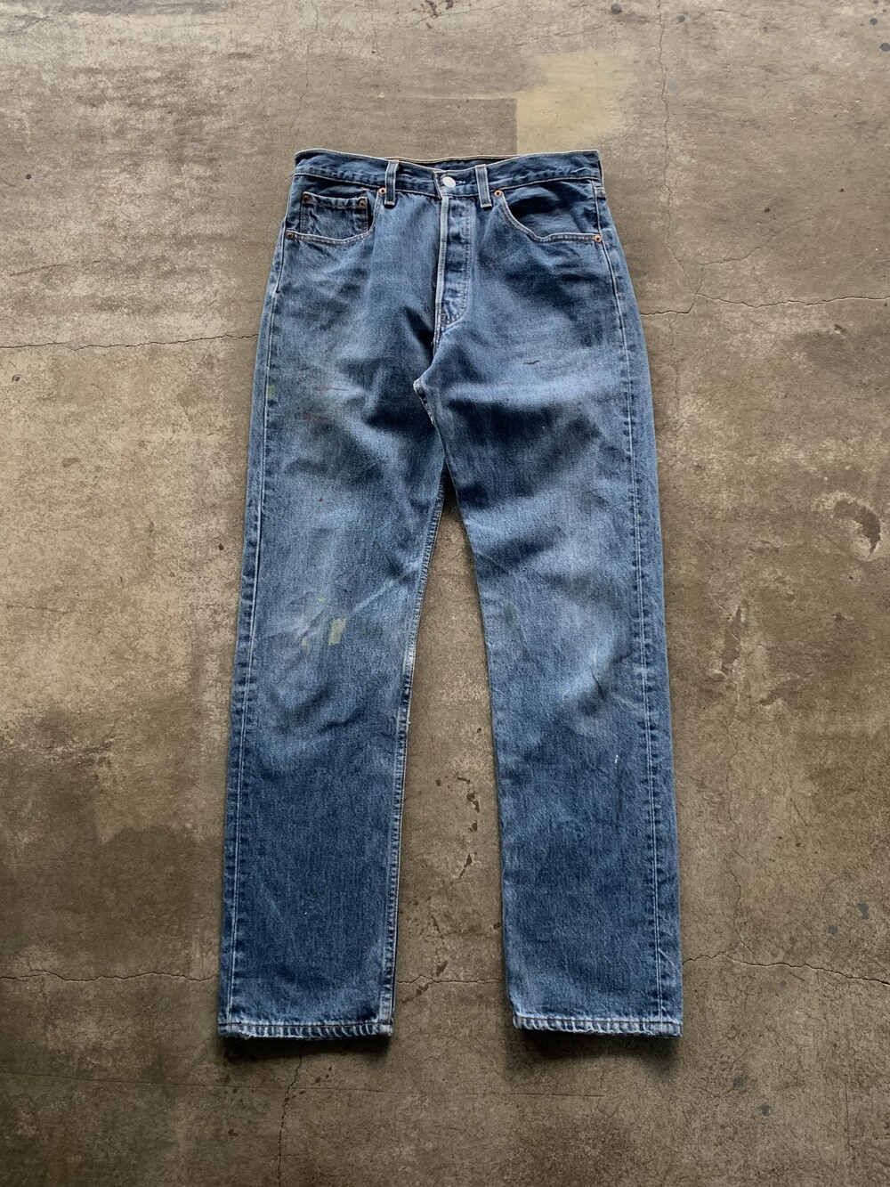 🚩Detail 택은 유실되어 정확한 연식은 알 수 없으나 원단감과 뒷면 종이패치로 미루어 1990년대 생산으로 추정되는 미국 생산 리바이스 501 데님팬츠입니다. 리바이스를 대표하는 버튼플라이 사양의 클래식한 슬림 스트레이트 실루엣의 팬츠로, 전면 여러가지 색깔 조합이나 과하지 않은 페인트 얼룩과 대비가 크지 않은 페이딩 조합이 돋보이는 제품입니다. 발등에 브레이킹이 걸려 내추럴하게 착용하기 좋을만한 제품으로 허리 30인치 전후 착용하는 분들에게 권장드립니다.