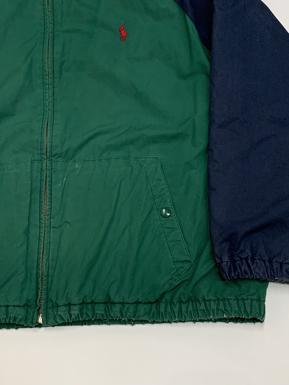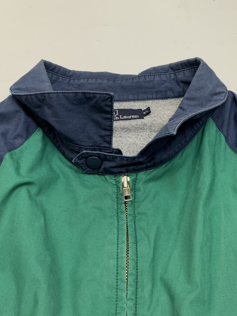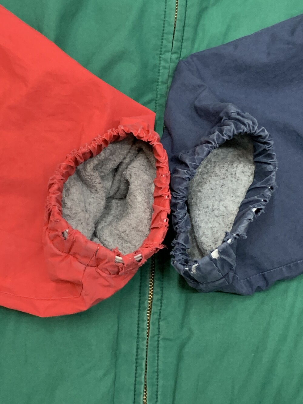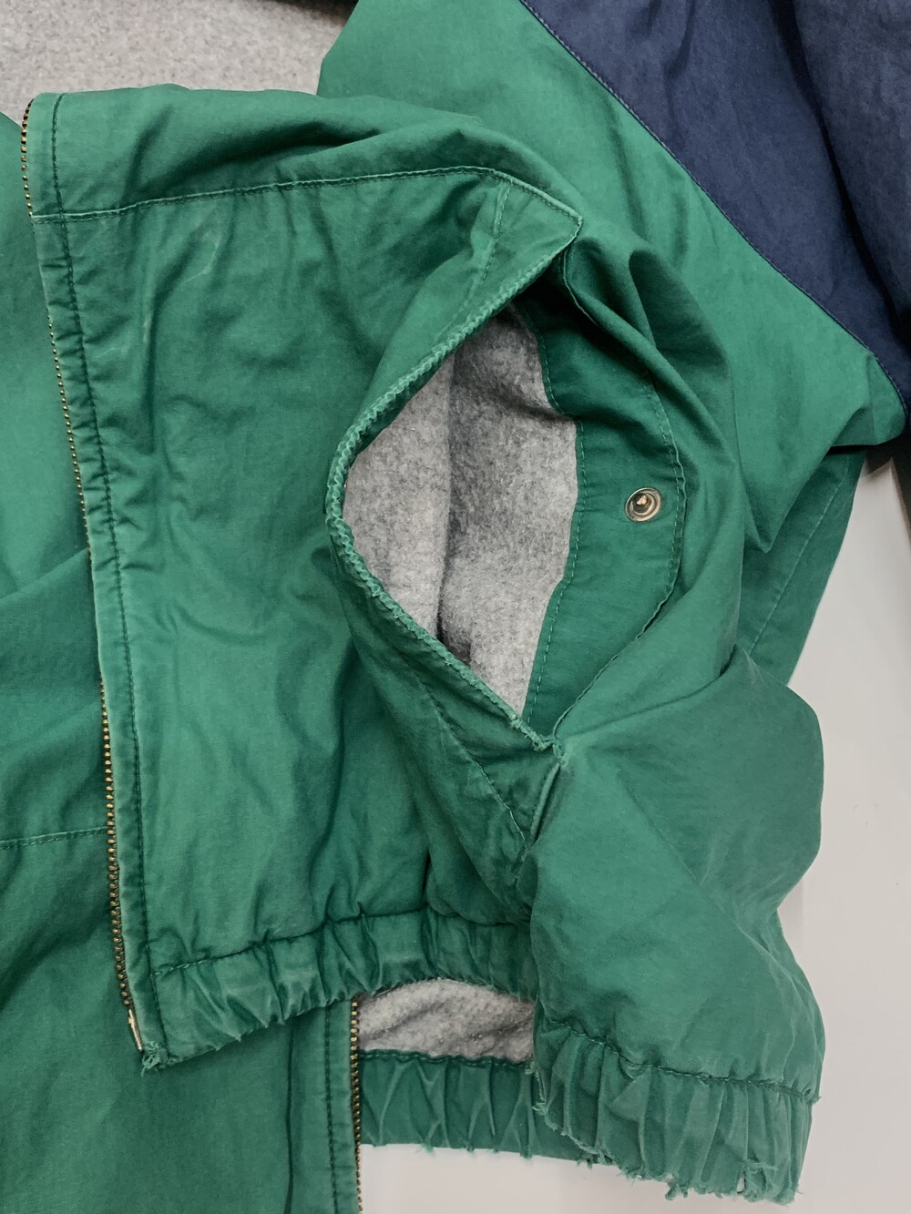 겉면은 요철감이 거의 없는 코튼 포플린 원단, 안쪽은 플리스 소재 라이닝이 붙는 블루종 형태의 자켓. 전반적인 형태는 베이포트 자켓을 연상시키나 그린&네이비 투톤 컬러를 베이스로 비대칭형 컬러 블록이 들어가는, 캐주얼한 인상이 강한 제품입니다.