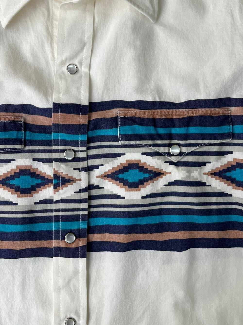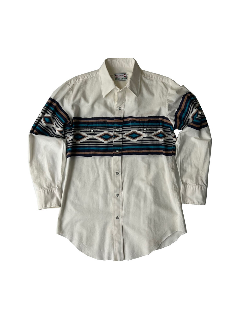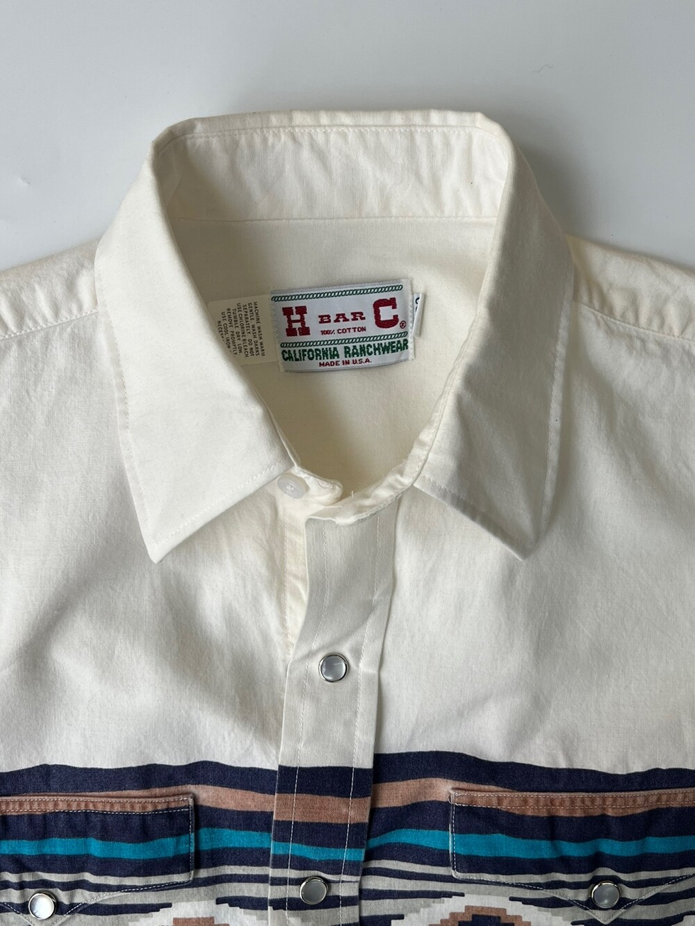 전면 스냅버튼, 네이티브 아메리칸 무드의 패턴 등의 디테일이 돋보이는 랜치웨어(Ranchwear) 브랜드 H BAR C 의 코튼 소재 웨스턴 셔츠입니다. 코튼 100% 혼용률의 제품으로, 나일론 혹은 폴리 소재의 올드 사양의 웨스턴셔츠에 비해 부담없이 입을 수 있는 제품입니다.