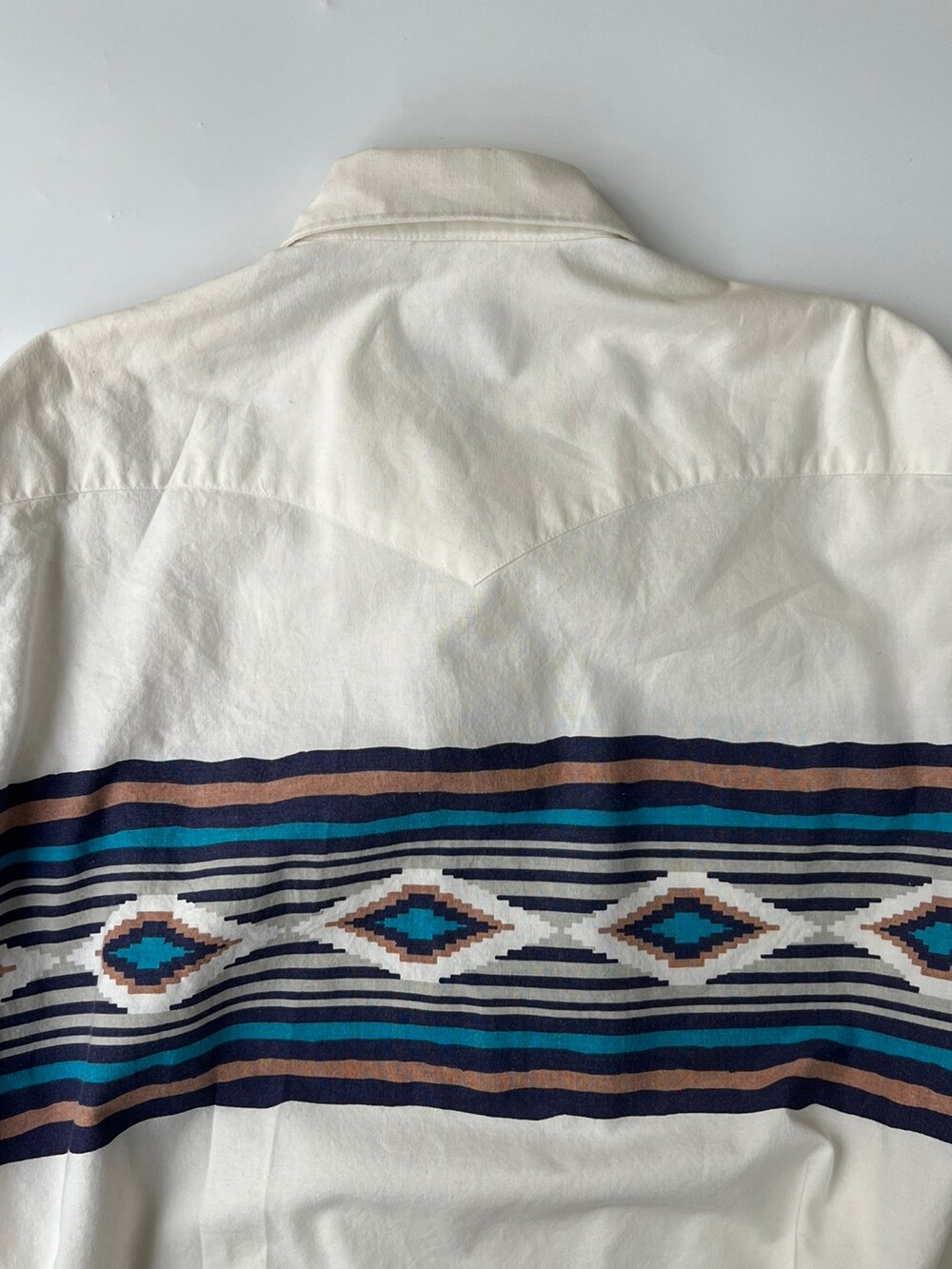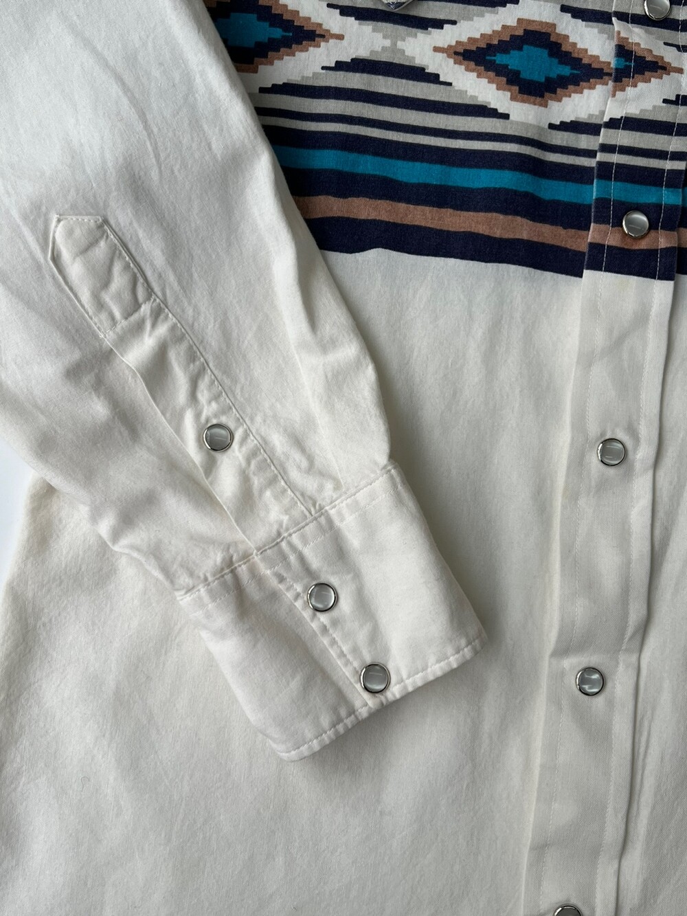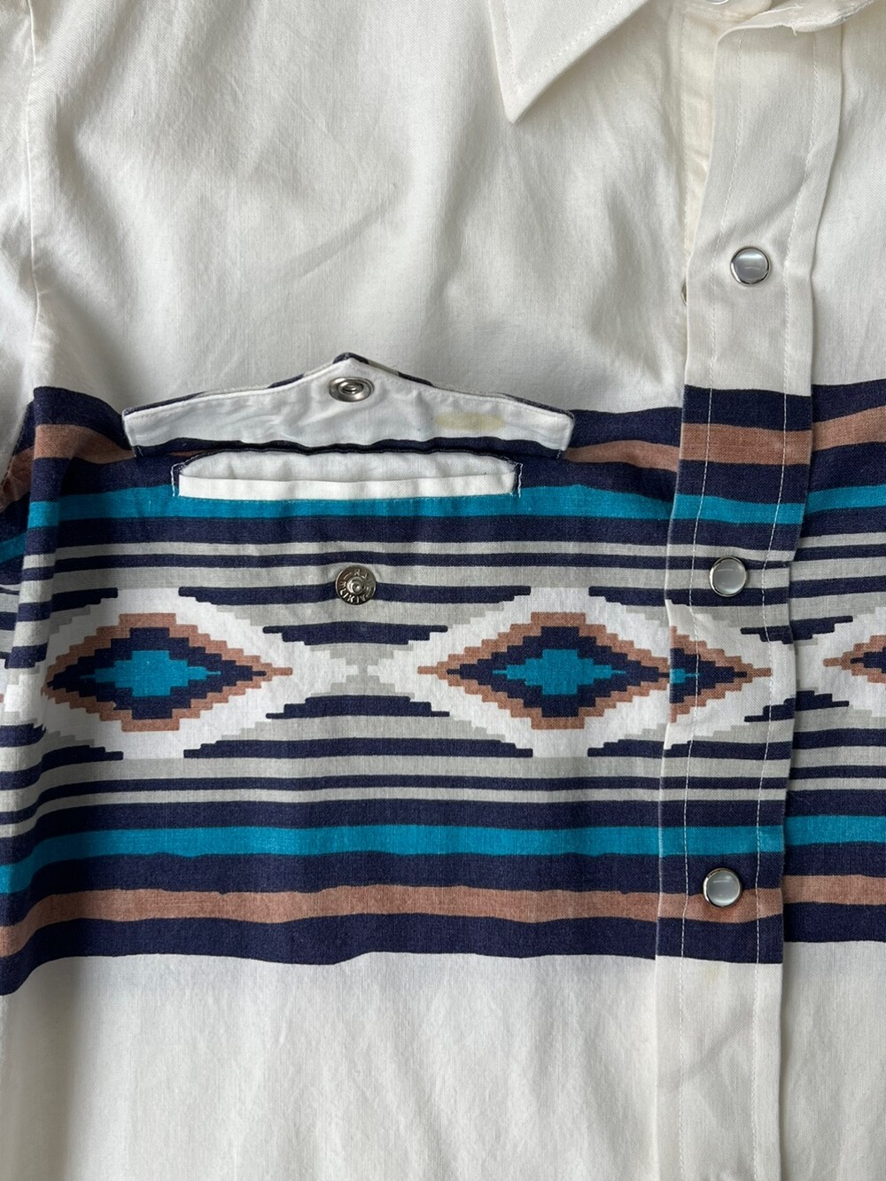 전면 스냅버튼, 네이티브 아메리칸 무드의 패턴 등의 디테일이 돋보이는 랜치웨어(Ranchwear) 브랜드 H BAR C 의 코튼 소재 웨스턴 셔츠입니다. 코튼 100% 혼용률의 제품으로, 나일론 혹은 폴리 소재의 올드 사양의 웨스턴셔츠에 비해 부담없이 입을 수 있는 제품입니다.