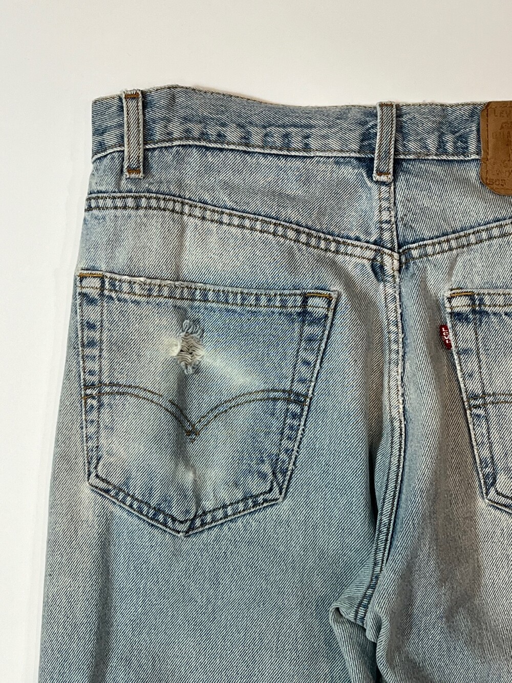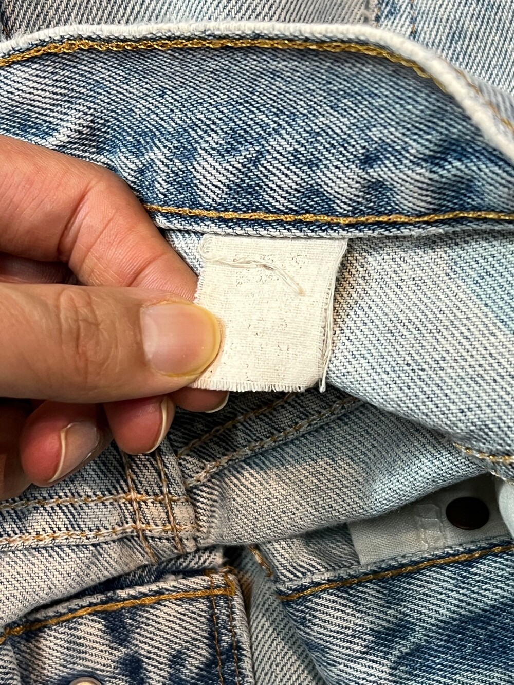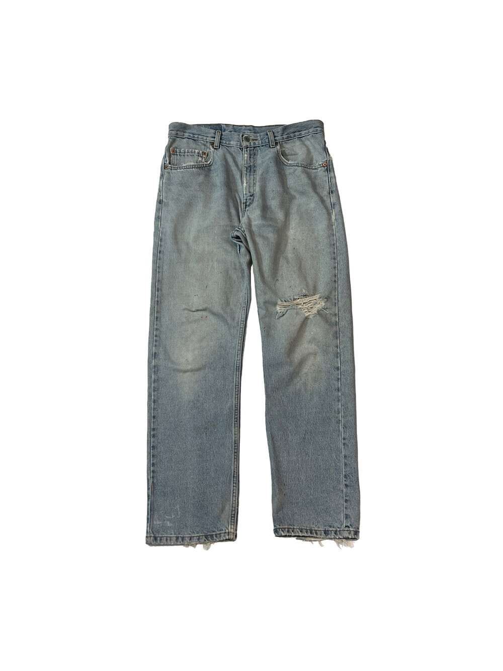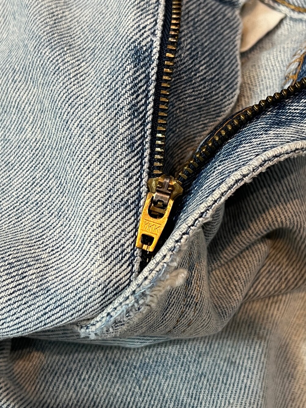 레귤러 스트레이트 실루엣이 돋보이는 리바이스의 505 데님팬츠. 라벨이 흐려져 정확한 연식을 확인할 수 없으나, 원단, 페이딩 양상, 탑버튼 각인 등을 고려했을 때 제 3국 생산 제품으로 추정됩니다. 푸른 인디고 컬러가 어느정도 남은 연청 컬러로, 군데군데 보이는 디스트레스트 디테일과 데님 컬러조합이 매력적인 제품.
