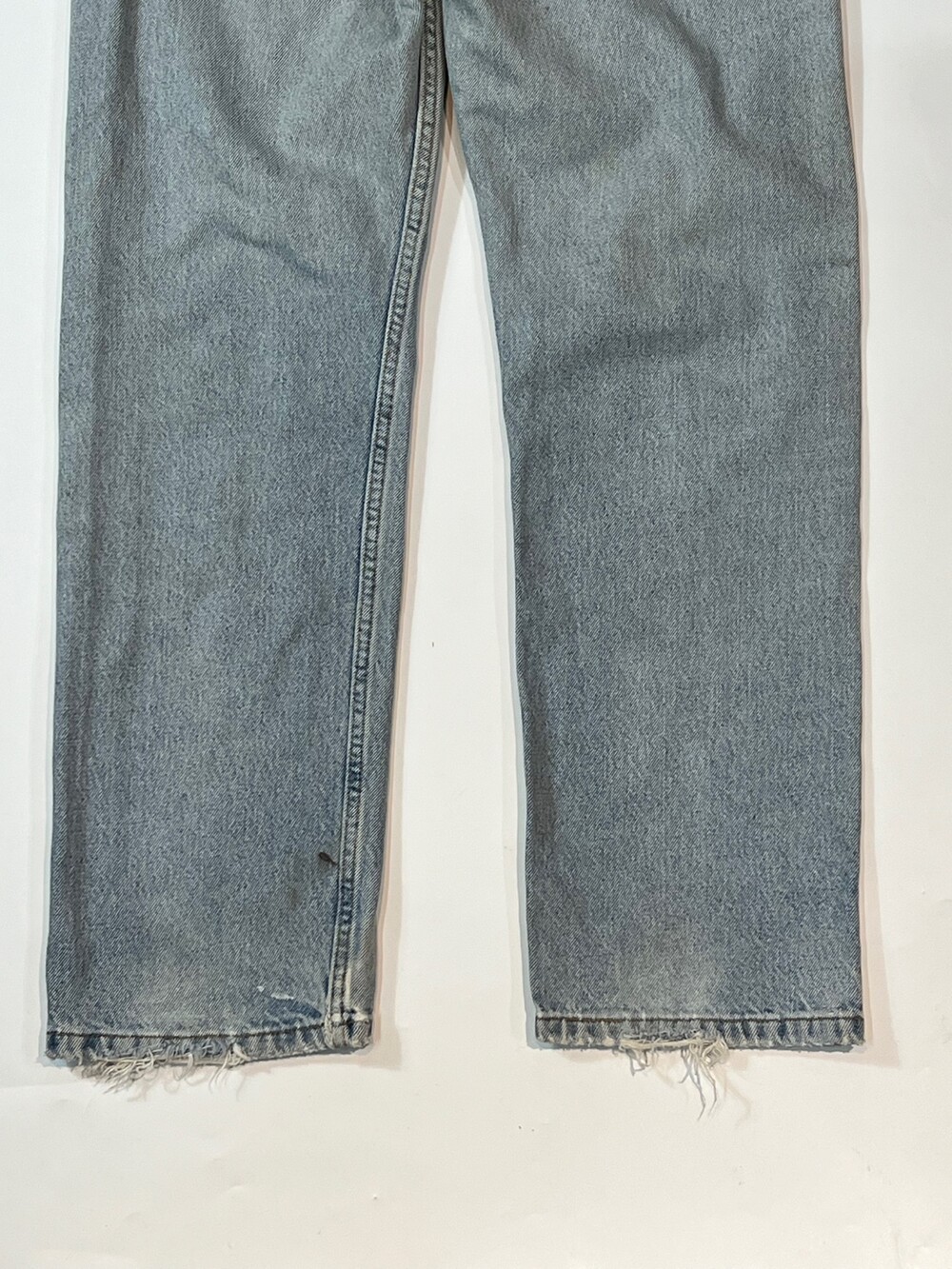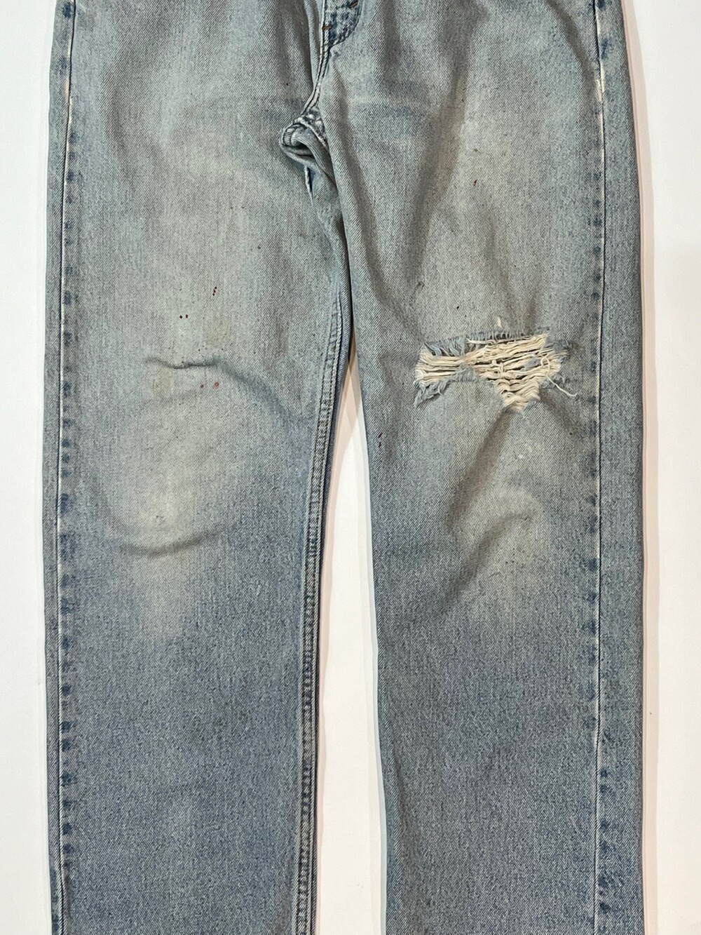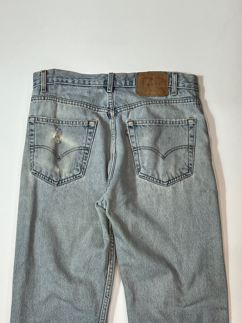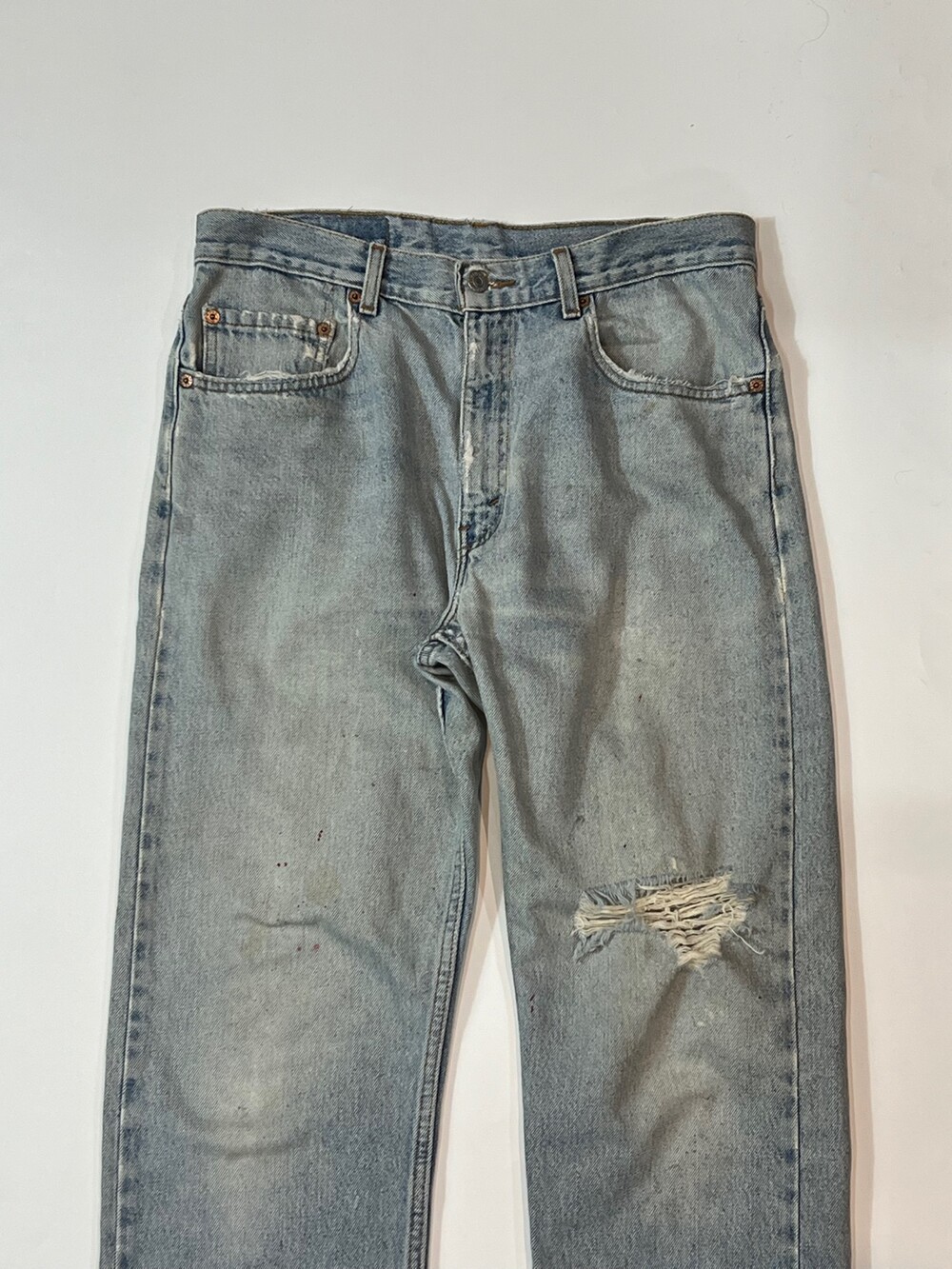 레귤러 스트레이트 실루엣이 돋보이는 리바이스의 505 데님팬츠. 라벨이 흐려져 정확한 연식을 확인할 수 없으나, 원단, 페이딩 양상, 탑버튼 각인 등을 고려했을 때 제 3국 생산 제품으로 추정됩니다. 푸른 인디고 컬러가 어느정도 남은 연청 컬러로, 군데군데 보이는 디스트레스트 디테일과 데님 컬러조합이 매력적인 제품.