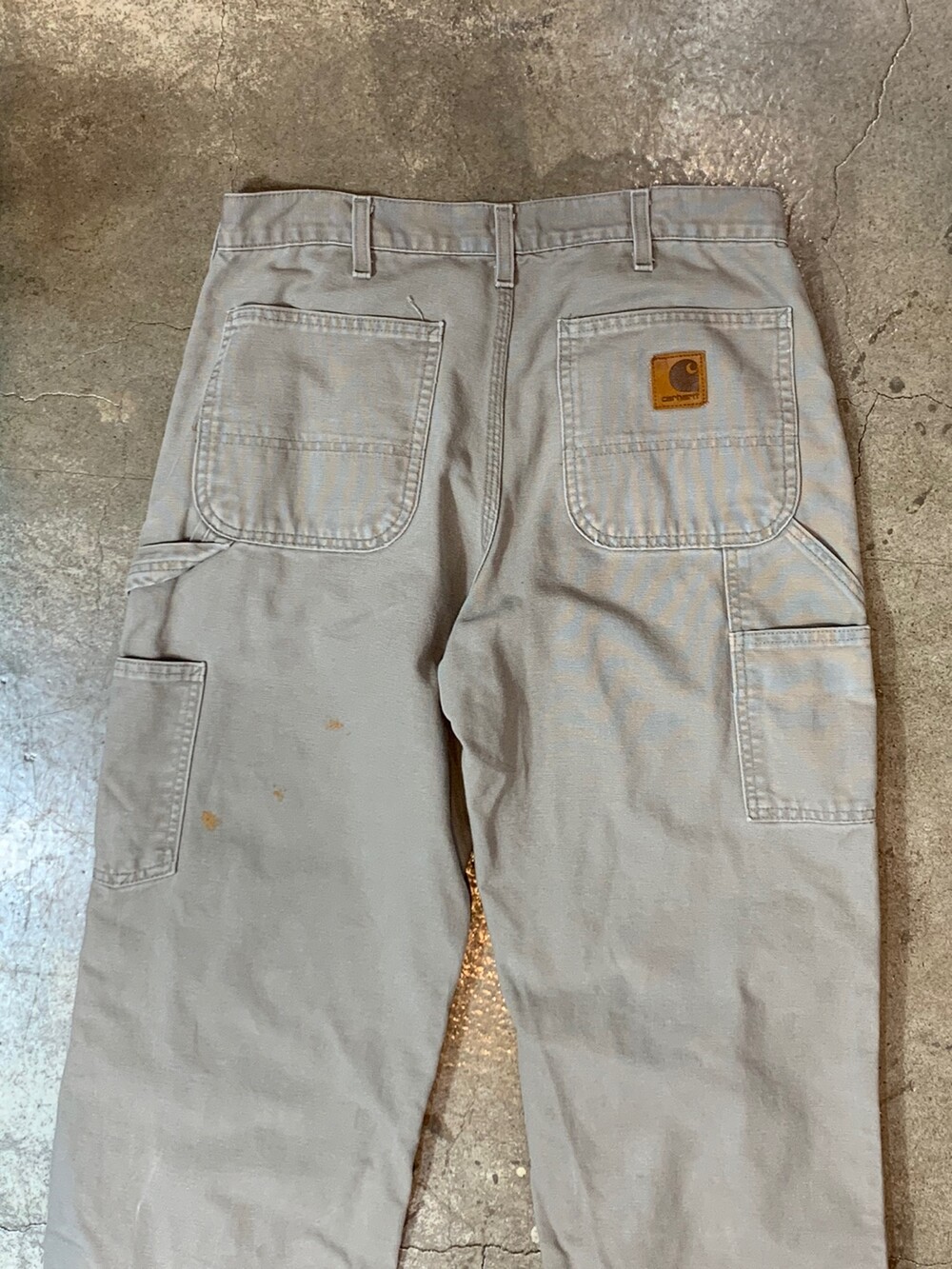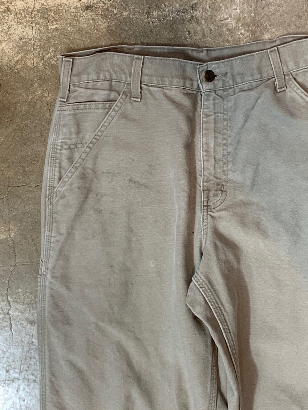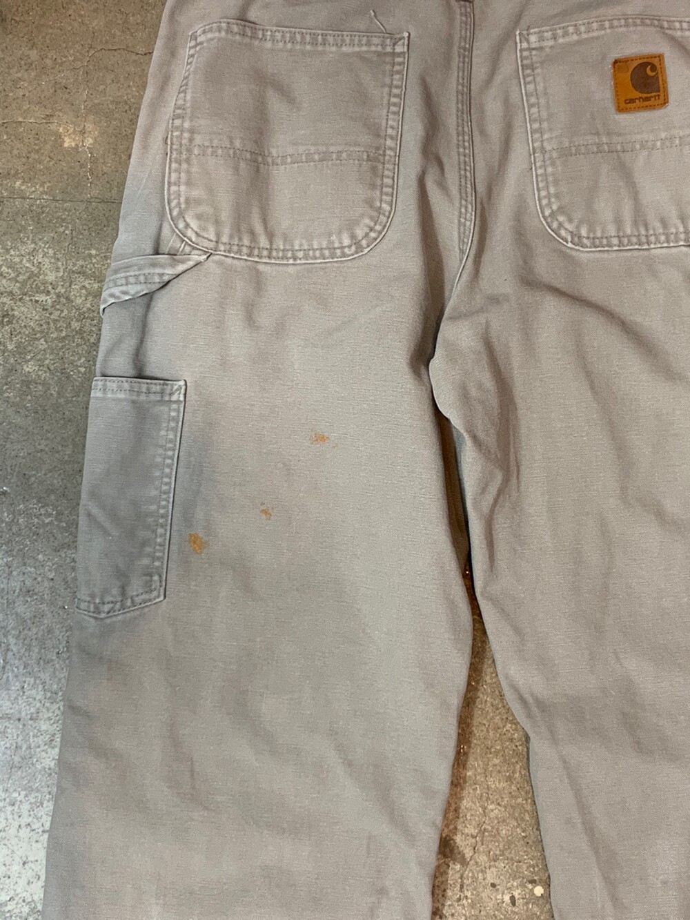 덕캔버스 원단이 적용된 2002년 2월 멕시코 생산 칼하트의 카펜터 워크팬츠. 뉴트럴한 컬러감이 매력적인 제품입니다.