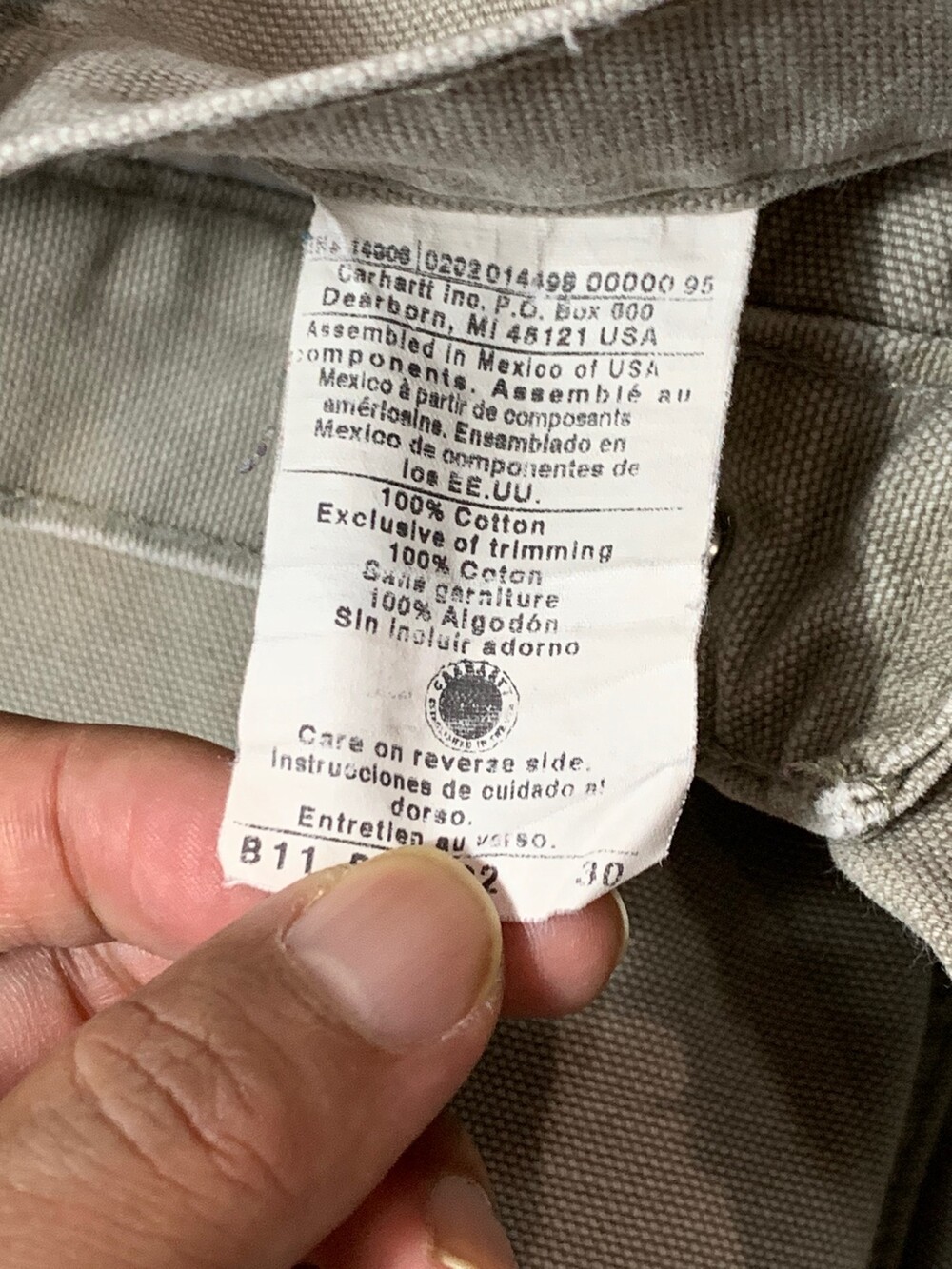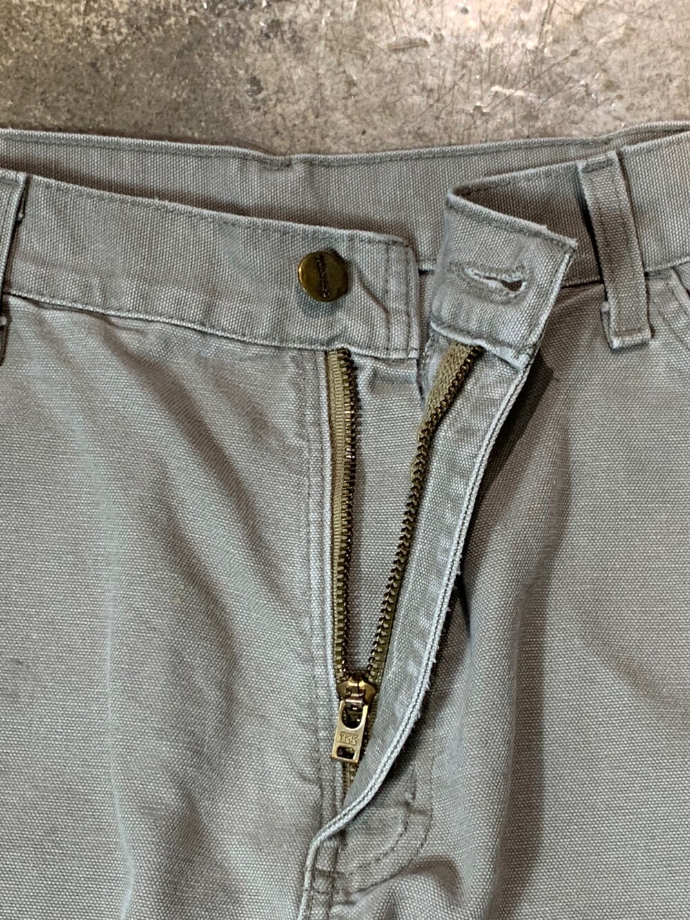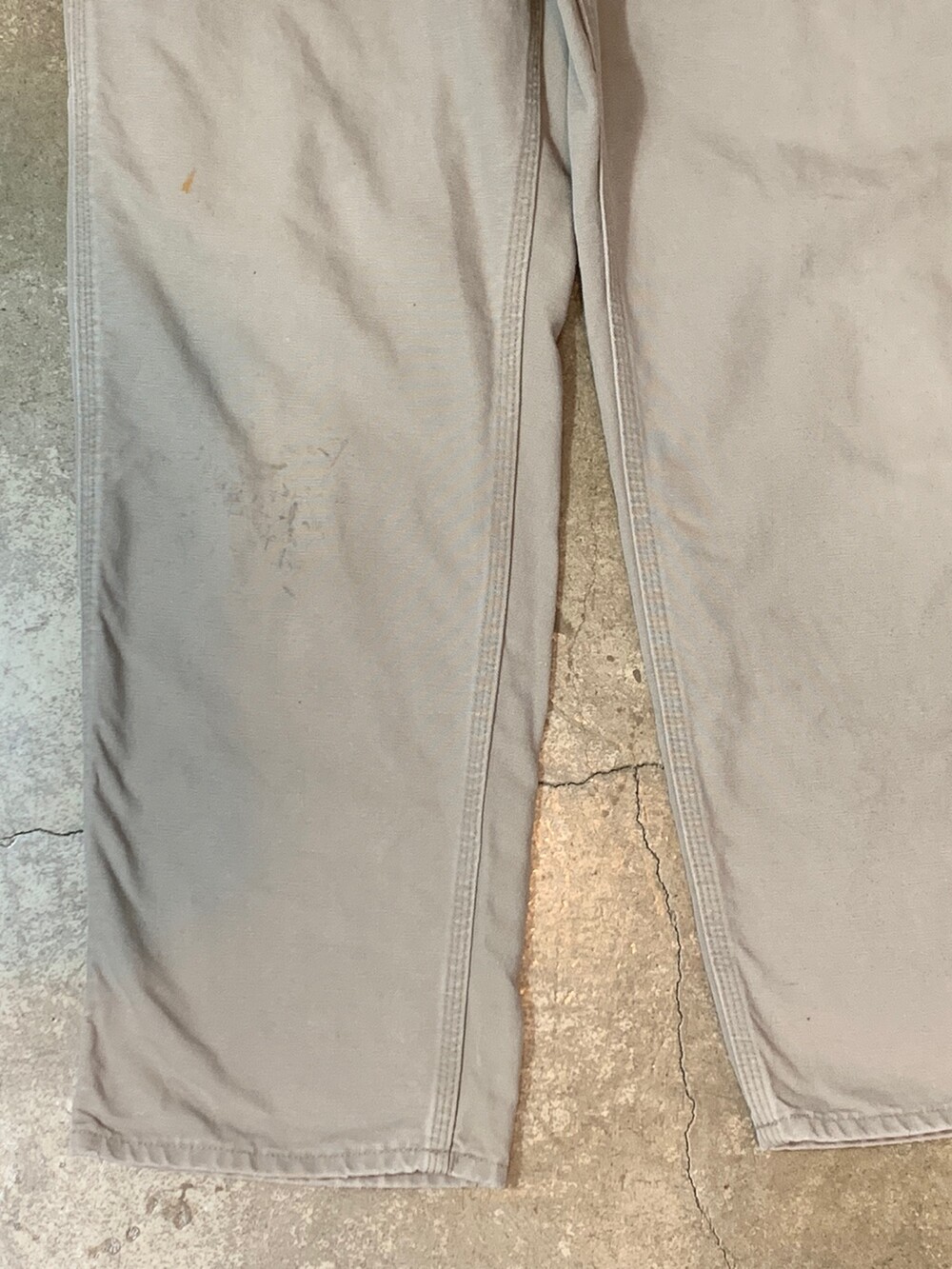 덕캔버스 원단이 적용된 2002년 2월 멕시코 생산 칼하트의 카펜터 워크팬츠. 뉴트럴한 컬러감이 매력적인 제품입니다.