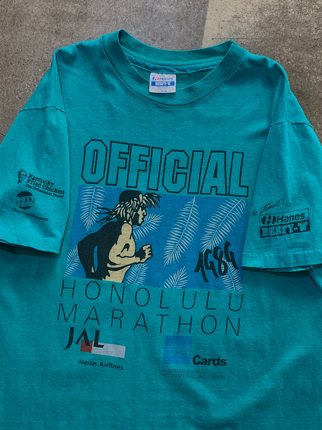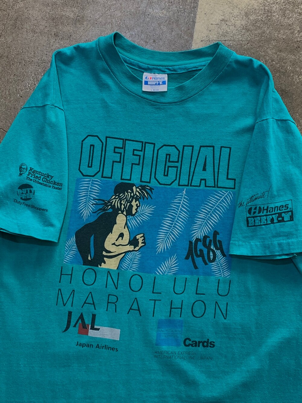 🚩Detail 1973년부터 시작해서 매년마다 개최되는 미국의 유서깊은 마라톤 대회 호놀룰루 마라톤(Honolulu Marathon) 관련 굿즈입니다. 대표적인 굿즈인 마라톤 완주자를 위한 피니셔 티셔츠는 아니지만, 1980년대 중후반부터 1990년대 초반까지 피니셔 티셔츠 바디가 헤인즈 티셔츠였다는 점에서 오피셜이라 프린팅된 티셔츠가 아주 허무맹랑한 건 아닌 듯합니다. 전면에는 메인 마라톤 프린팅과 스폰서가 자리잡은 전형적인 마라톤 굿즈라면, 소매에 있는 KFC와 듀티 프리, 그리고 지금까지도 궁극의 언더웨어를 추구하는 헤인즈의 BEEFY-T 로고 프링팅이 독특힌 제품입니다.