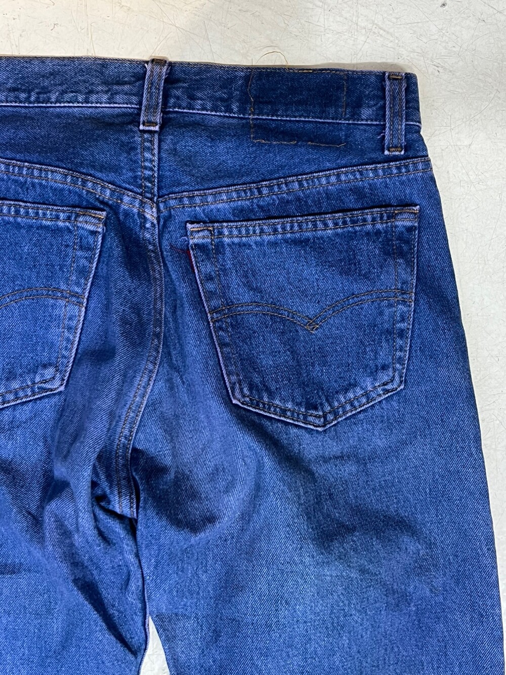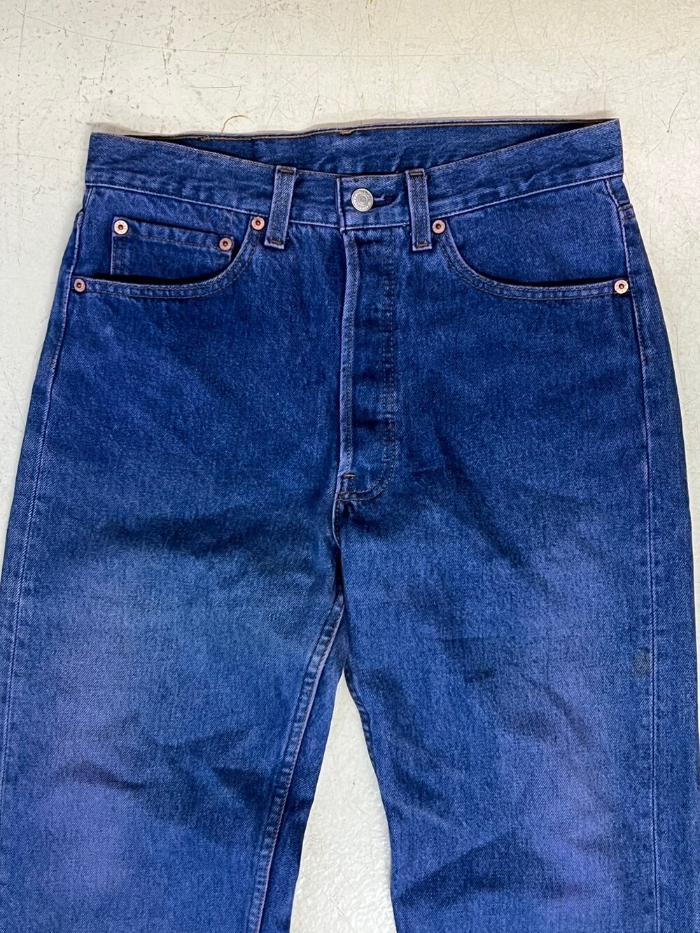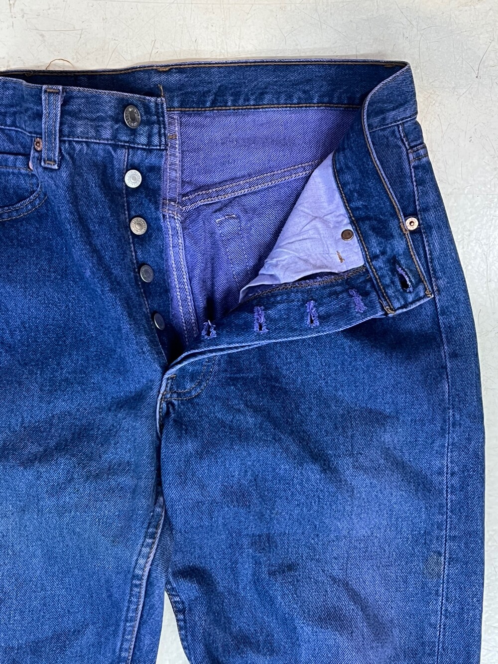 이전 사용자에 의해 염색 과정을 거친 리바이스 501 데님팬츠입니다. 1993년 2월 미국 생산 제품으로, 밑단 수선을 거치지 않은 긴 기장감의 501 특유의 느슨한 실루엣을 즐길 수 있는 제품입니다.