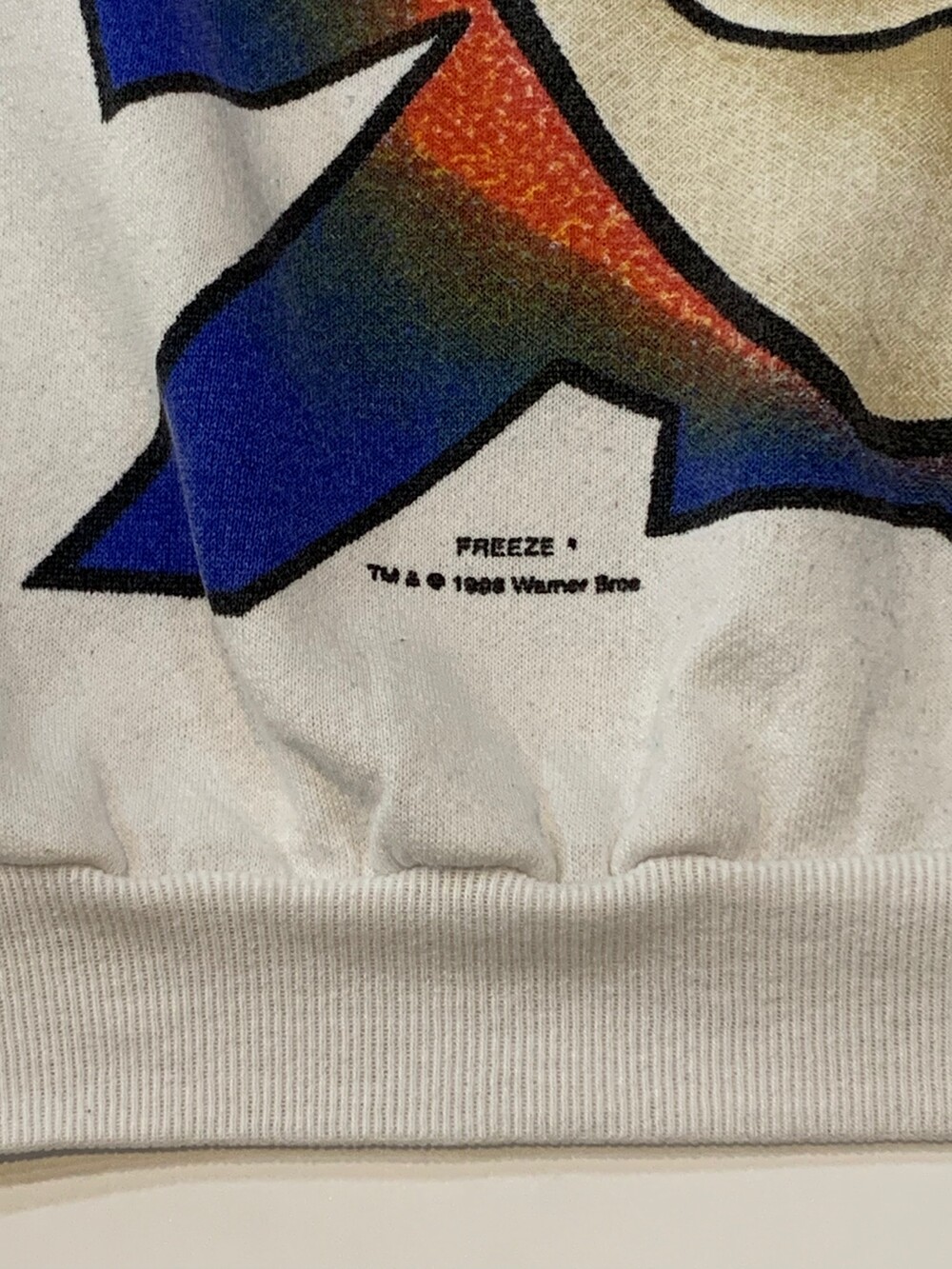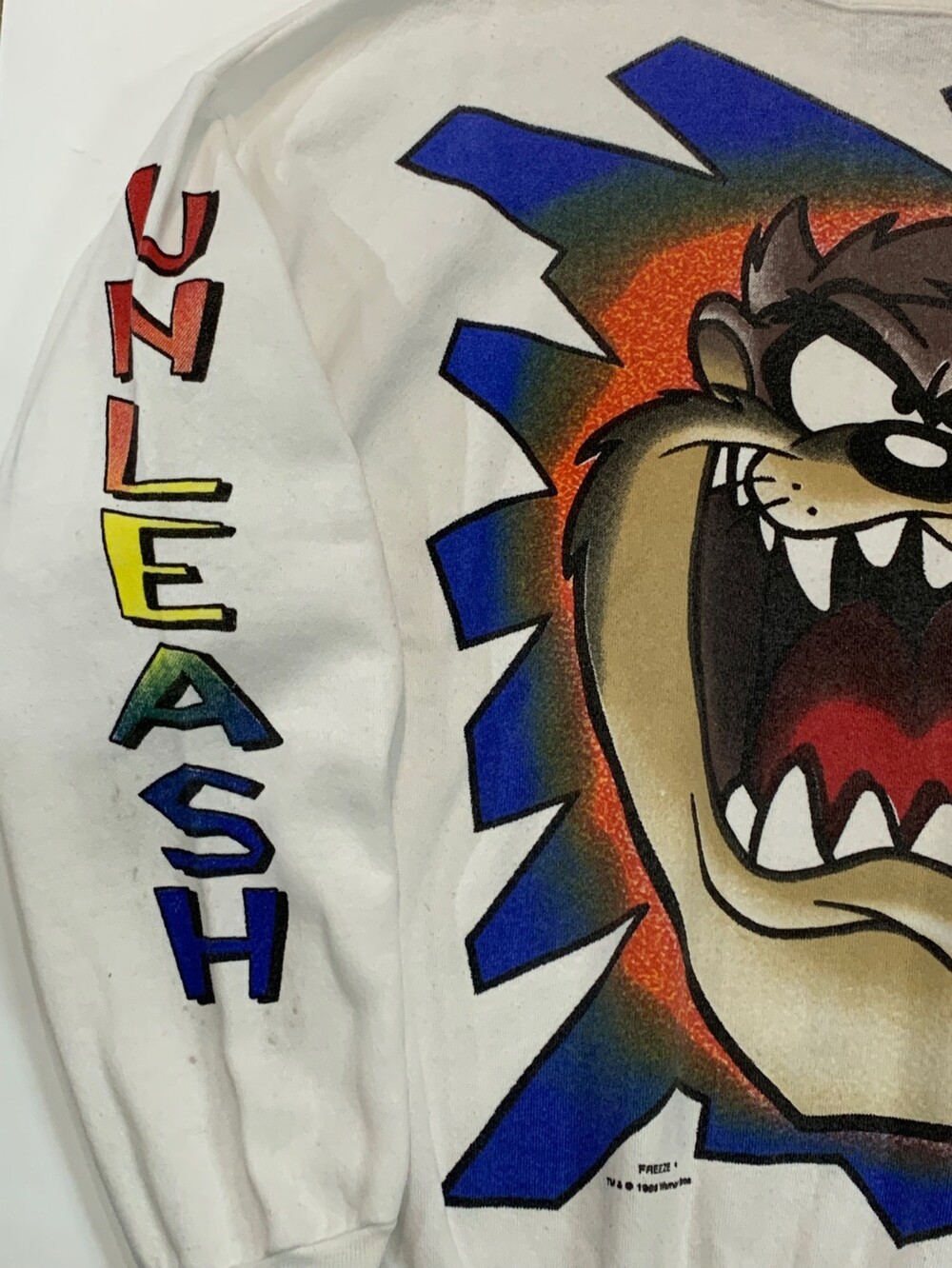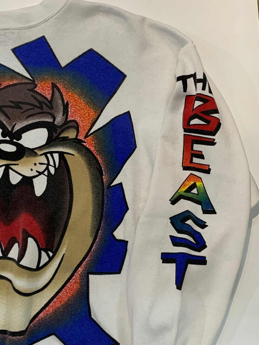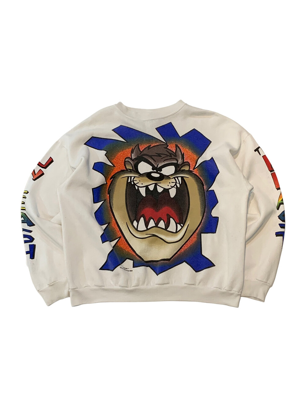 워너 브라더스 에서 제작한 애니메이션 시리즈 루니 툰즈(Looney Tunes) 에 등장하는 캐릭터 태즈 프린팅이 큼지막하게 올려진 튜블러 타입의 스웻셔츠. 소매에도 각각 UNLEASH THE BEAST 프린팅이 올려져 맥시멀한 프린팅 배치와 드랍숄더 타입의 패턴 조합이 잘 어울리는 제품입니다. 딱 맞게 착용하기보다는 오버사이징하기를 권장드립니다.