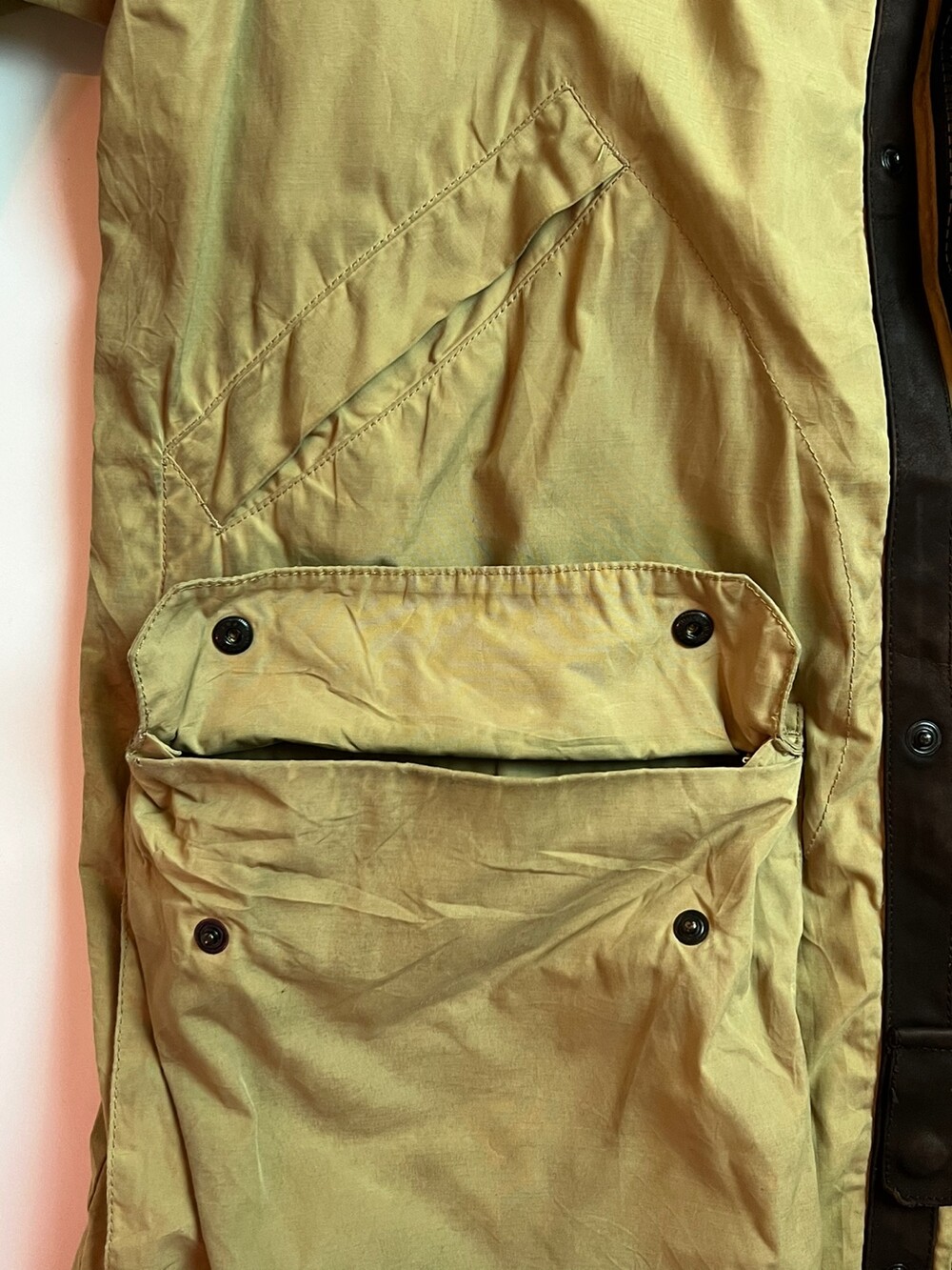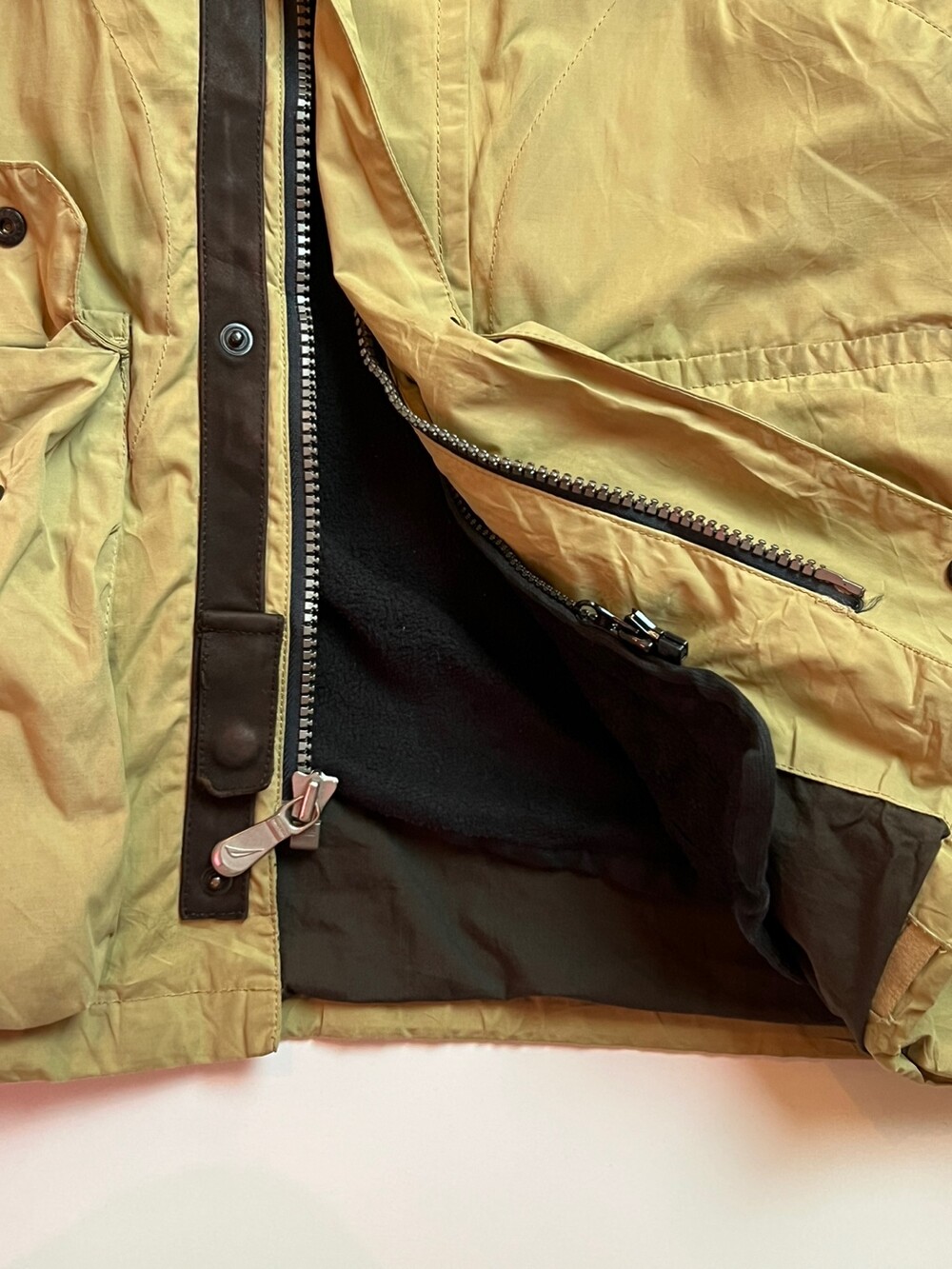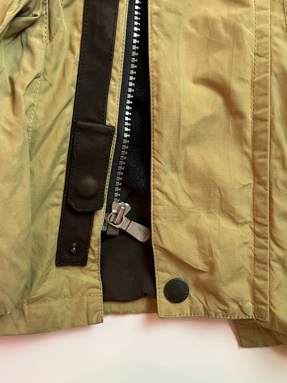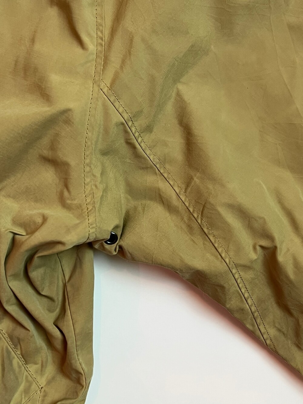 🚩Detail 물을 뿌렸을 때 물방울이 맺히는 것으로 보아 약간의 발수 기능을 갖춘, 옛 마운틴 파카에서 흔히 볼 수 있는 혼용률인 폴리60/코튼40 원단의 기능성과 왁스드 코튼(Waxed Cotton) 특유의 질감을 구현하기 위한 목적으로 이러한 혼방 원단을 아웃쉘로 사용한 것이 아닌가 싶습니다.