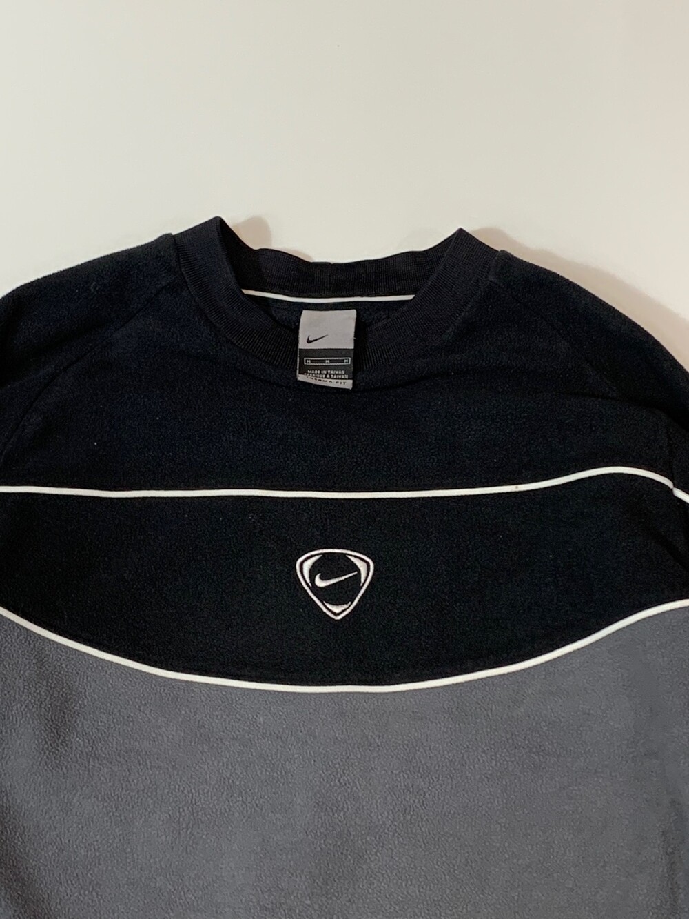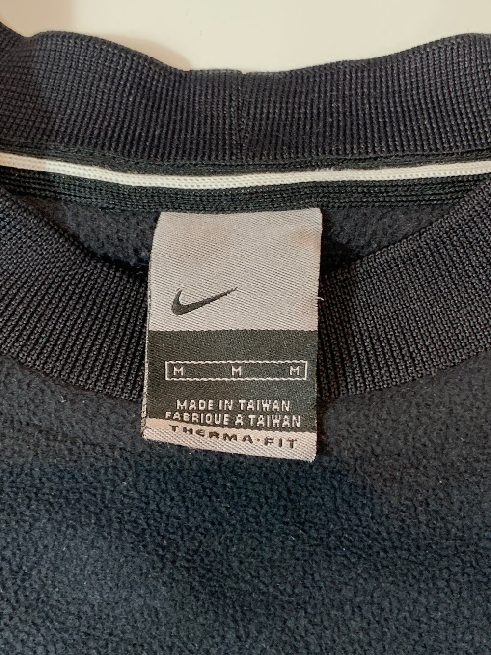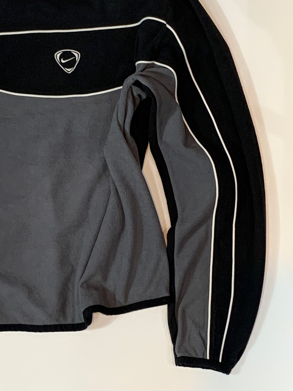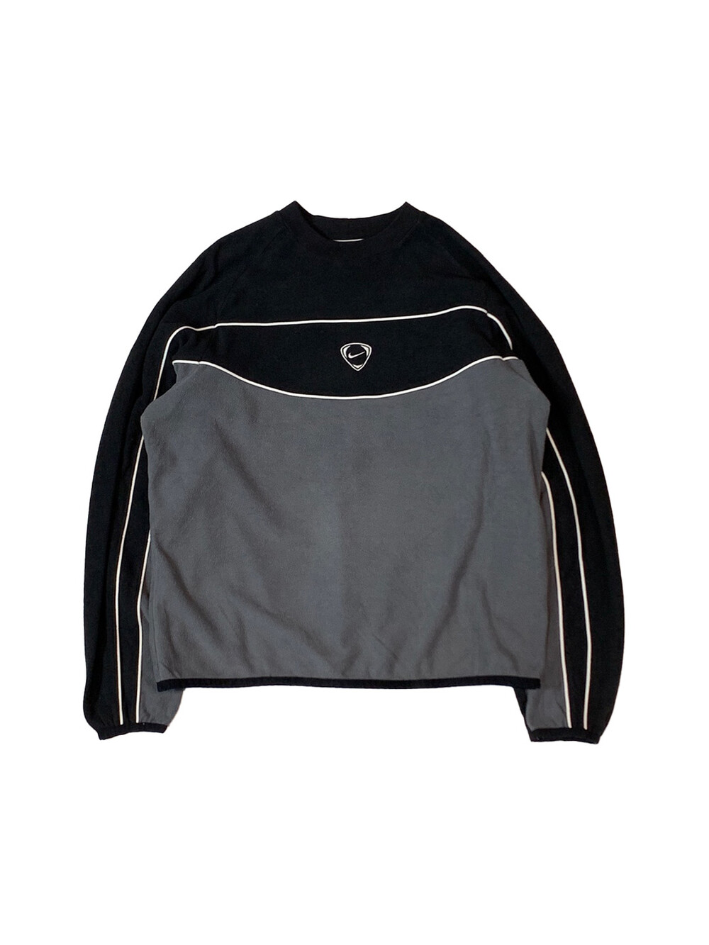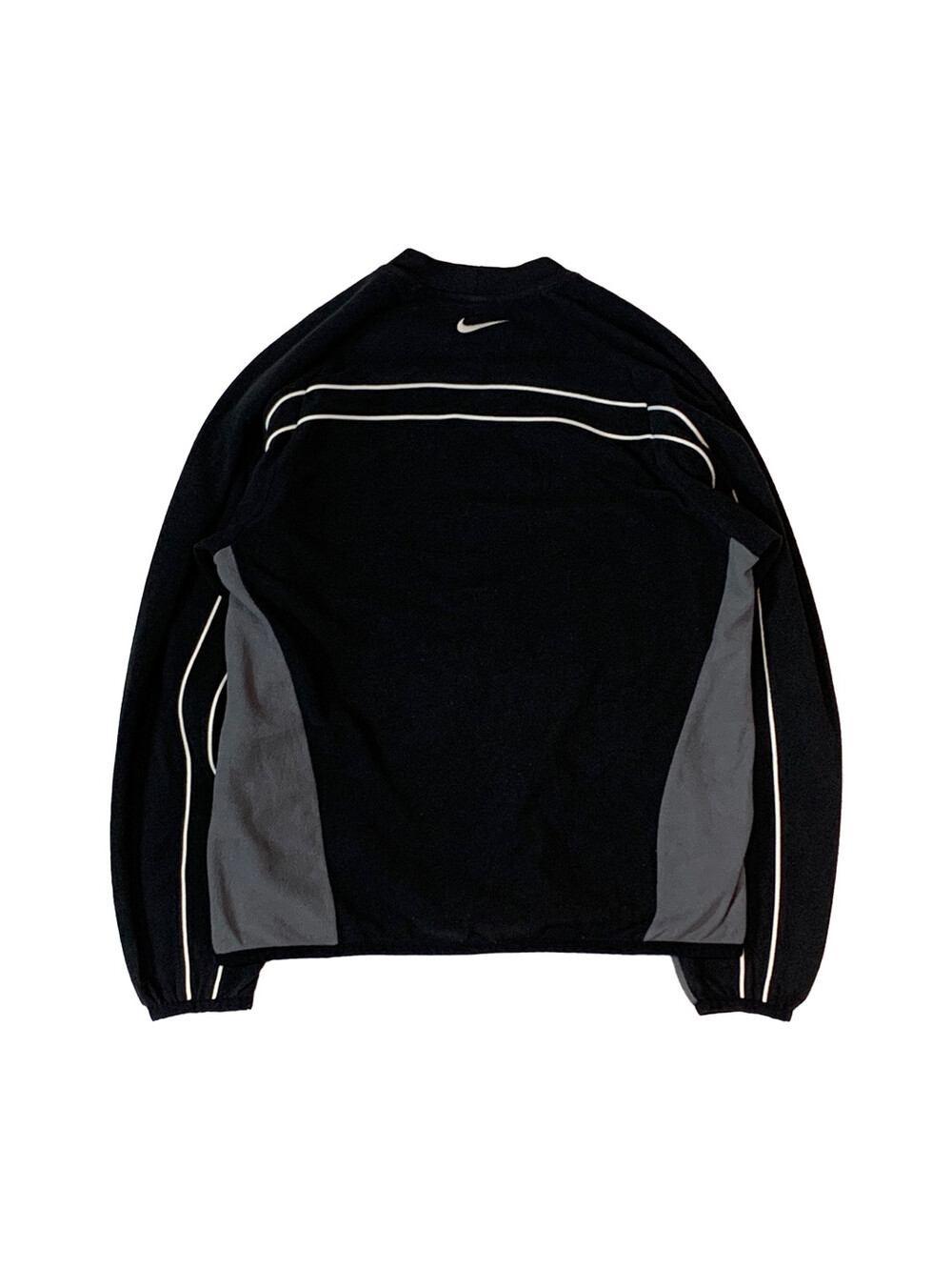 2000년대 초반 나이키 풋볼 라인에서 주로 볼 수 있던 역삼각형 피크 모양 센터 로고가 자수로 놓여진, 나이키 풋볼 동계용 트레이닝 킷 중에서도 이너를 담당했을 THERMA FIT 라인의 플리스 풀오버입니다. 검정색과 회색, 그리고 흰색 파이핑으로 구성된 절개 디테일이 돋보이는 제품입니다.