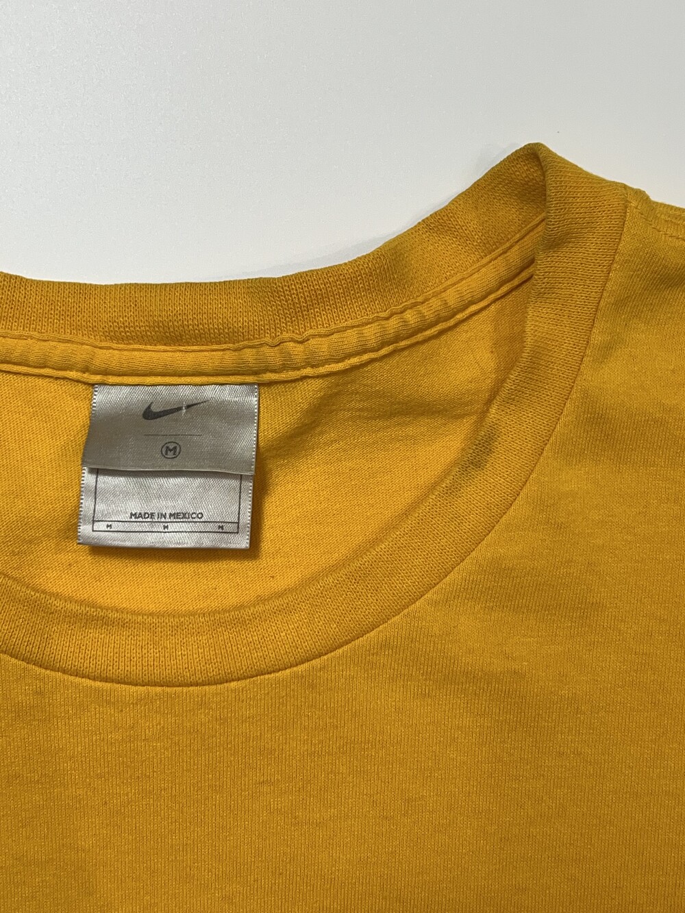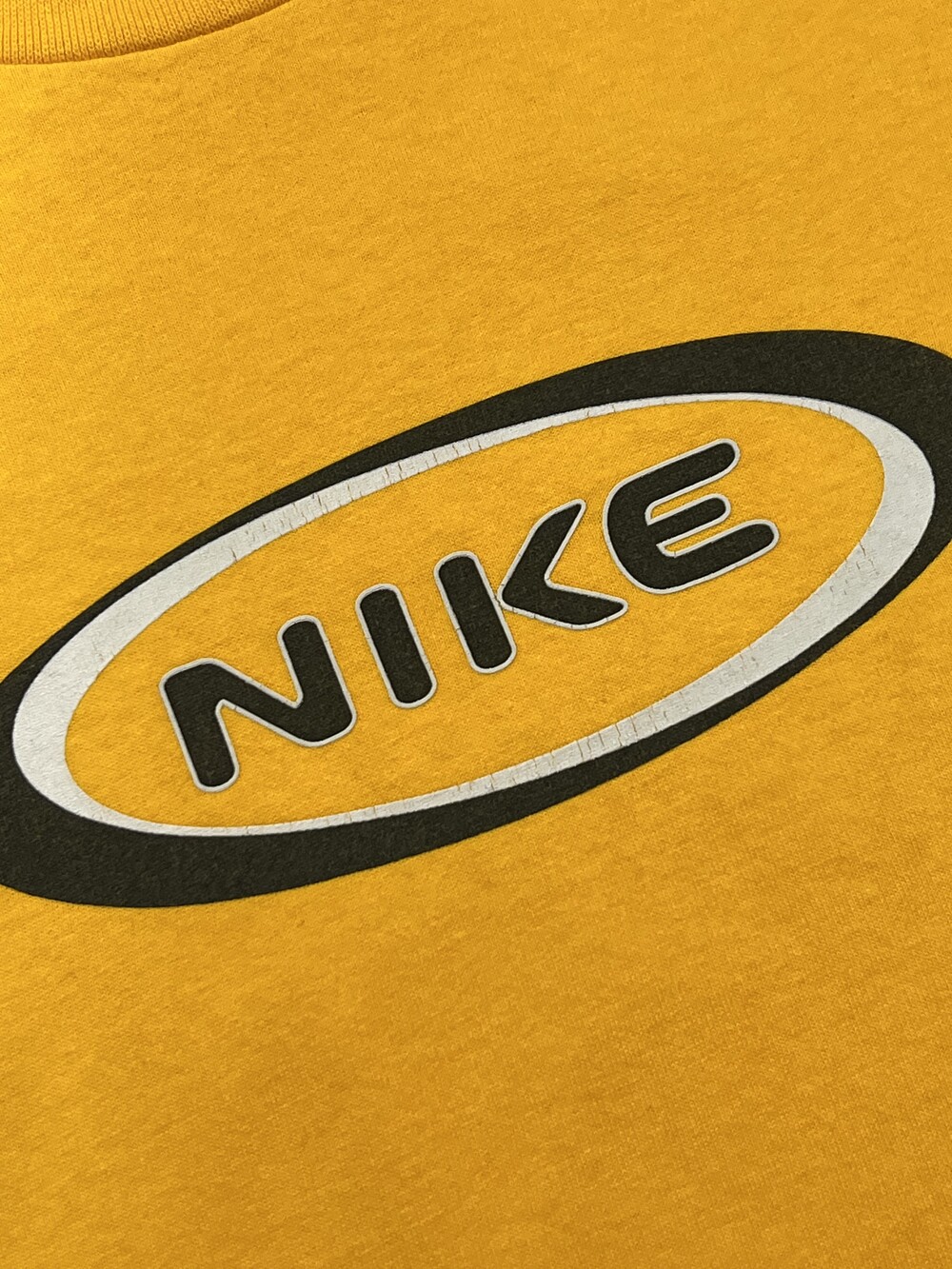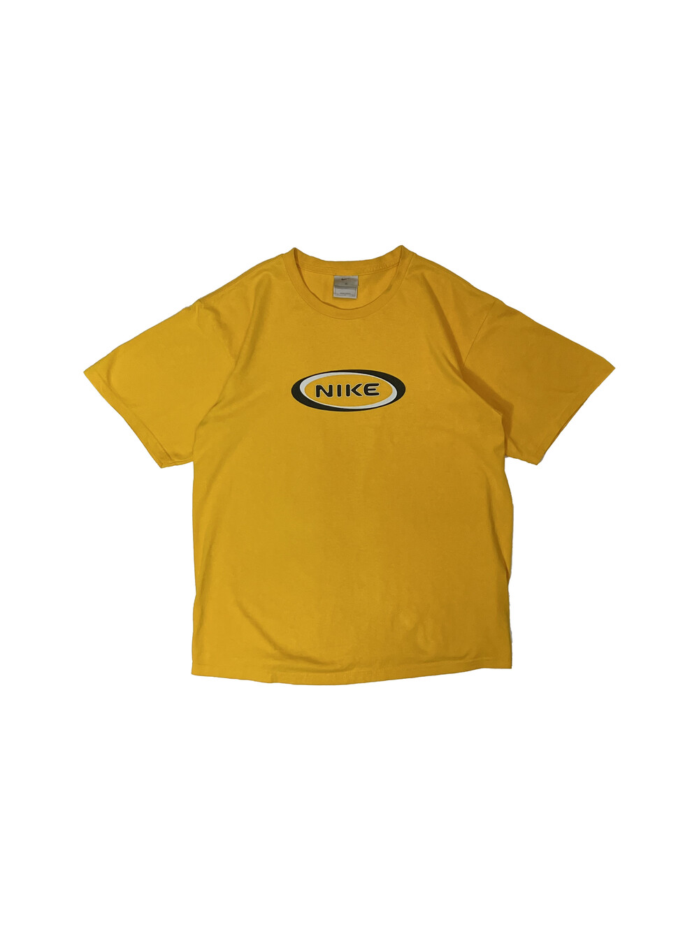표기 대비 넉넉한 사이즈의 2000년대 초반 생산 나이키의 티셔츠입니다. 노란색 바디 위에 타원형 나이키 로고가 프린팅된 제품입니다.