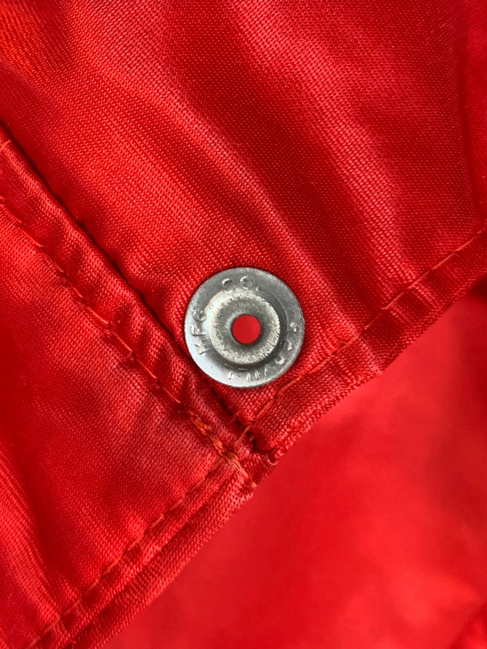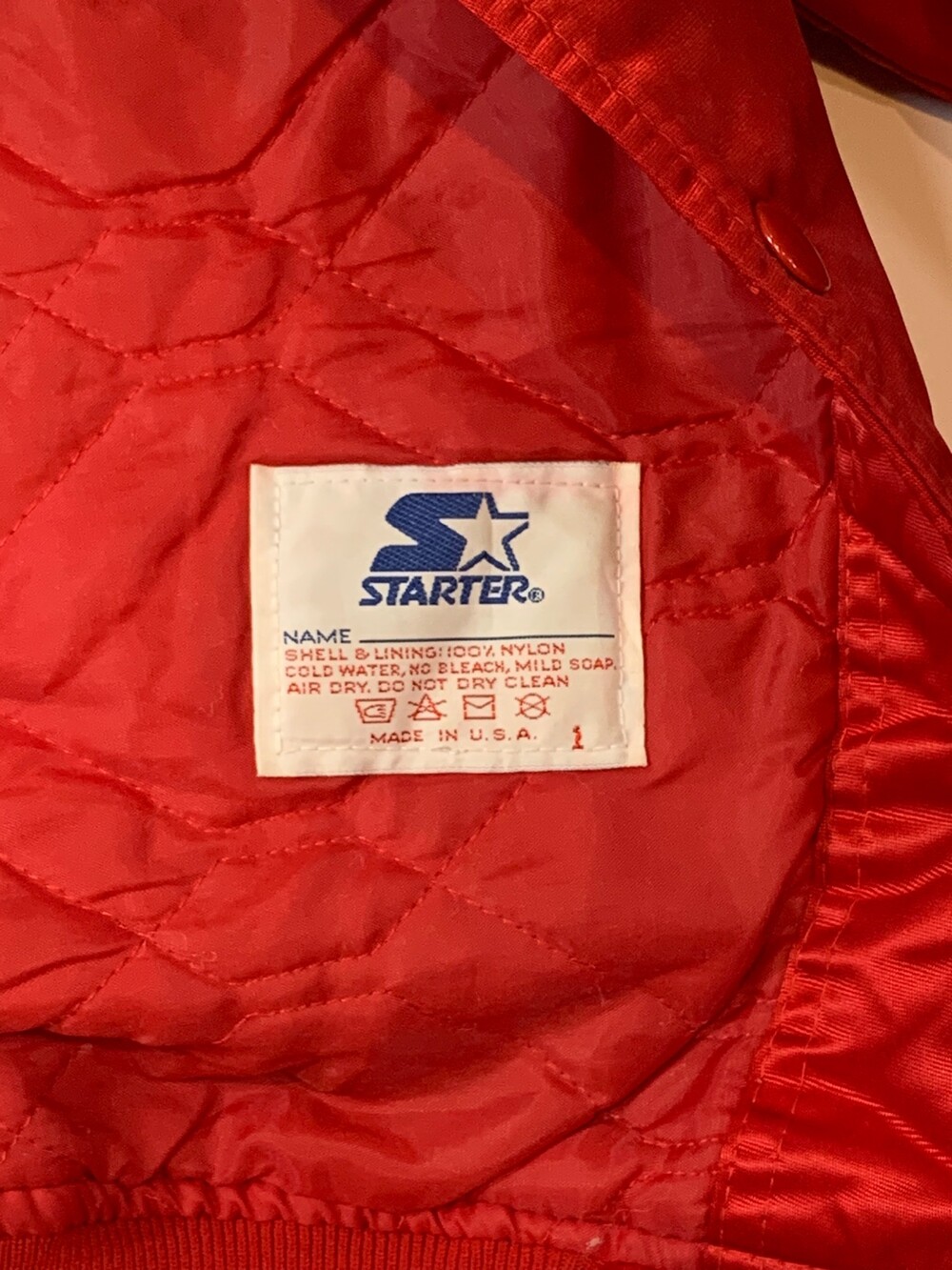 1980년에서 1990년 사이에 생산되었던 스타터 브랜드의 스타디움 자켓입니다. 원단 결이 잘 느껴지지 않을 정도의 고밀도의 나일론 원단이 사용되었으며, 군 납품용으로 종종 볼 수 잇는 스코빌 사의 스냅 버튼을 사용했습니다. 넓은 가슴단면과 크롭한 기장감으로 캐주얼하게 착용하기 좋은 제품으로, 미국 프로 미식축구 리그 NLF의 참가팀이자 1980년대 전국구 인기를 자랑하던 샌프란시스코 포티나이너스의 컬러웨이와 패치가 돋보이는 제품입니다. 후면에는 49ERS 스펠아웃 패치가 놓여 있습니다.
