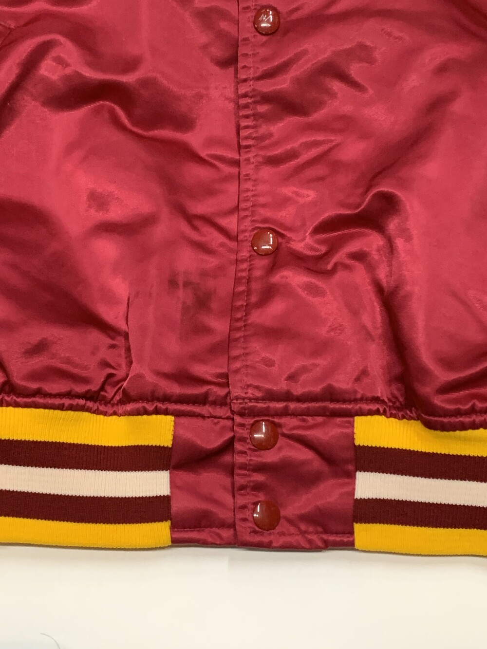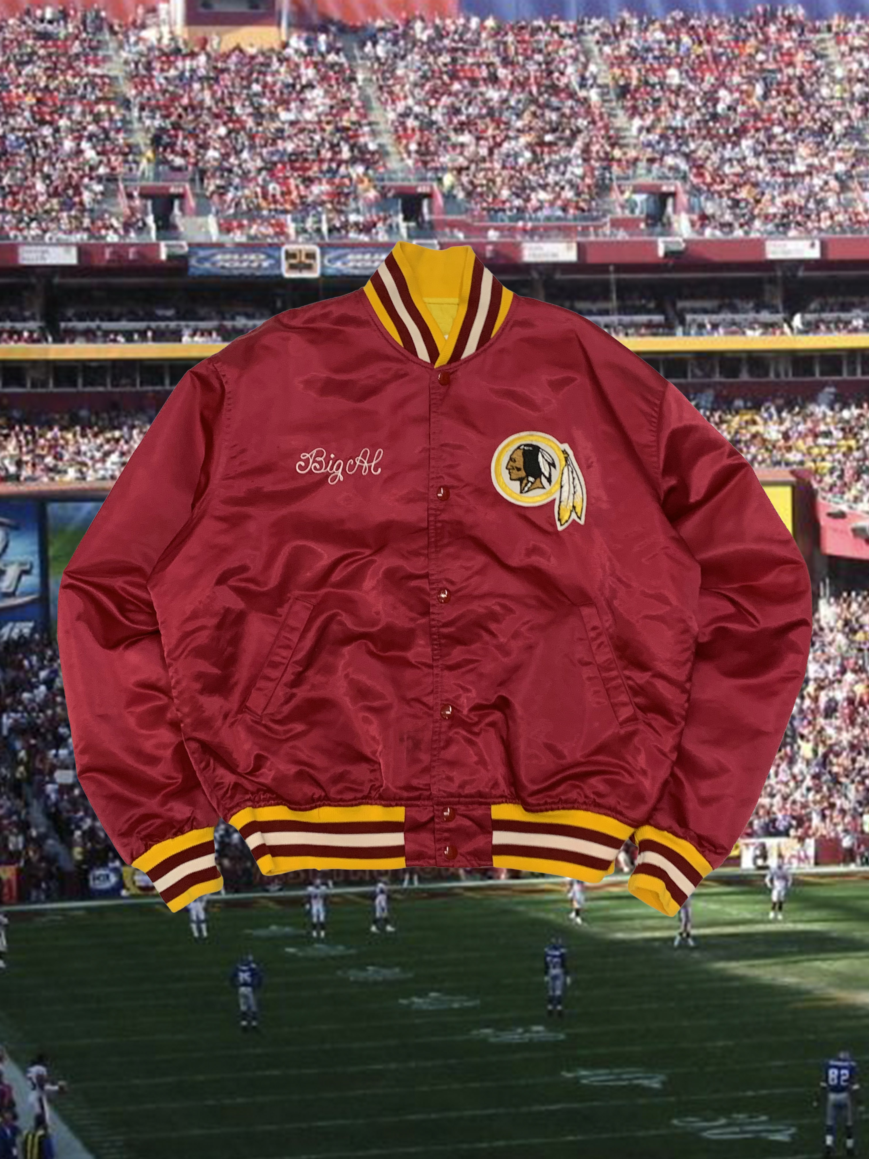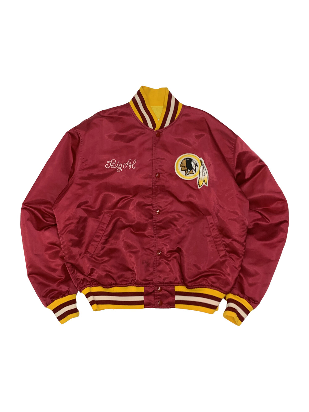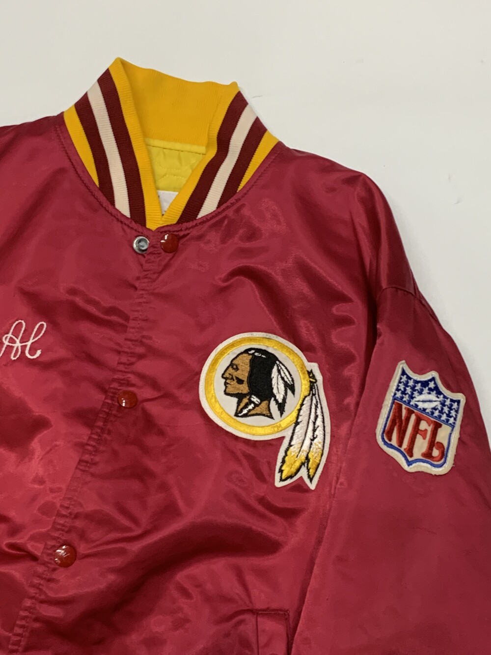 인디언 혹은 그들의 피부색을 가리키는 용어를 프로 및 아마추어 스포츠팀에서 사용하지 않기를 권장하는 사회적인 분위기에 맞춰 워싱턴 커맨더스(Washington Commanders)로 구단명을 변경하기 이전 시기에 생산된, 워싱턴 레드스킨스의 스타디움 자켓입니다.